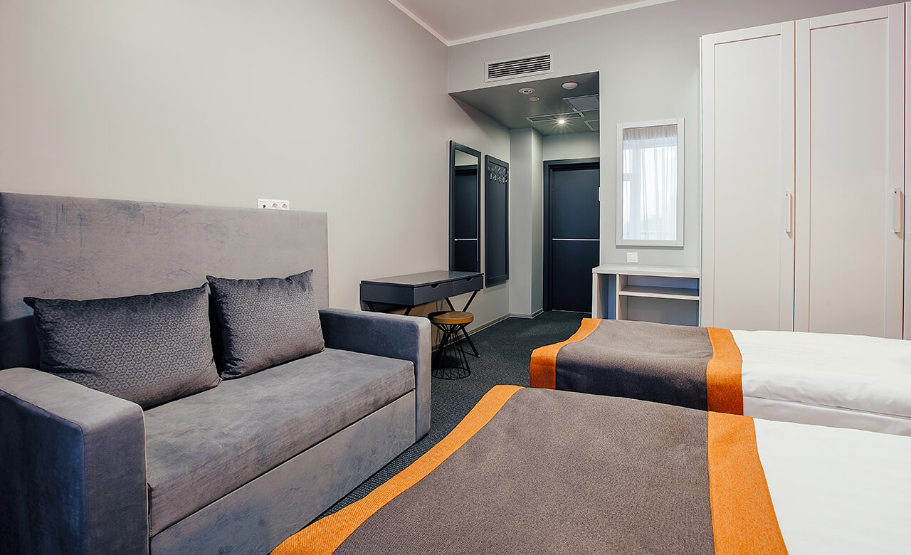 Номер, рассчитанный на проживание от 2 до 3 человек, площадью 22 квадратных метра.