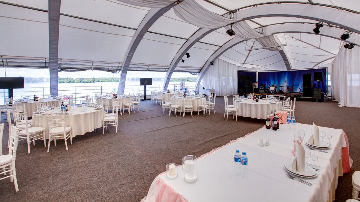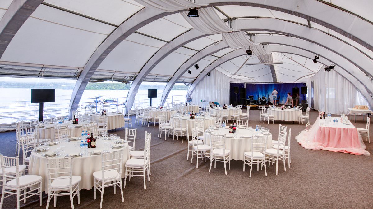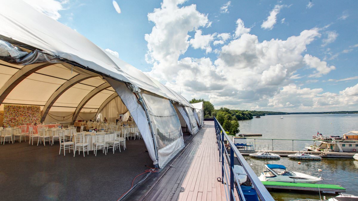 Данная летняя площадка расположена на крыше эллинга. Она имеет площадь 450 кв. метров и отлично подойдет для реализации праздничных и торжественных корпоративных мероприятий, число участников которых может достигать до 250 человек.