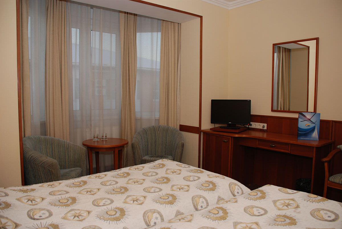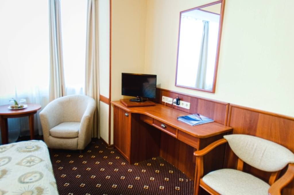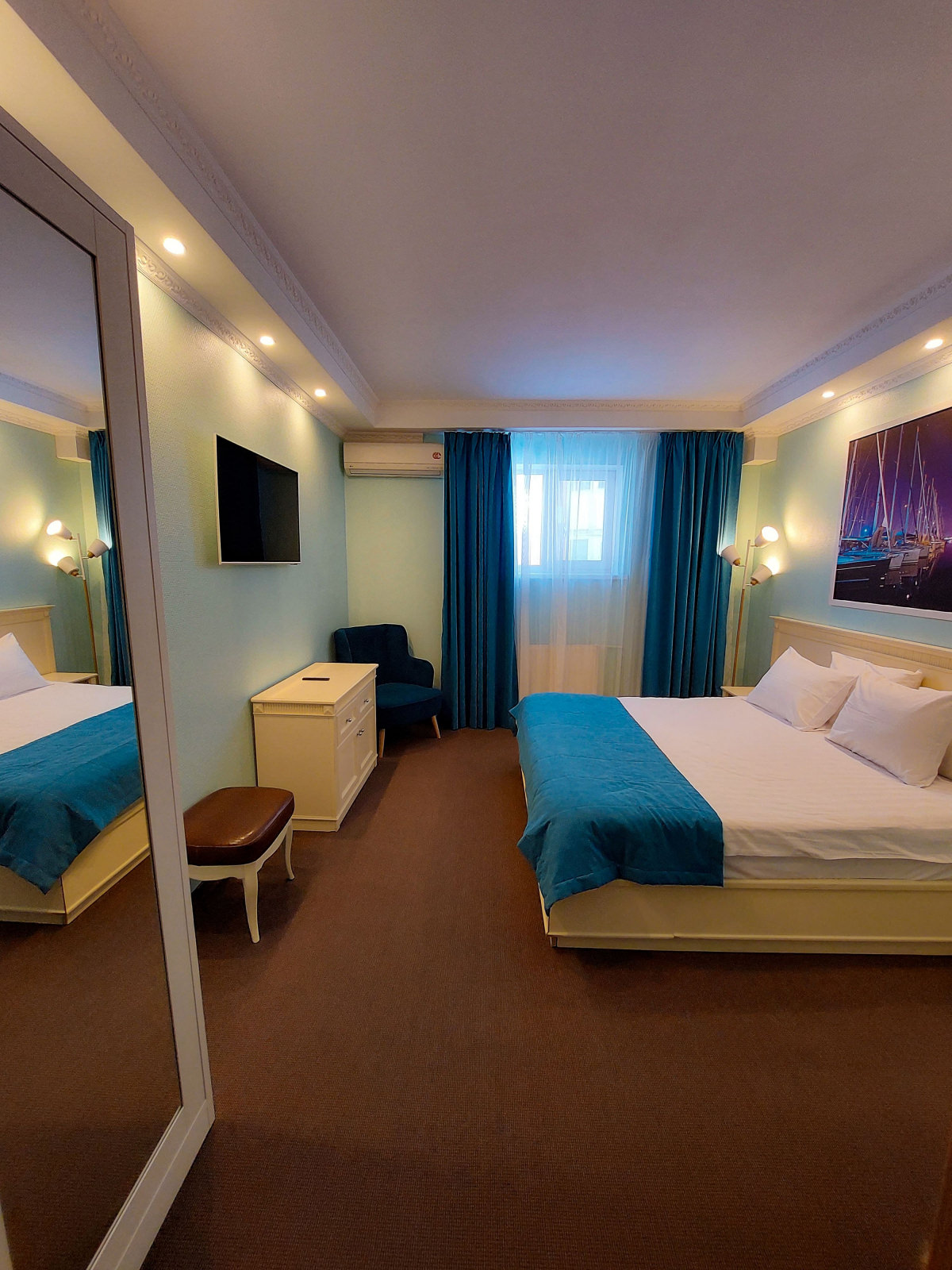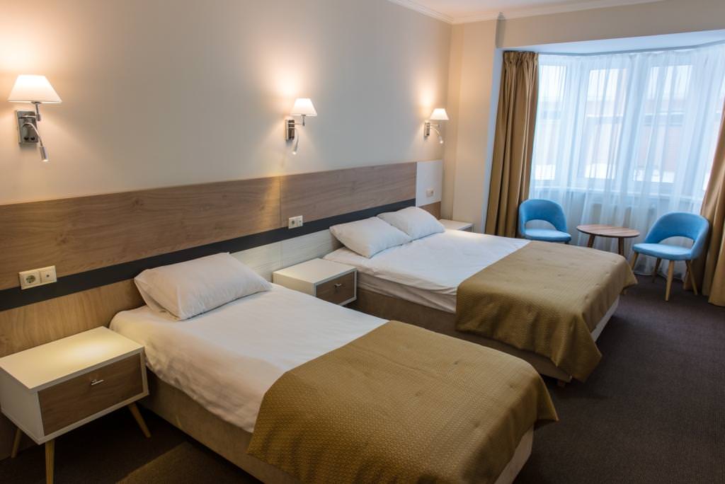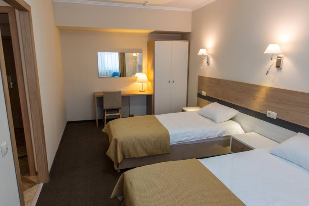 В номере две односпальные кровати, мягкие кресла, шкаф-купе для вещей, письменный стол и другие удобства.