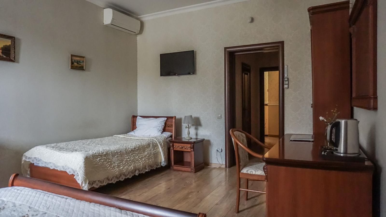 В однокомнатном номере с 2-х спальной и односпальной кроватями могут разместиться на основных местах от 1 до 3 человек.