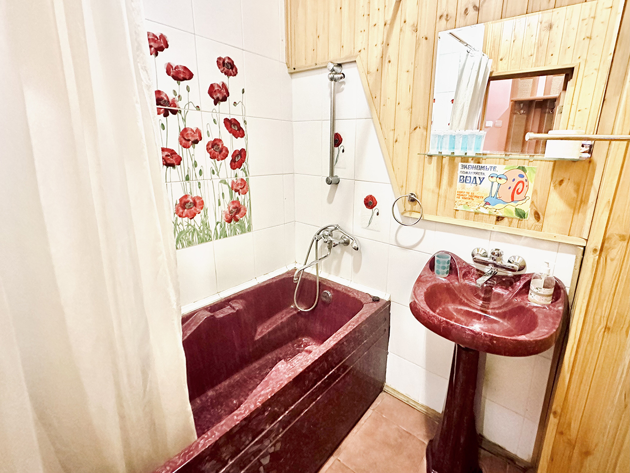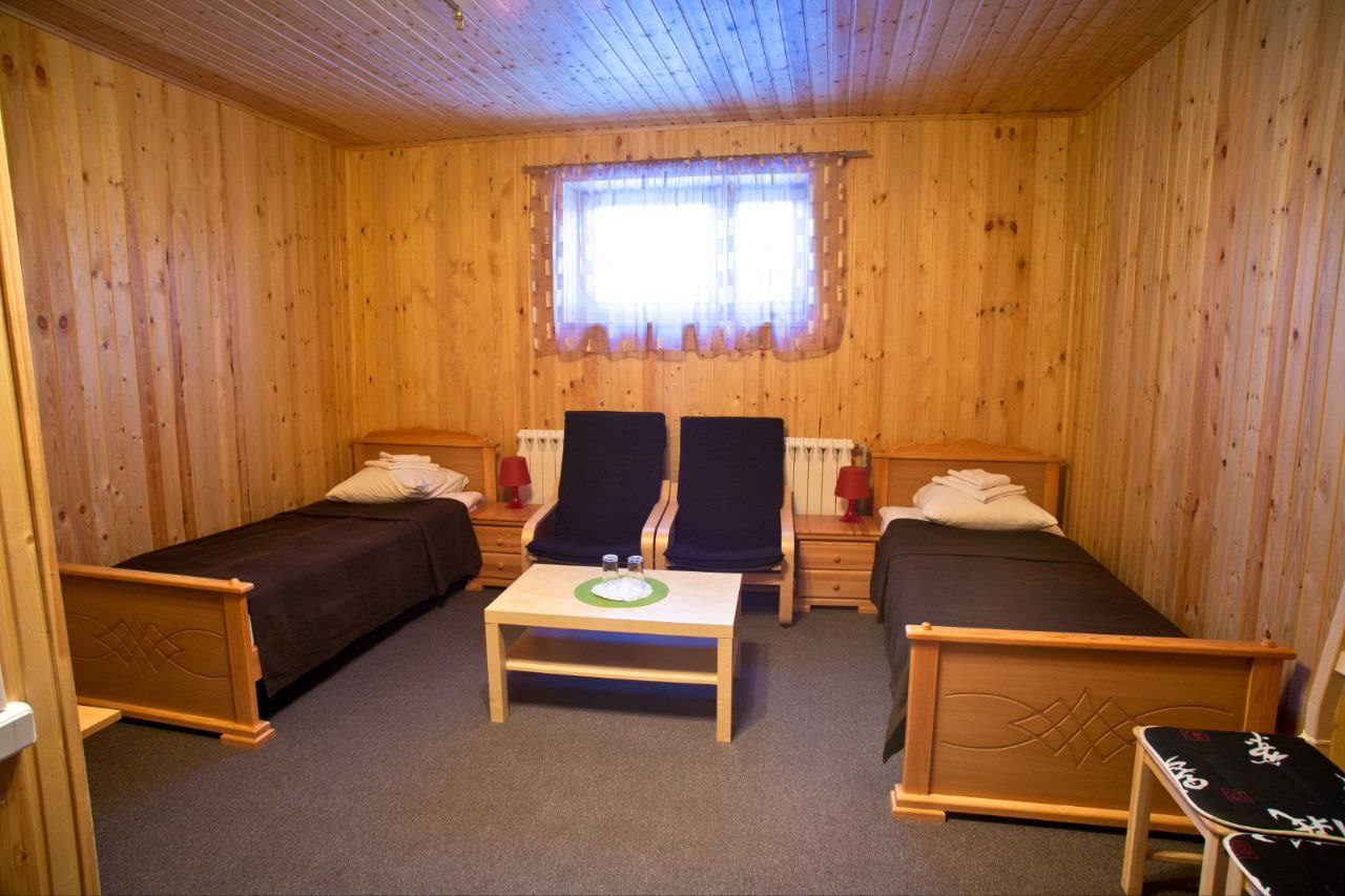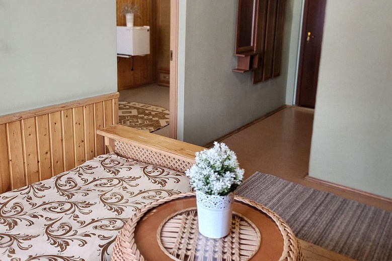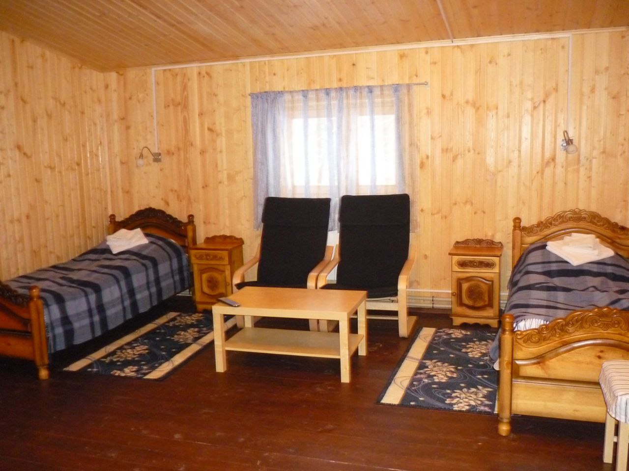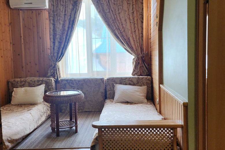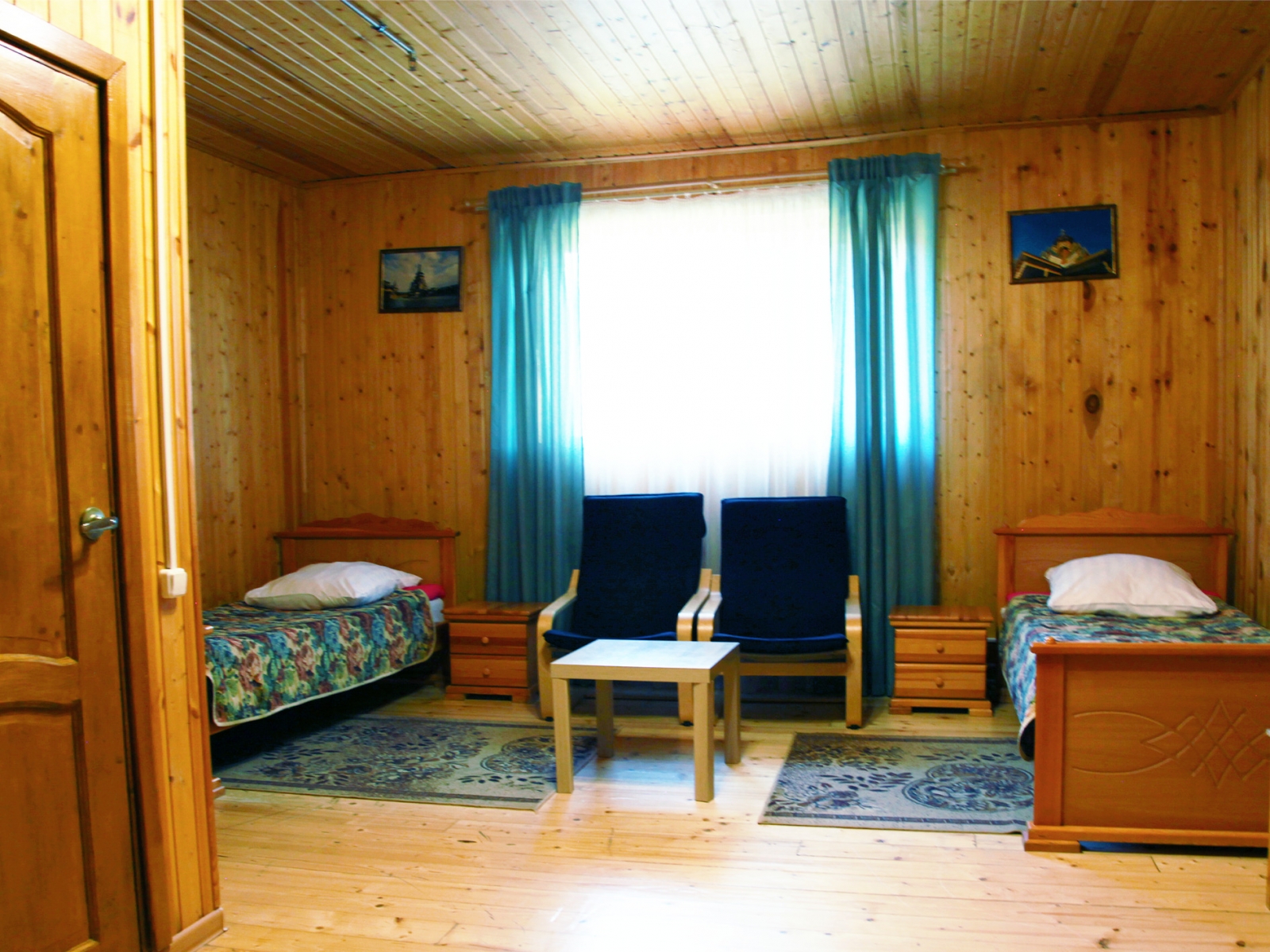 Площадь номера - 18-19 кв.м. 3 осн. места. Мебель: диван раскладной, кровати односпальные, стол, стулья. Оборудование: телевизор, холодильник. Санузел: с душем, туалетные принадлежности. Сервис: смена полотенец, смена постельного белья, уборка номера.