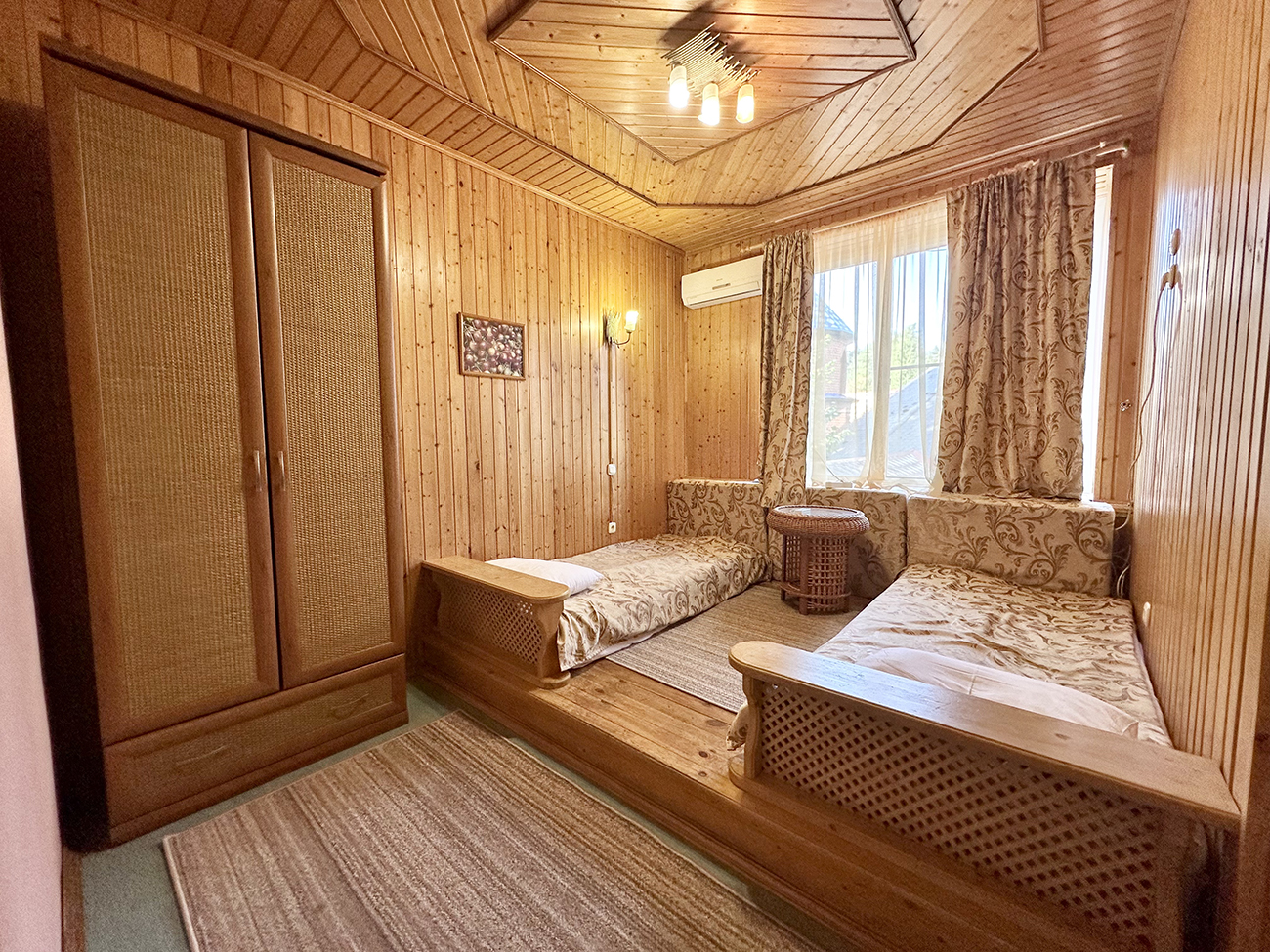 Площадь номера - 200 кв.м. 1 комната. 6 осн. мест. в коттедже: 3 спальни, гостиная с кухонным уголком, 2 санузла, мангал. В номере: телевизор; холодильник; туалет; микроволновая печь; стиральная машина; 2-спальная кровать; 1-спальные кровати; чайник; душевая кабина; плита; посудомоечная машина; кухонный уголок. 4 доп. места: Диван - при размещении 10 человек туристы размещаются на 2-спальных диванах.