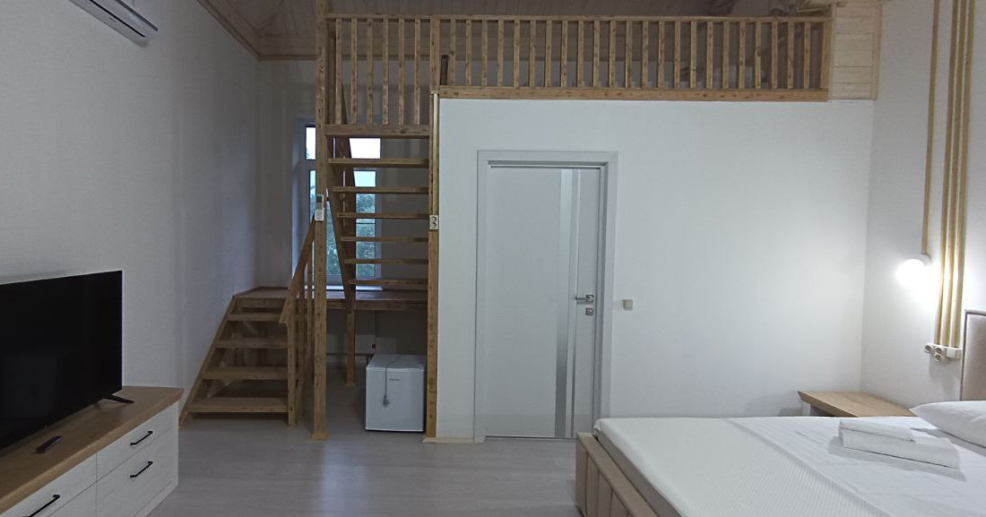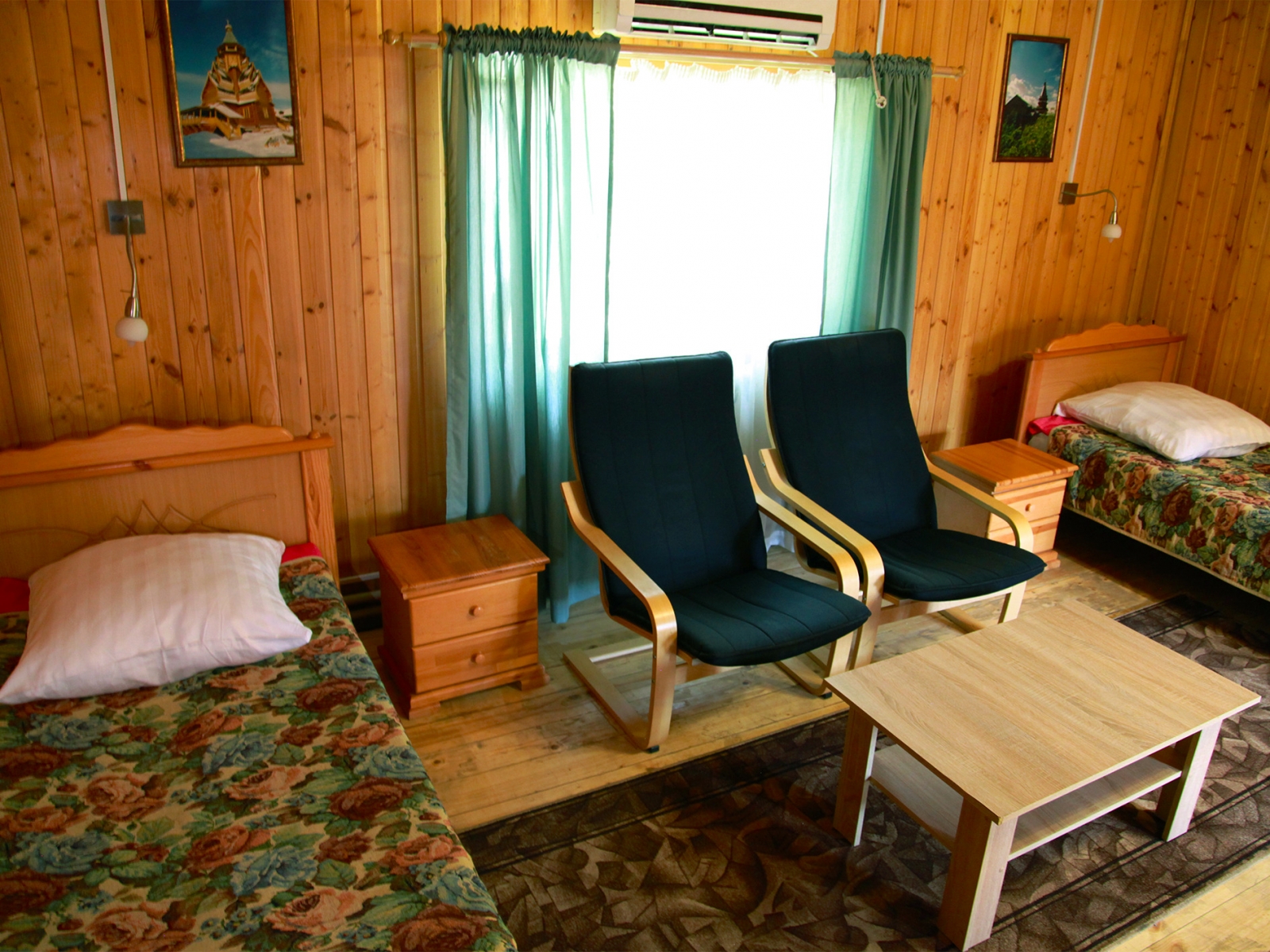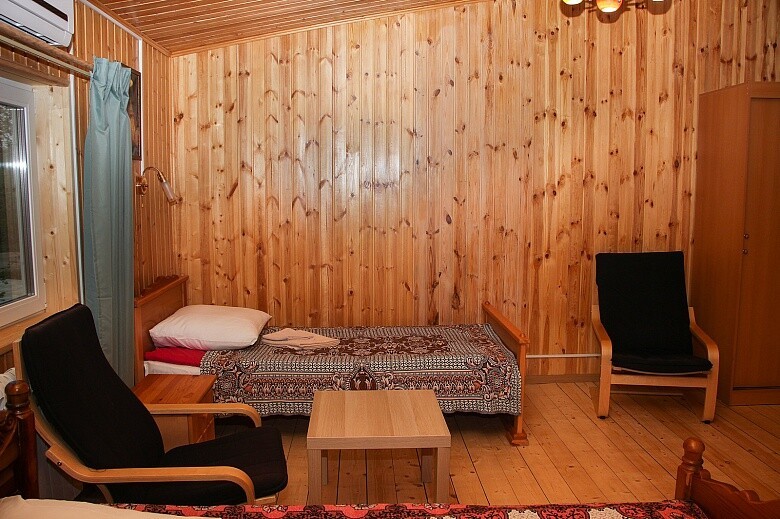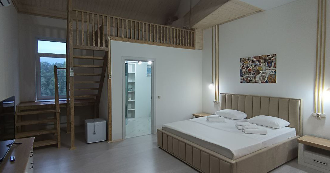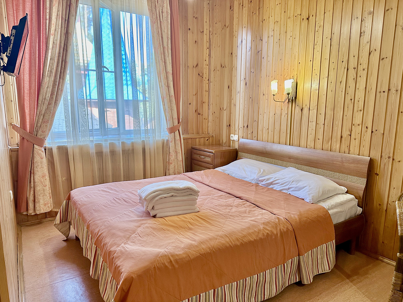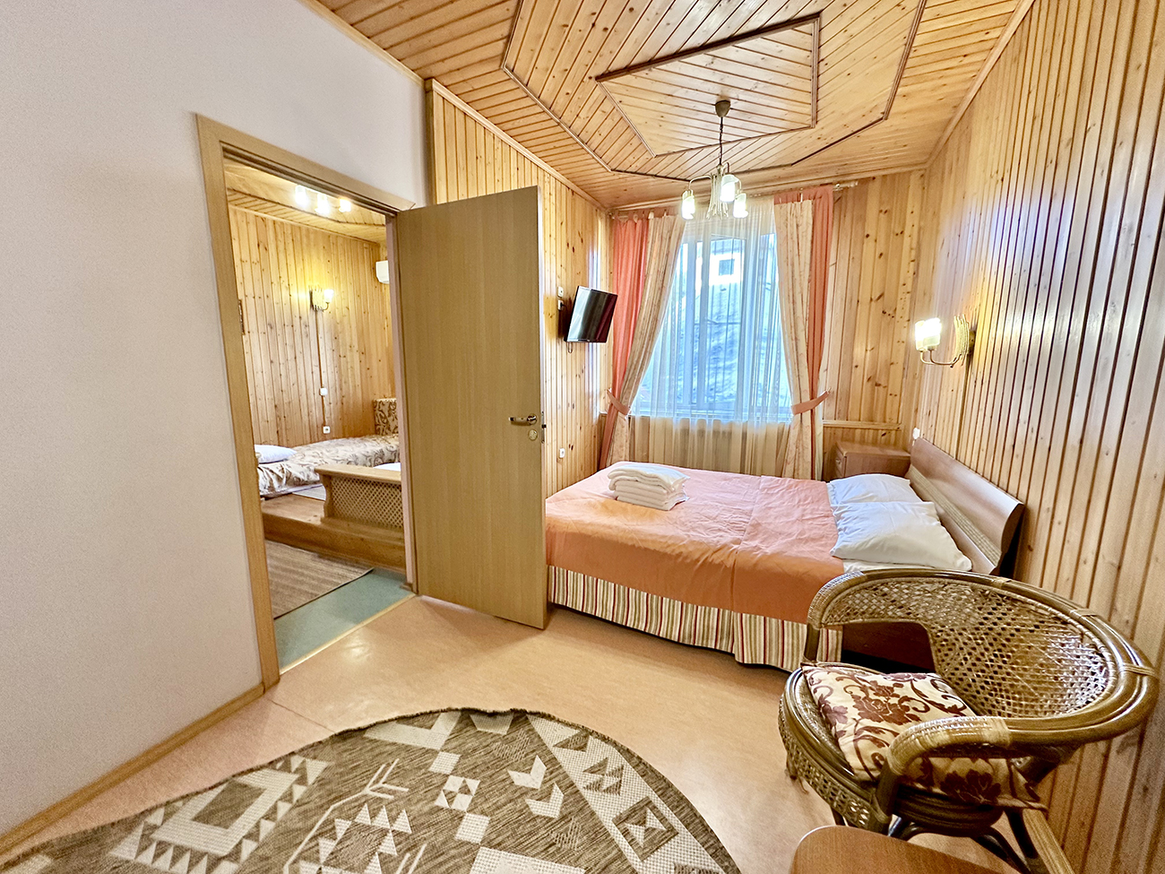 2-х комнатный номер. Они оборудованы всем необходимым: холодильником, двумя телевизорами, есть сейф, фен и ванна. Установлена двуспальная кровать и имеются два спальных места на деревянном подиуме.
