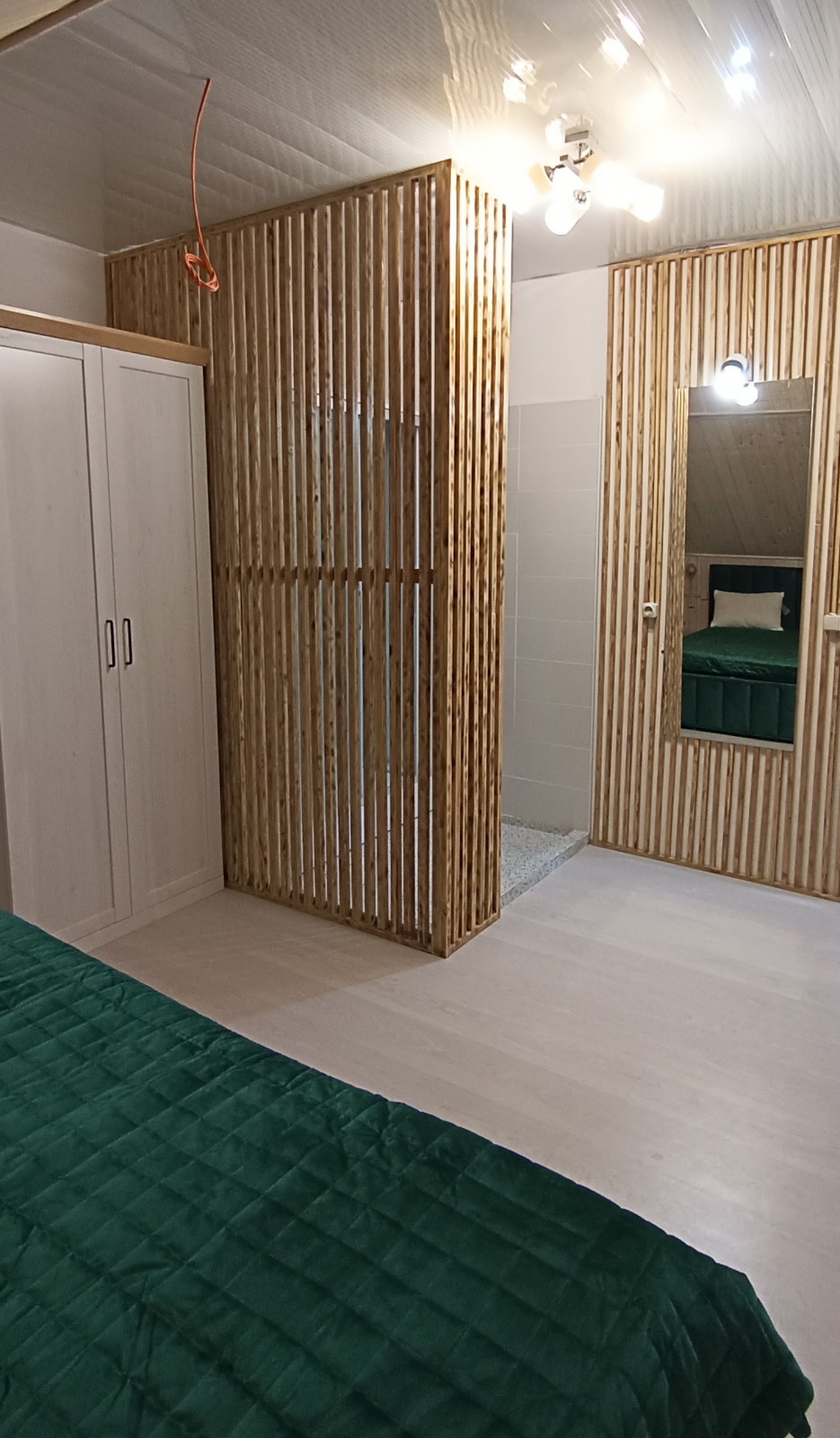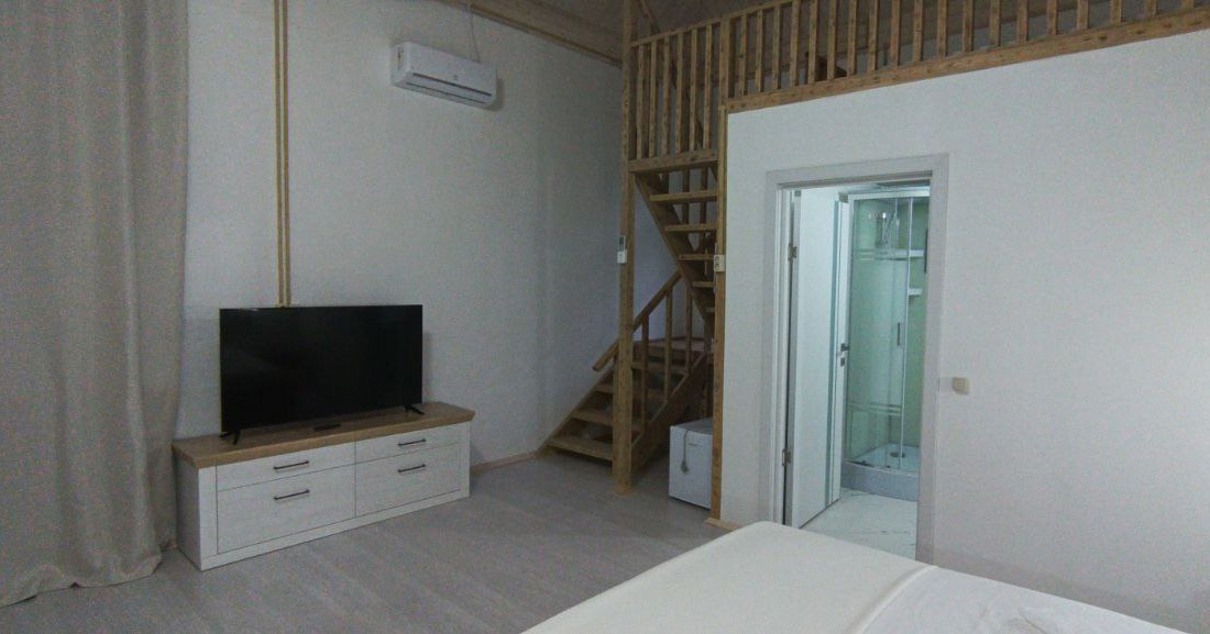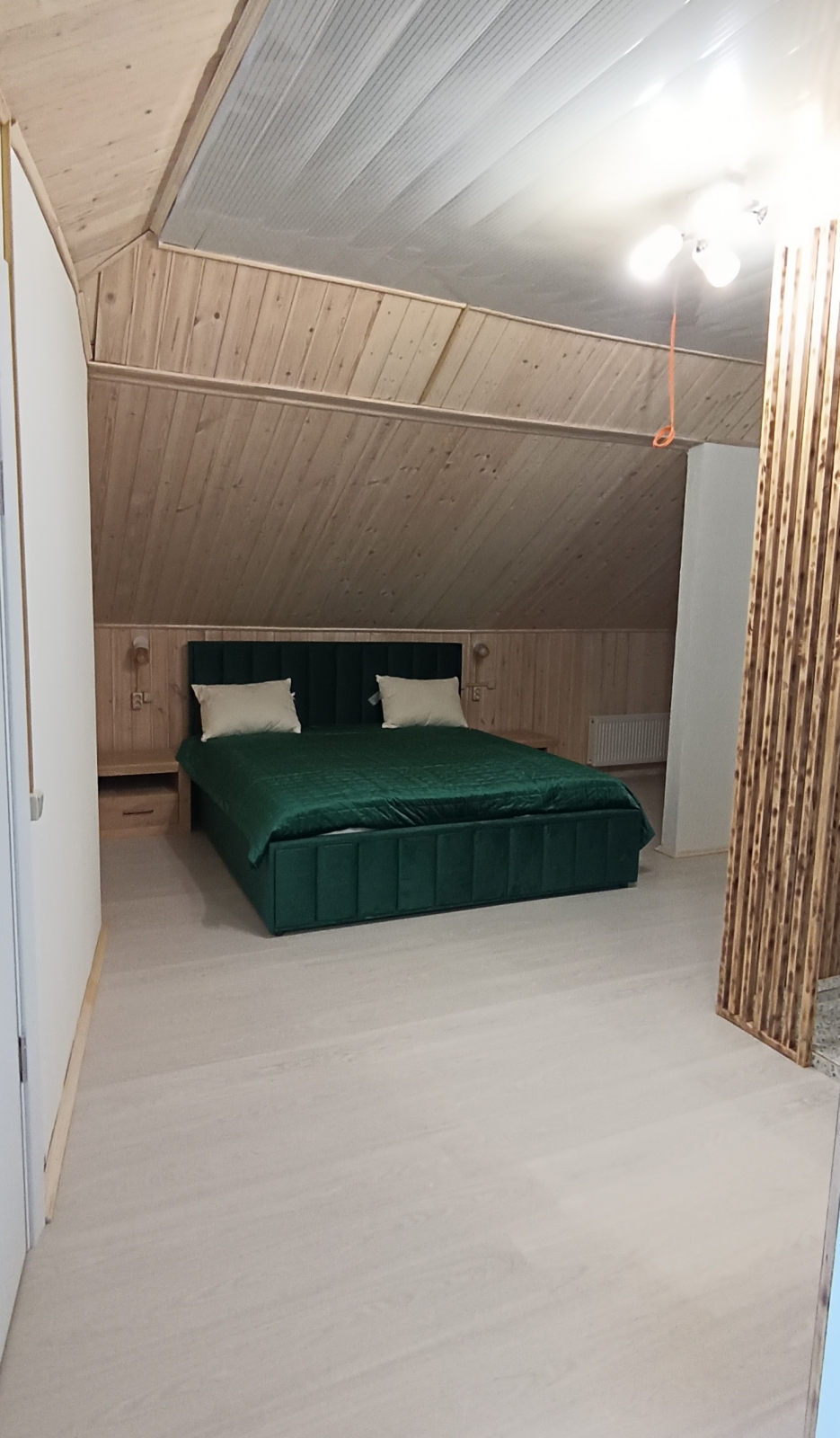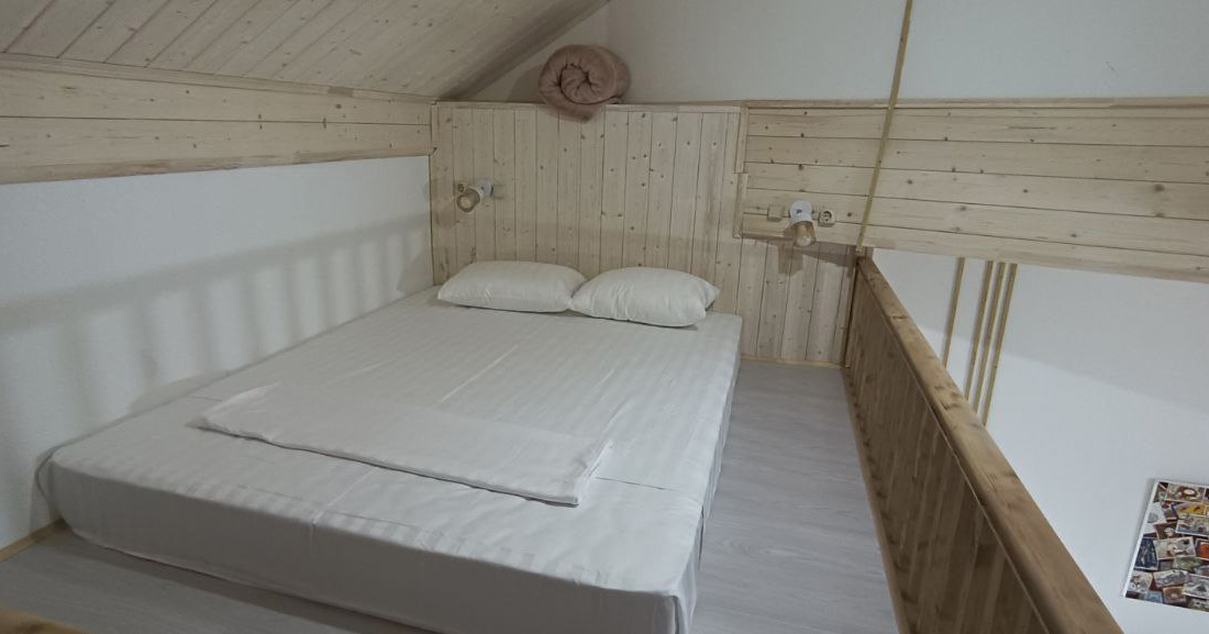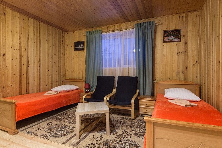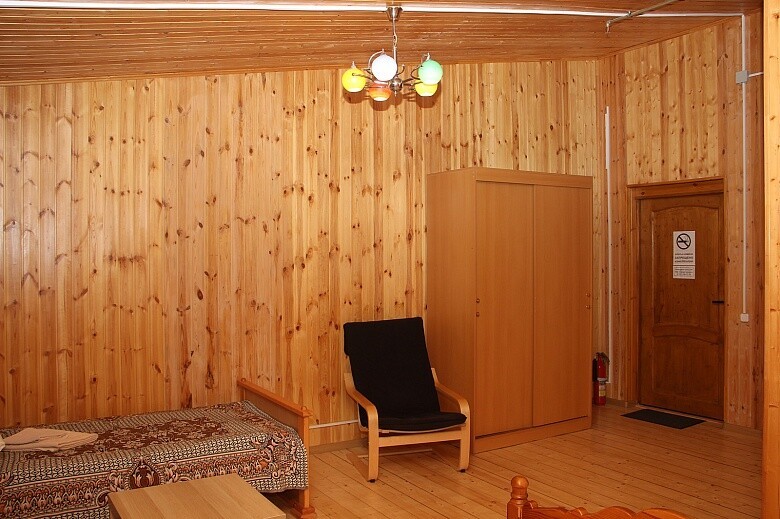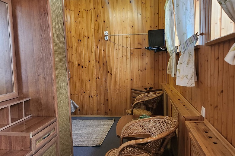 2-х комнатный номер. Они оборудованы всем необходимым: холодильником, двумя телевизорами, есть сейф, фен и ванна. Установлена двуспальная кровать и имеются два спальных места на деревянном подиуме.