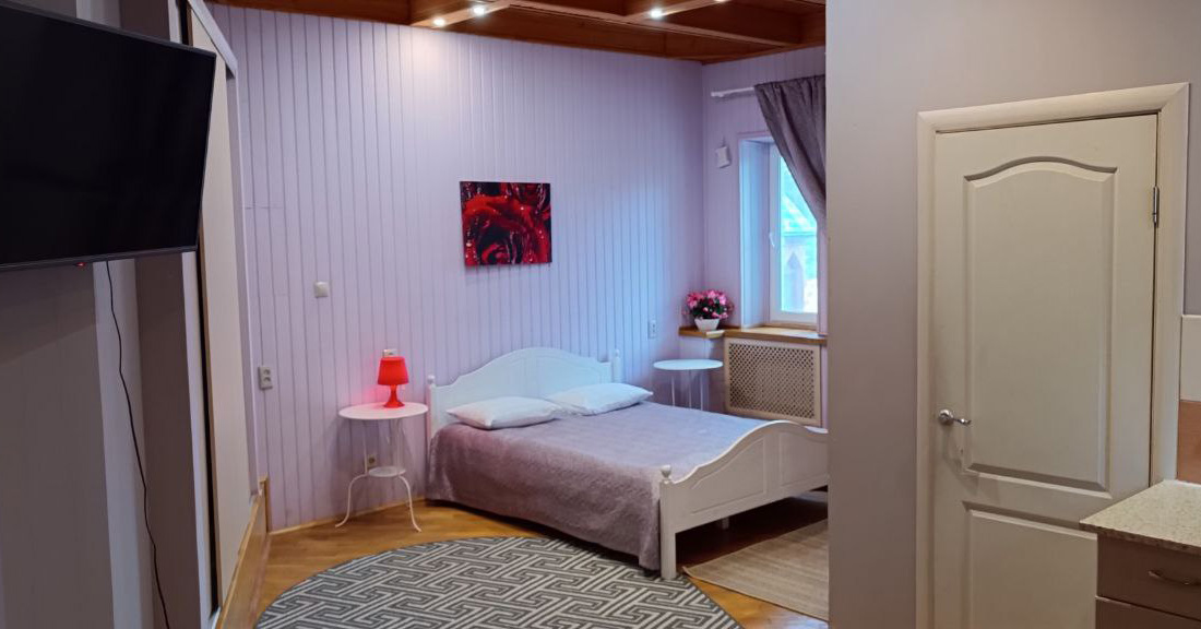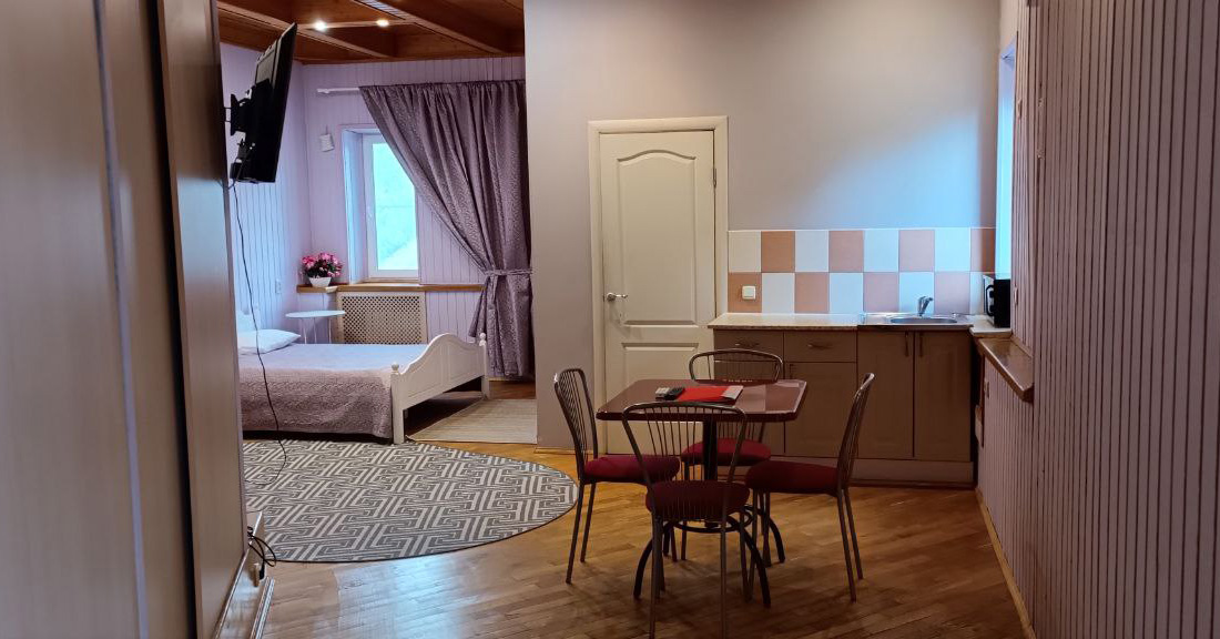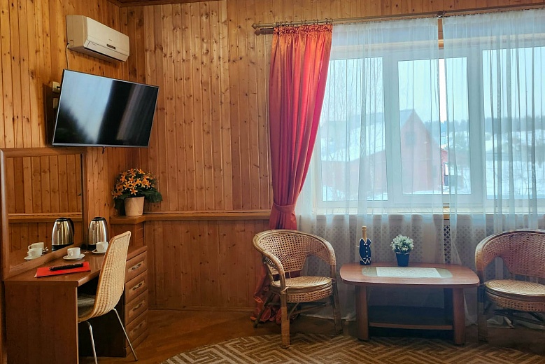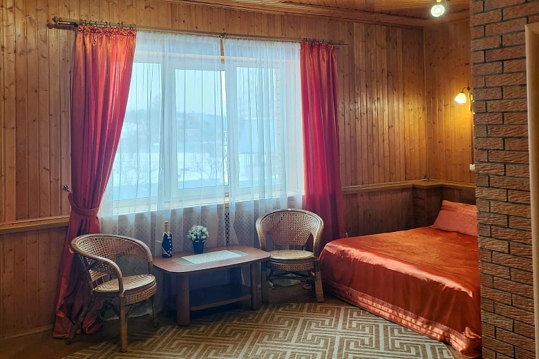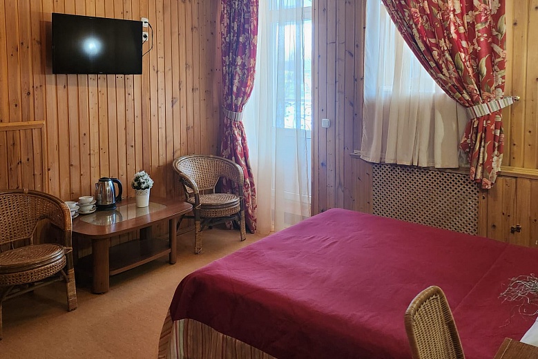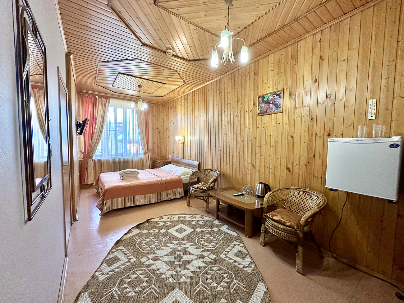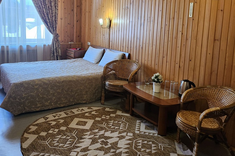 Площадь номера - 20 кв.м. 2 осн. места. 1 доп. место. Мебель: диван (в некоторых номерах), кровать двуспальная, стол, стулья. Мини-кухня. Оборудование: микроволновая печь, набор посуды, сейф, телевизор, холодильник, электрочайник. Санузел: с джакузи, туалетные принадлежности, фен. Сервис: смена полотенец, смена постельного белья, уборка номера.