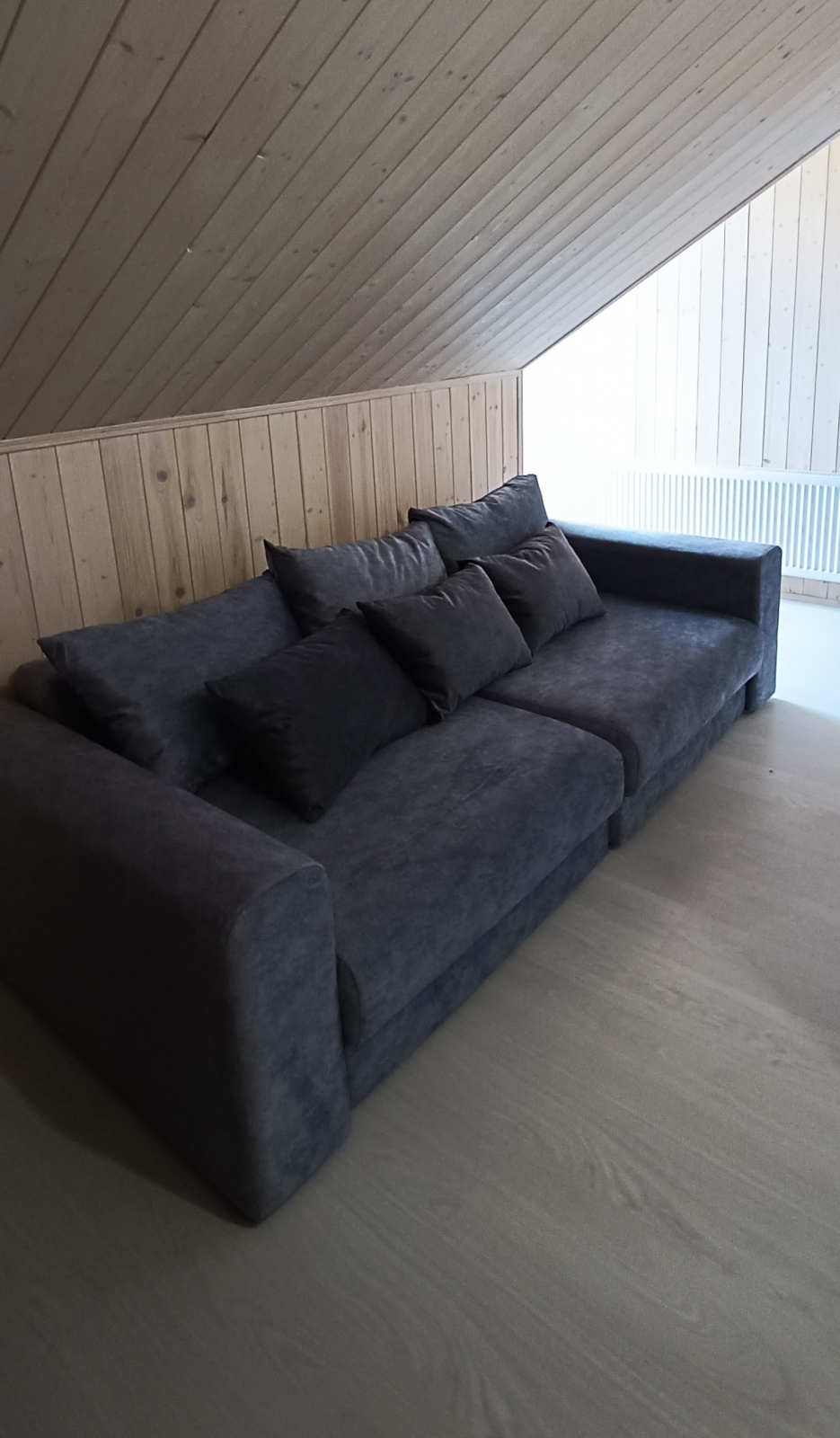 Площадь номера - 150 кв.м. 1 комната. 8 осн. мест. **в качестве 7/8 основного места предоставляется раскладной диван**; в коттедже: 4 спальни, гостиная с кухонным уголком, 2 санузла, мангал. В номере: телевизор; холодильник; балкон; туалет; микроволновая печь; стиральная машина; 2-спальная кровать; 1-спальные кровати; чайник; душевая кабина; плита; посудомоечная машина; кухонный уголок; раскладной диван. 4 доп. места: Диван - при размещении 12 человек туристы размещаются на 2-спальных диванах.