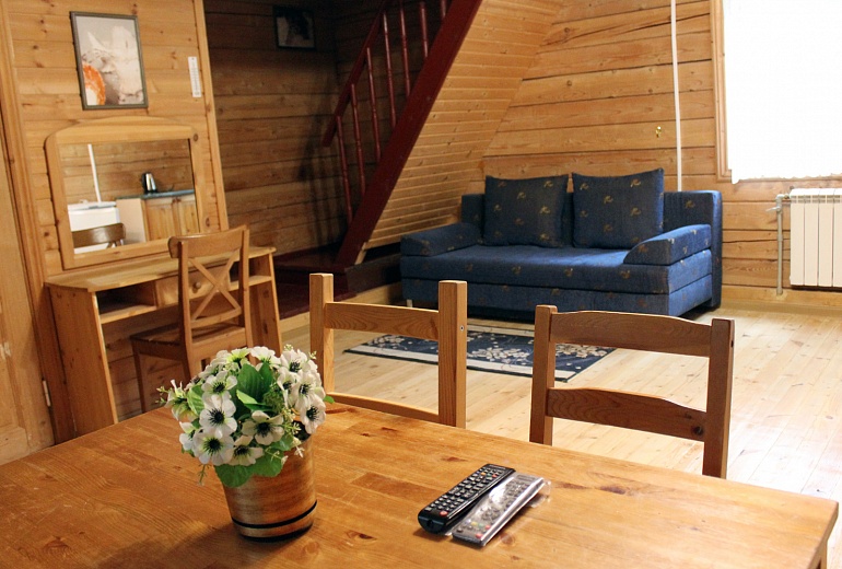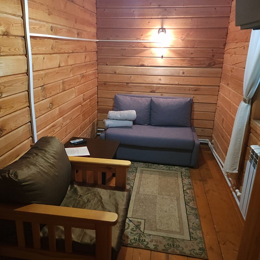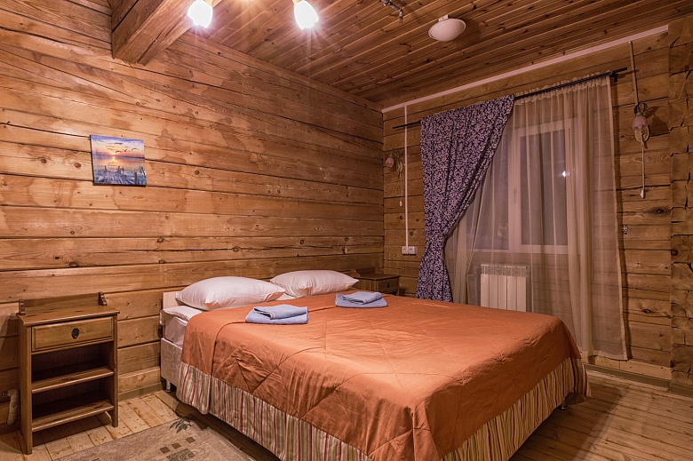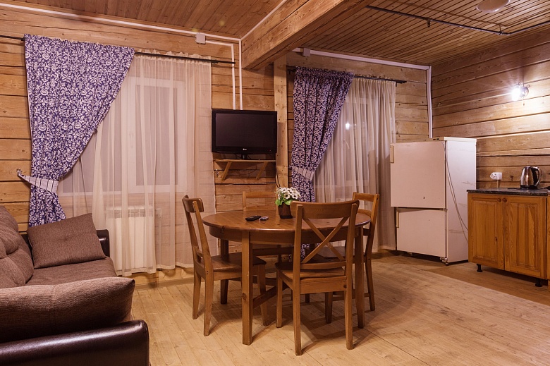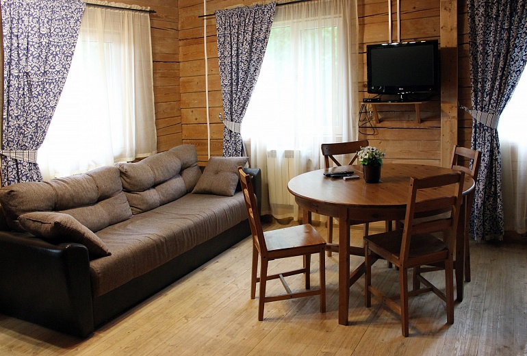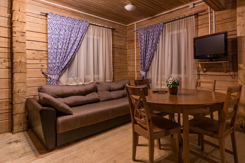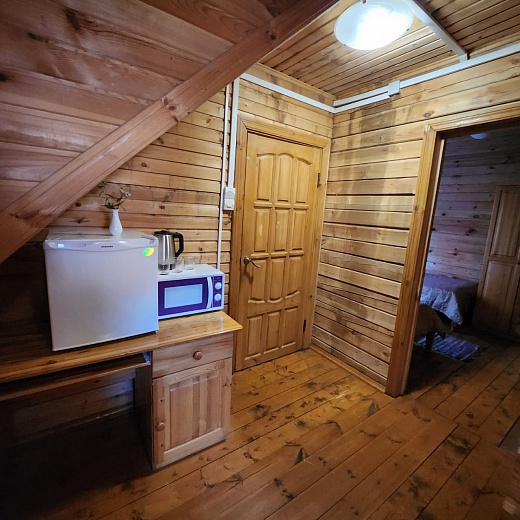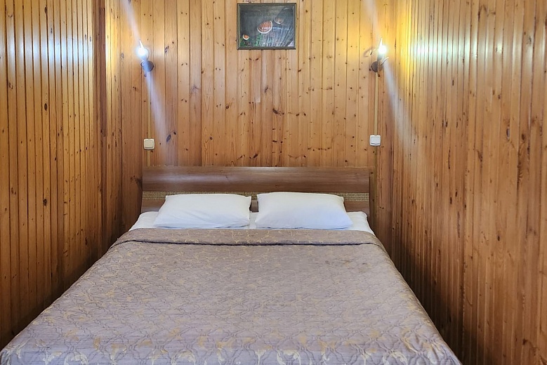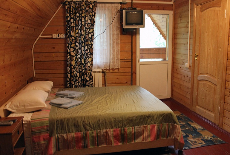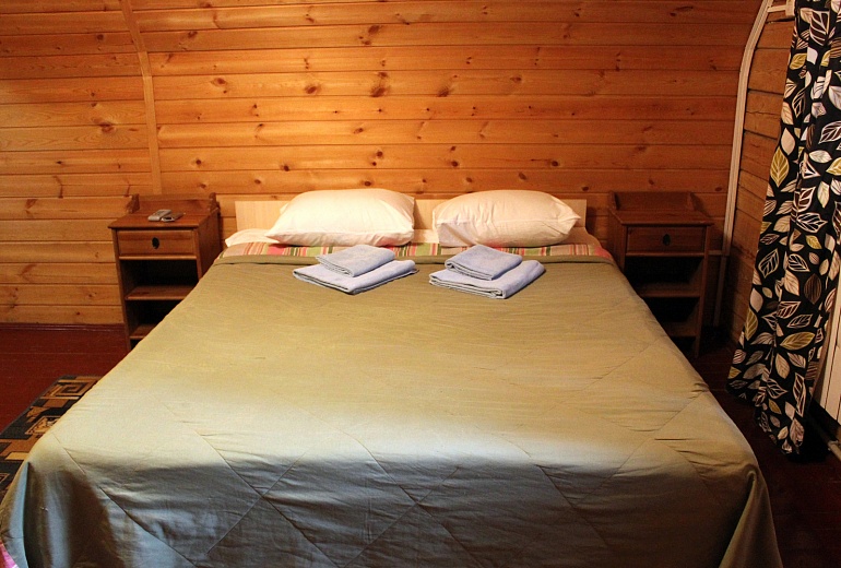 Площадь номера - 70 кв.м. 1 комната. 2 осн. места. в коттедже: спальня, гостиная с кухонным уголком, 2 санузла, мангал. В номере: телевизор; холодильник; балкон; туалет; микроволновая печь; 2-спальная кровать; чайник; душевая кабина; кухонный уголок. 2 доп. места: Диван - при размещении 4 человек третий и четвертый туристы размещаются на 2-спальном диване.