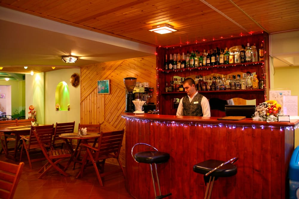 В баре ресторана в большом ассортименте представлены алкогольные и безалкогольные напитки.