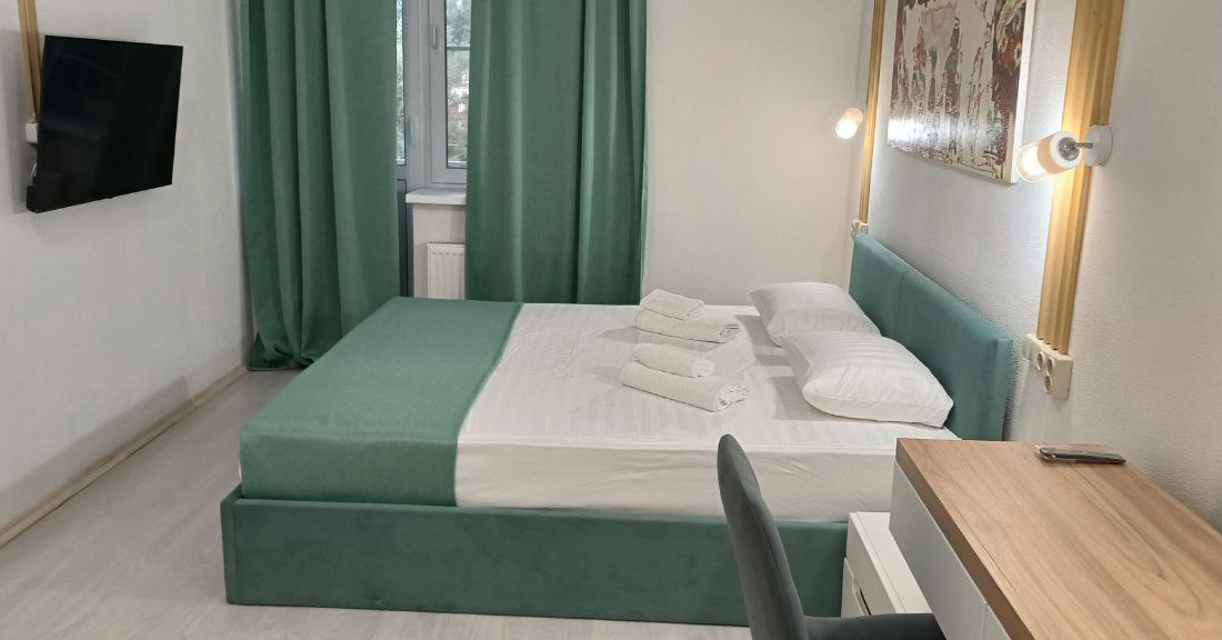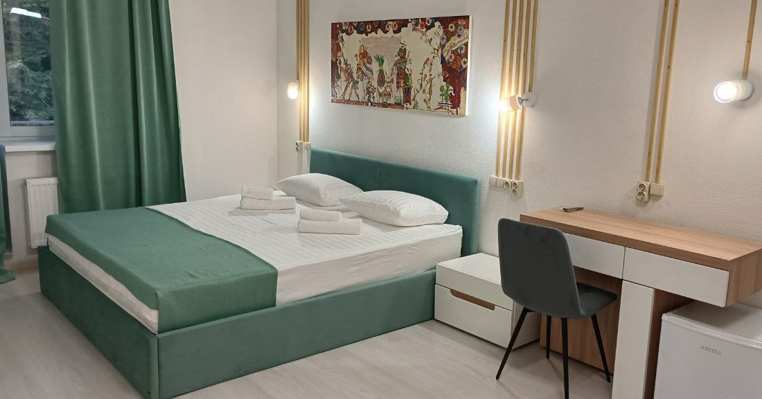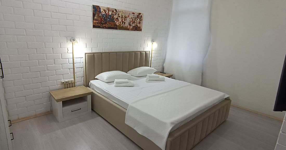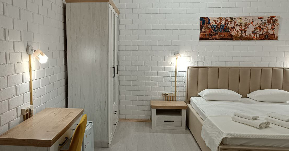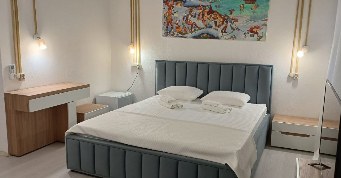 2-х комнатный номер. В номере: телевизор, холодильник, сейф, две двуспальные кровати, санузел с ванной, фен.