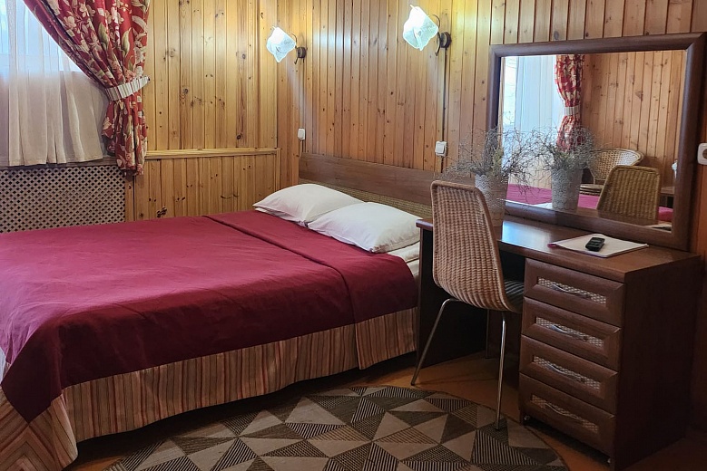 Площадь номера - 18 кв.м. 2 осн. места. 1 доп. место. Мебель: диван (в некоторых номерах), кровать двуспальная, стол, стул. Оборудование: сейф, телевизор, холодильник. Санузел: с ванной/душем, туалетные принадлежности, фен. Сервис: смена полотенец, смена постельного белья, уборка номера.