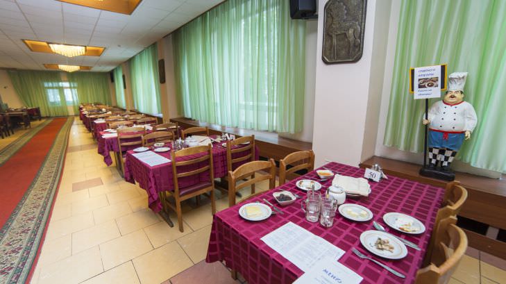 Для питания отдыхающих в санатории есть замечательная столовая с VIP-залом. В столовой всегда приятная атмосфера, играет музыка, а персонал всегда приветлив и вежлив. Здесь осуществляется пятиразовое питание (кроме гостей, страдающих сахарным диабетом, у них – шестиразовое питание), а все проблемы, связанные с питанием, решит диет-сестра, всегда присутствующая в зале столовой. Перед обедом гостям санатория подается кислородный коктейль, вечером – кефир, а при подборе индивидуального питания поможет консультация врача-диетолога. Все блюда готовятся только из качественных, натуральных и полезных продуктов.