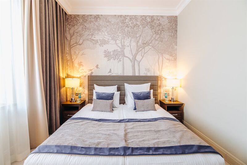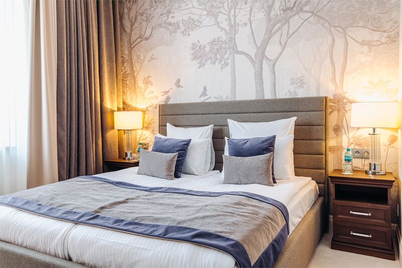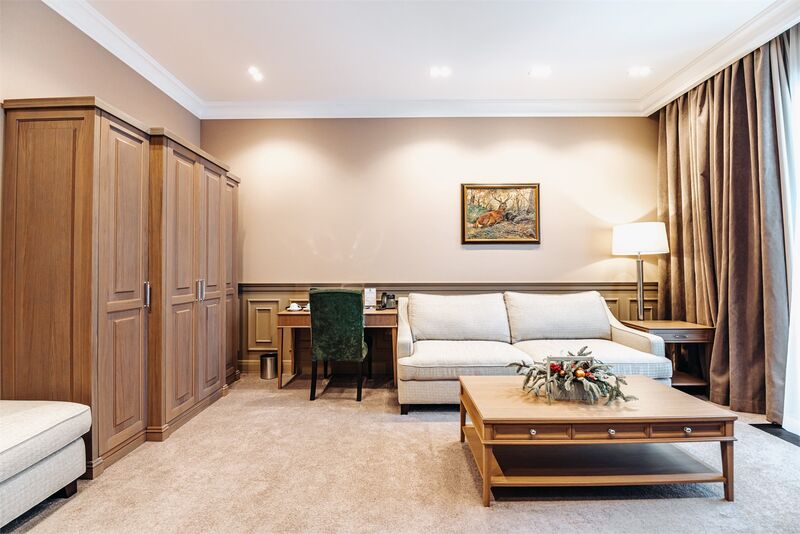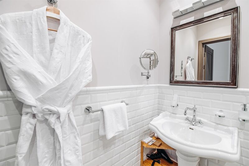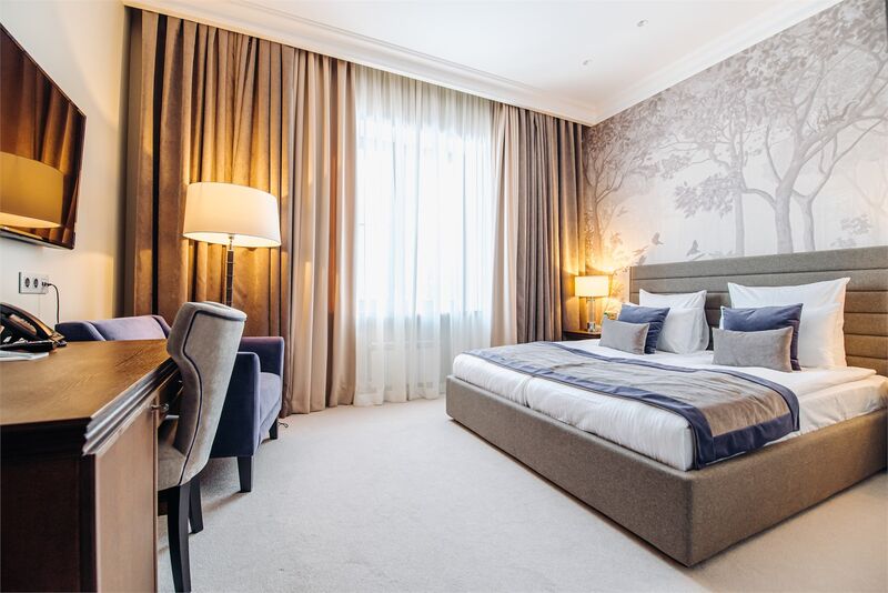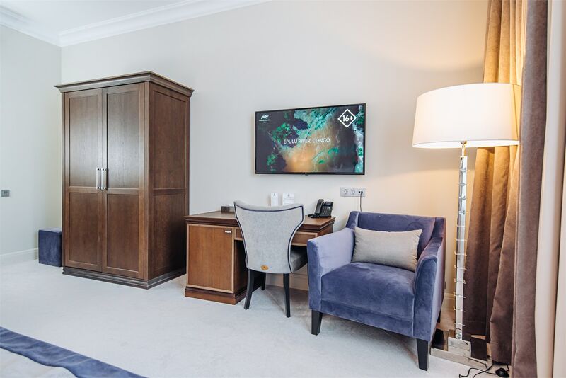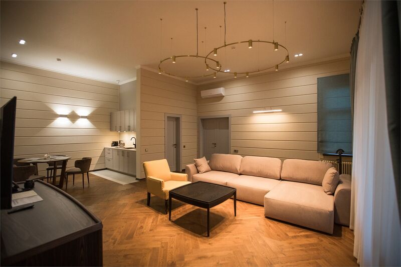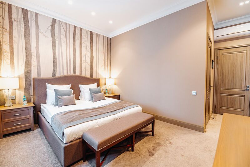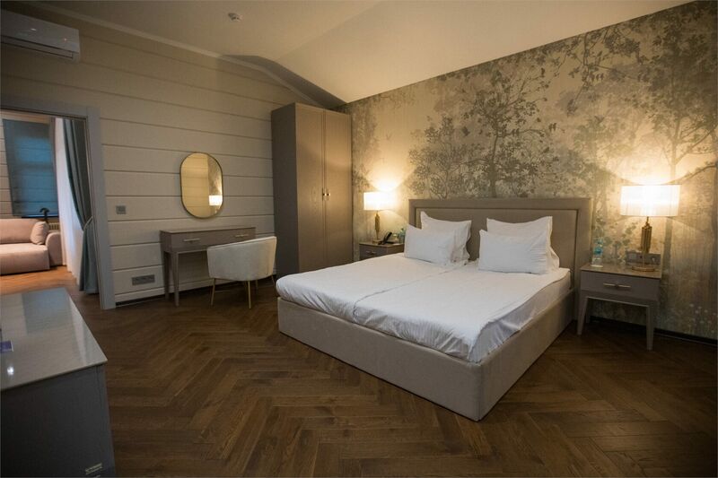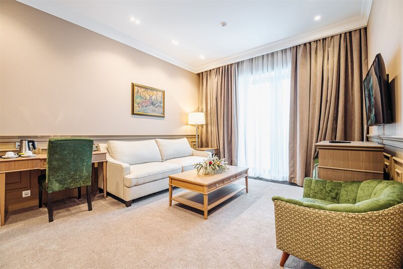 Площадь номера - 45 кв.м.; В номере: Кондиционер, Холодильник, Телевизор, Телефон, Кабельное/спутниковое/цифровое телевидение, Тапочки, Халат, Фен, Набор косметики (туалетные принадлежности), Набор для приготовления чая/кофе, Душ/душевая кабинка, Двуспальная кровать, Туалет в номере, Кофейная станция, Утюг, Сплит-система , Диван; Макс. кол-во гостей - 3
