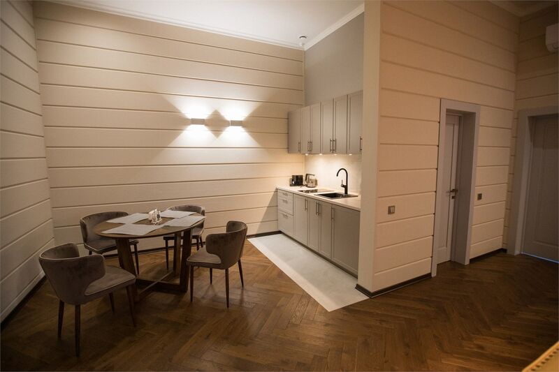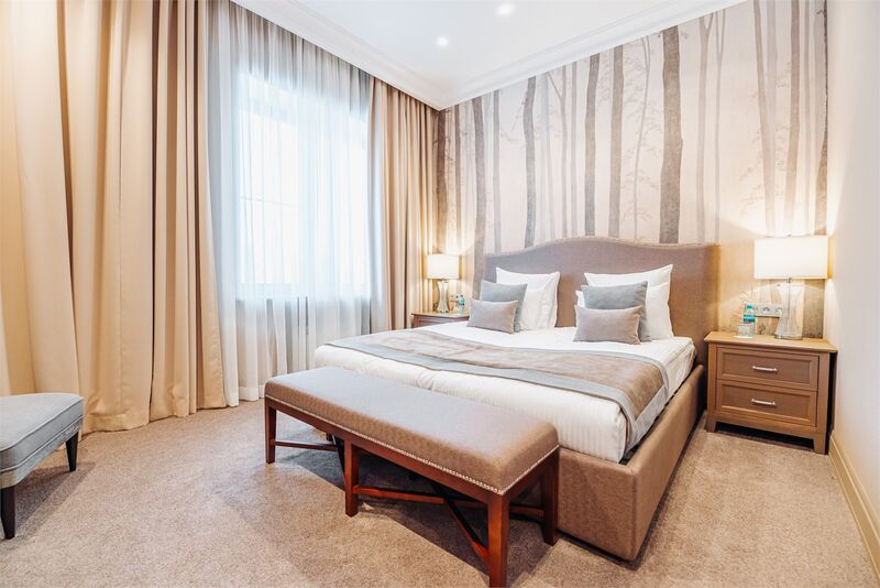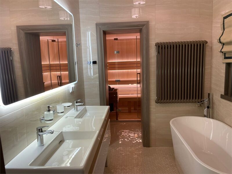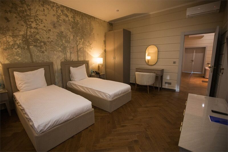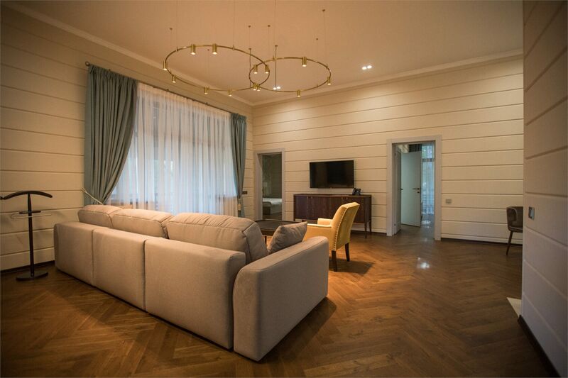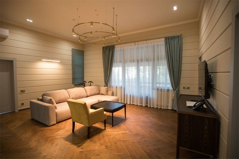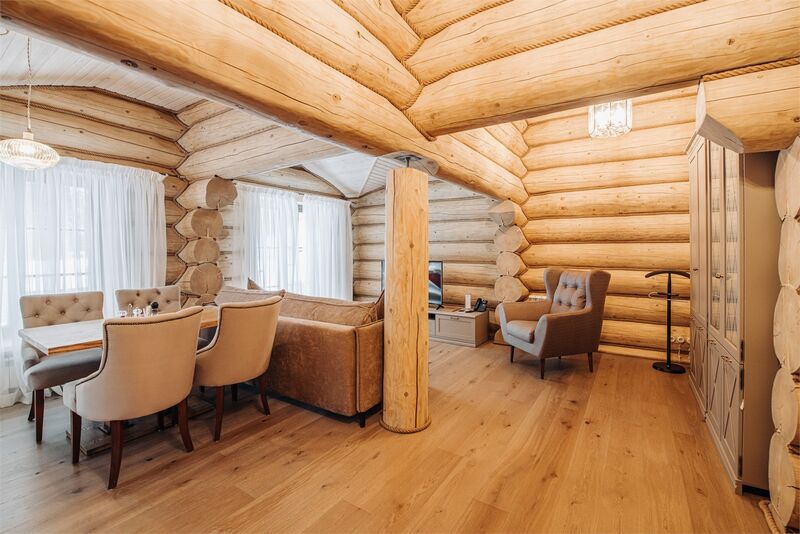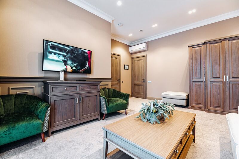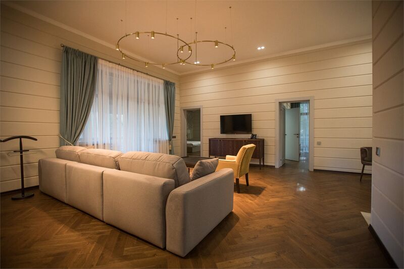 Площадь номера - 161 кв.м.; В номере: Кондиционер, Холодильник, Телевизор, Телефон, Кабельное/спутниковое/цифровое телевидение, Тапочки, Кухня, Халат, Фен, Набор для приготовления чая/кофе, Мягкая мебель, Ванна, Душ/душевая кабинка, Двуспальная кровать, Туалет в номере, Тумбочка, Шкаф, Чайник, Кофейная станция, Микроволновая печь, Сауна, Терраса, Диван, Кресло; Макс. кол-во гостей - 5