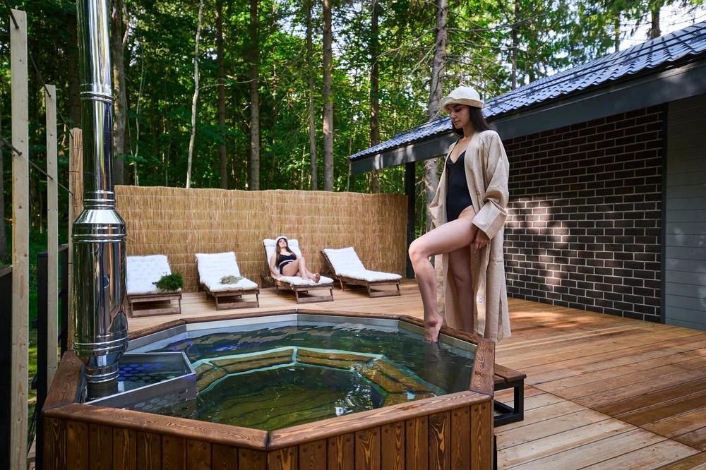Также к услугам гостей баня, парная, тропический душ, обливное ведро, холодная купель и теплый чан на улице. В стоимость проживания входит 2 часа аренды бани и хвойно-цитрусовый чан.