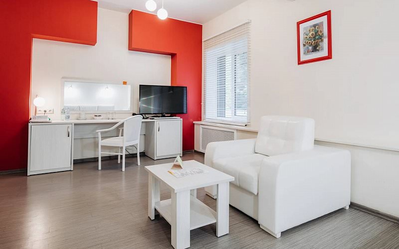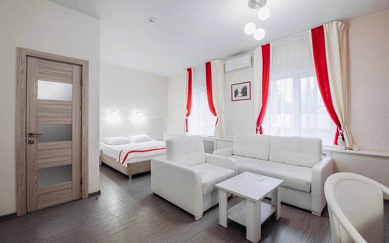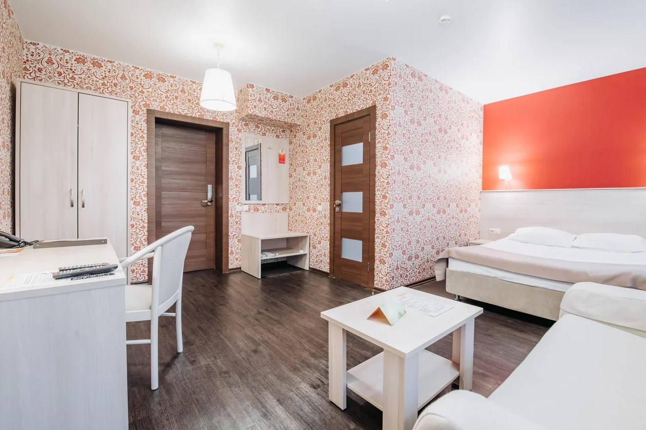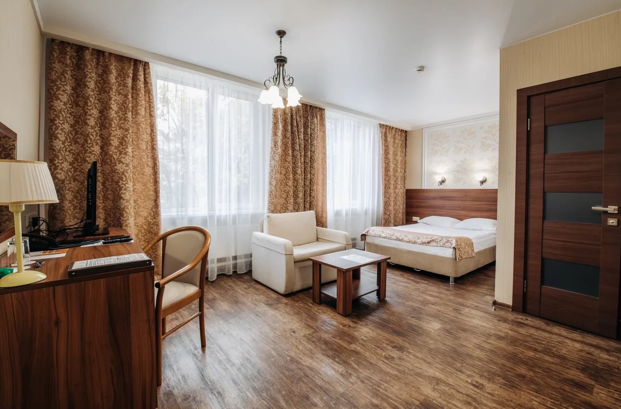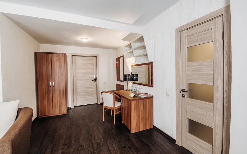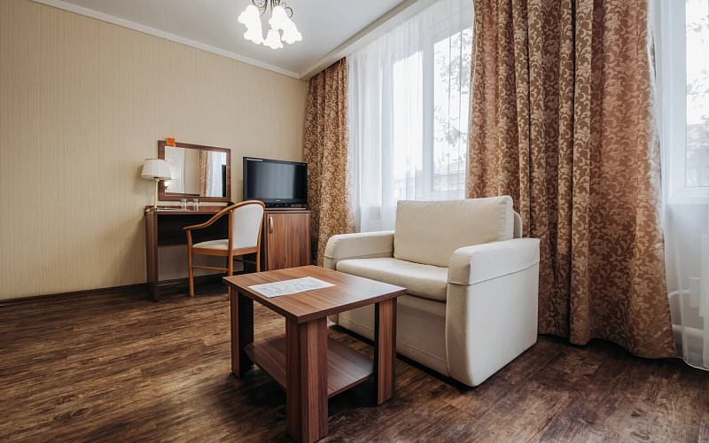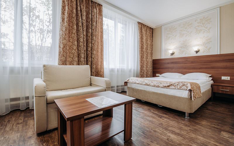 Однокомнатный люкс для размещения двух человек. Площадь номера 26-29 кв.м. В номере двуспальная кровать, диван и кресло. Дети до 5 лет проживают бесплатно без предоставления дополнительных мест.