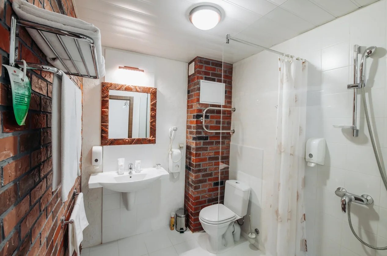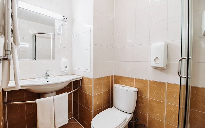 Санузел: ванная комната, фен, гигиенические средства, унитаз, банные принадлежности.