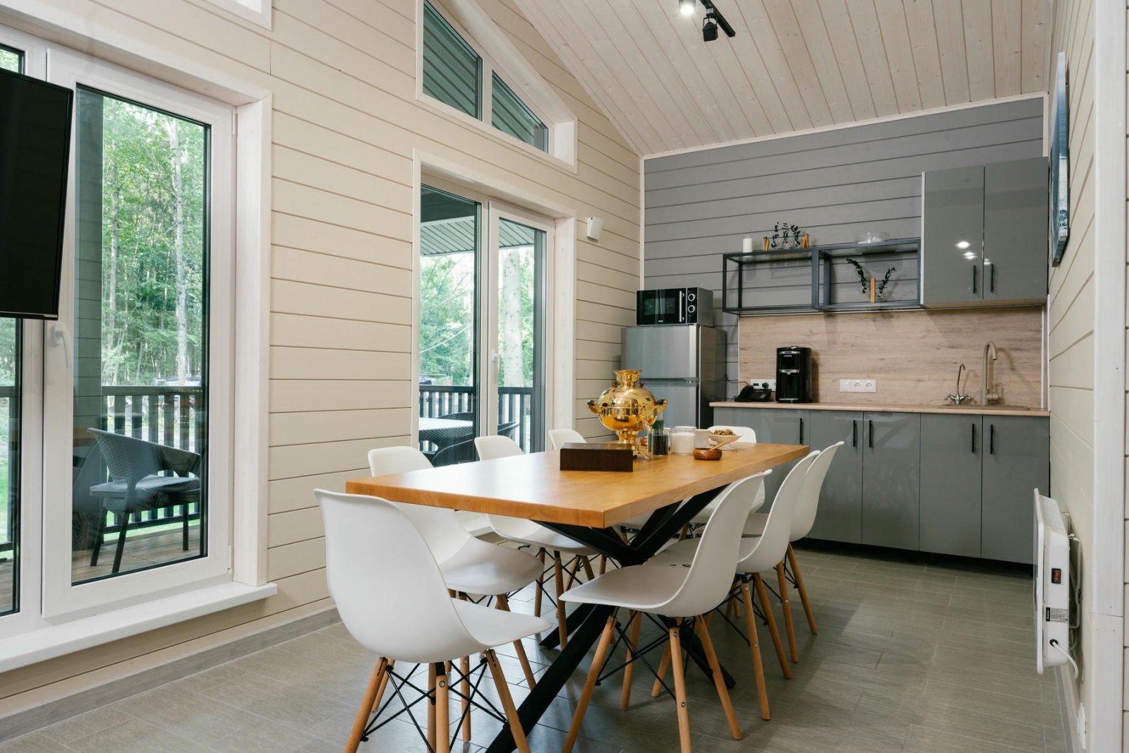 Просторный коттедж с баней в современном стиле из натуральных материалов с панорамными окнами и видом на лесной массив. В коттедже есть спальня, гостиная, мини-кухня и терраса.