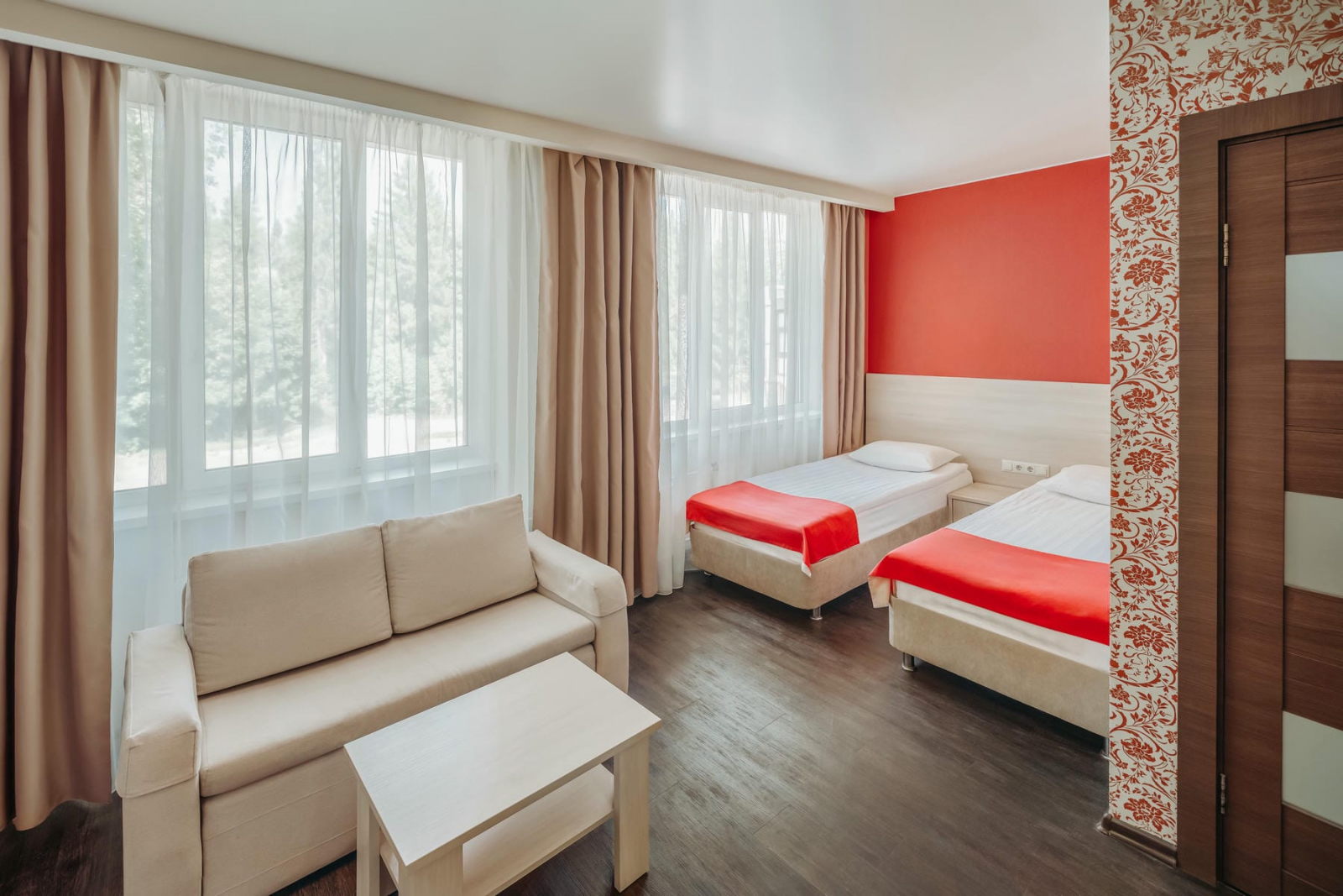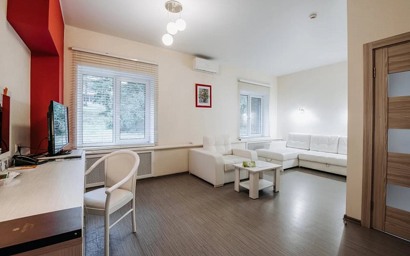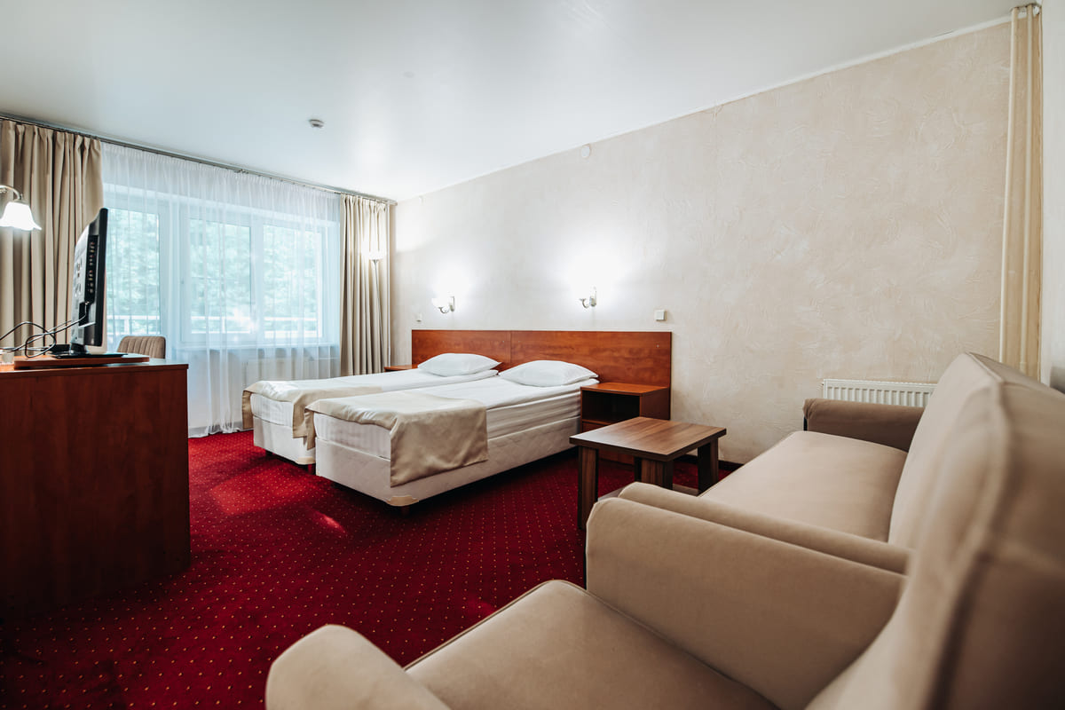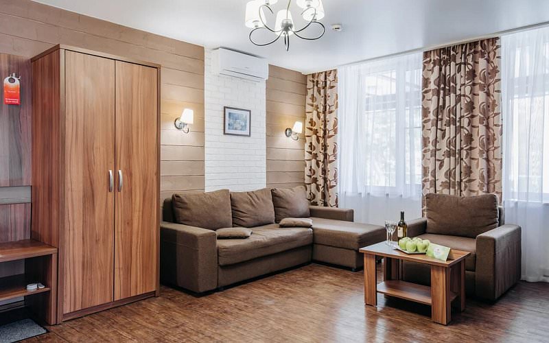 Большой двухкомнатный номер. В гостиной гарнитур из мягкой мебели. В спальне большая двуспальная кровать. Ванная комната с душевой кабиной или угловой ванной. Покрытие – ламинат. Дети до 5 лет проживают бесплатно без предоставления дополнительных мест.