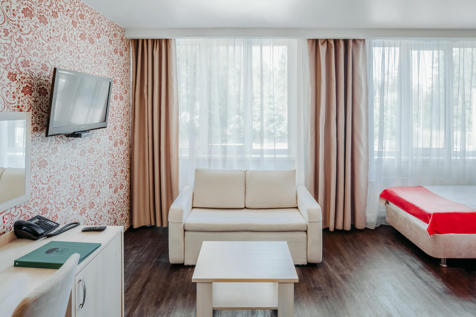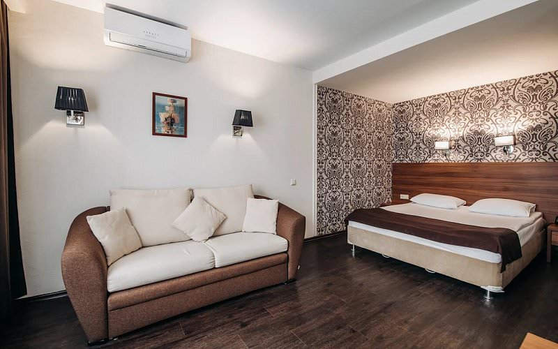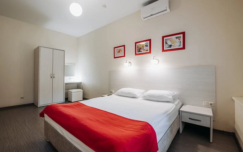 Улучшенный номер с двуспальной кроватью для комфортного проживания двух человек. В номере раскладывающееся кресло или диван. Покрытие – ламинат. Дети до 5 лет проживают бесплатно без предоставления дополнительных мест.