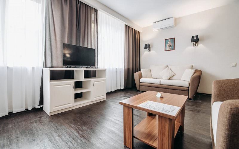 Апартаменты с двумя комнатами для размещения до 4 человек. Площадь номера до 50 кв.м. В спальне двуспальная кровать, в гостиной двуспальный диван.Дополнительно можно поставить детскую кроватку. Дети до 5 лет проживают бесплатно без предоставления дополнительных мест.