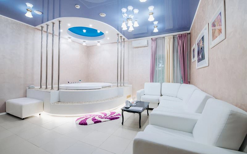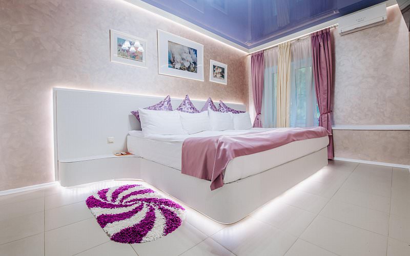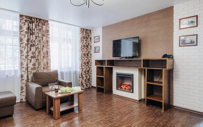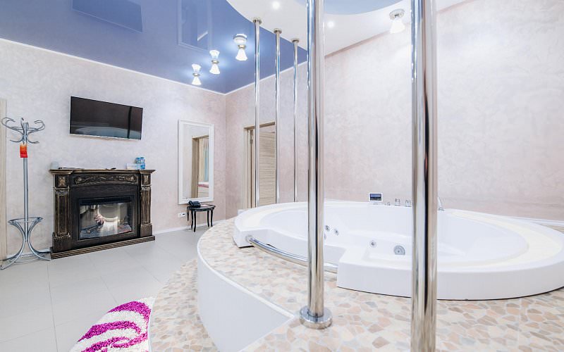Номер идеально подходит для молодоженов или романтического вечера. В гостиной ванна джакузи, электронный камин, 3D плазма. В спальне большая кровать, шкаф-купе, 3D плазма, подсветка. Санузел с угловой ванной и и туалетными принадлежностями. Дети до 5 лет проживают бесплатно без предоставления дополнительных мест.