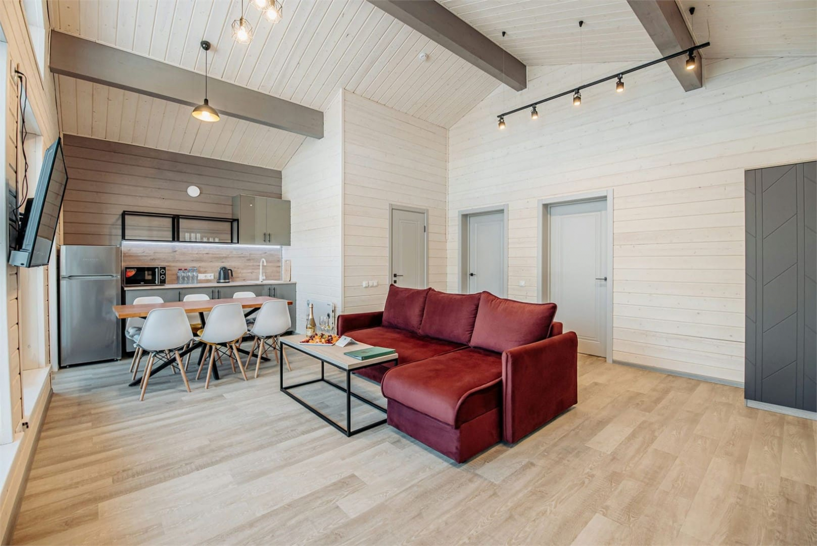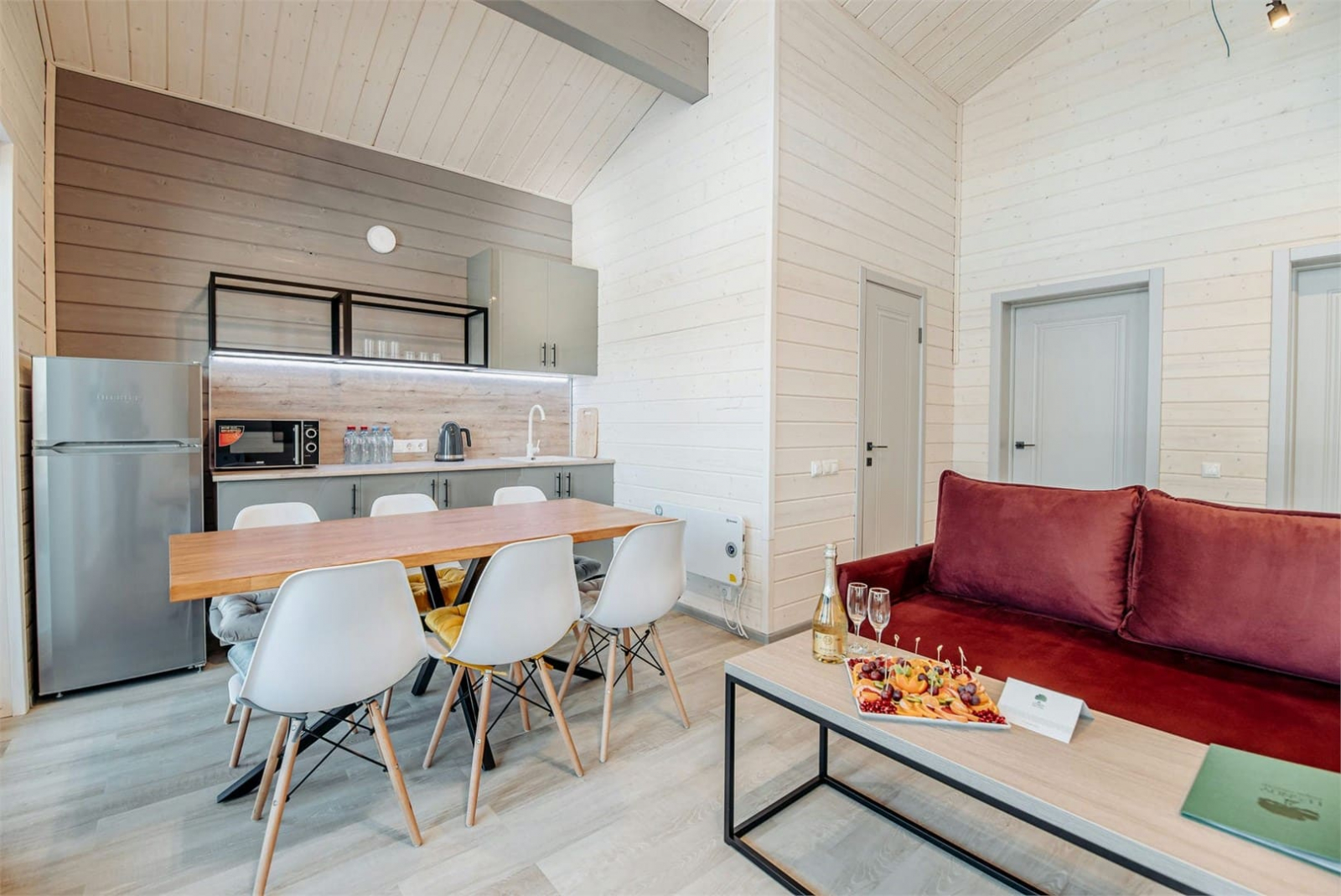 Коттеджи с современным дизайном и панорамным остекленением. Две изолированные спальни. В одной спальне двуспальная кровать, в другой – кровать-трансформер из двух односпальных. Просторная гостиная и мини-кухня.