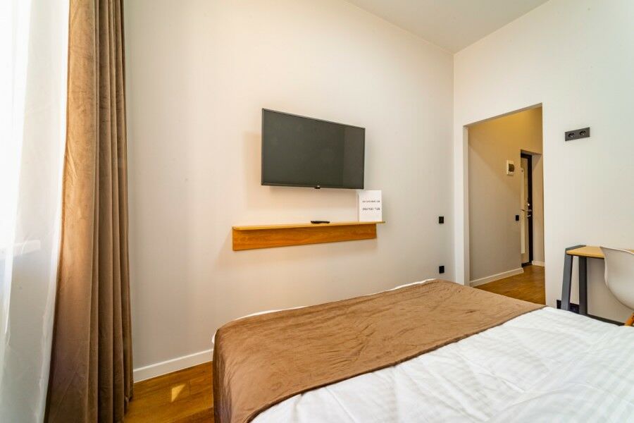 Площадь номера - 18 кв.м.; В номере: Кондиционер, Телевизор, Стиральная машина, Кабельное/спутниковое/цифровое телевидение, Тапочки, Кухня, Фен, Набор косметики (туалетные принадлежности), Набор для приготовления чая/кофе, Рабочая зона, Душ/душевая кабинка, Двуспальная кровать, Туалет в номере, Шкаф, Чайник, Утюг; Макс. кол-во гостей - 2