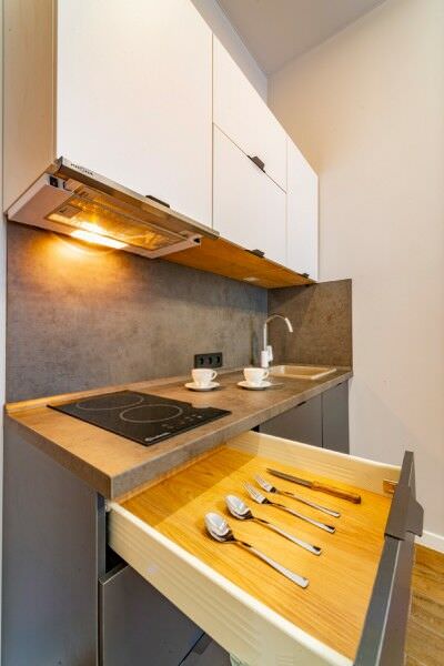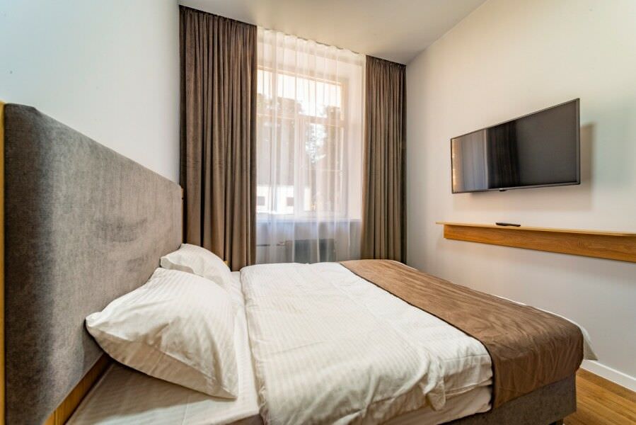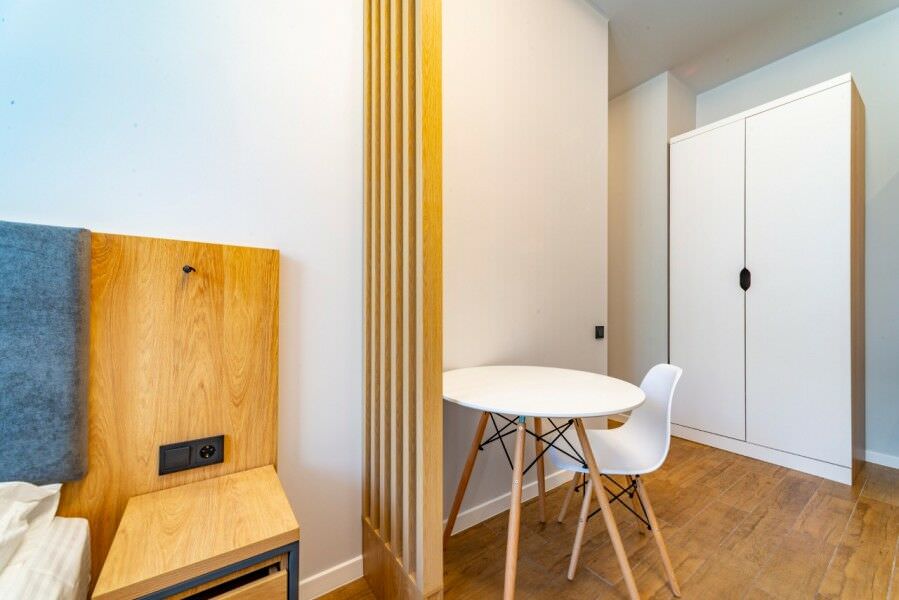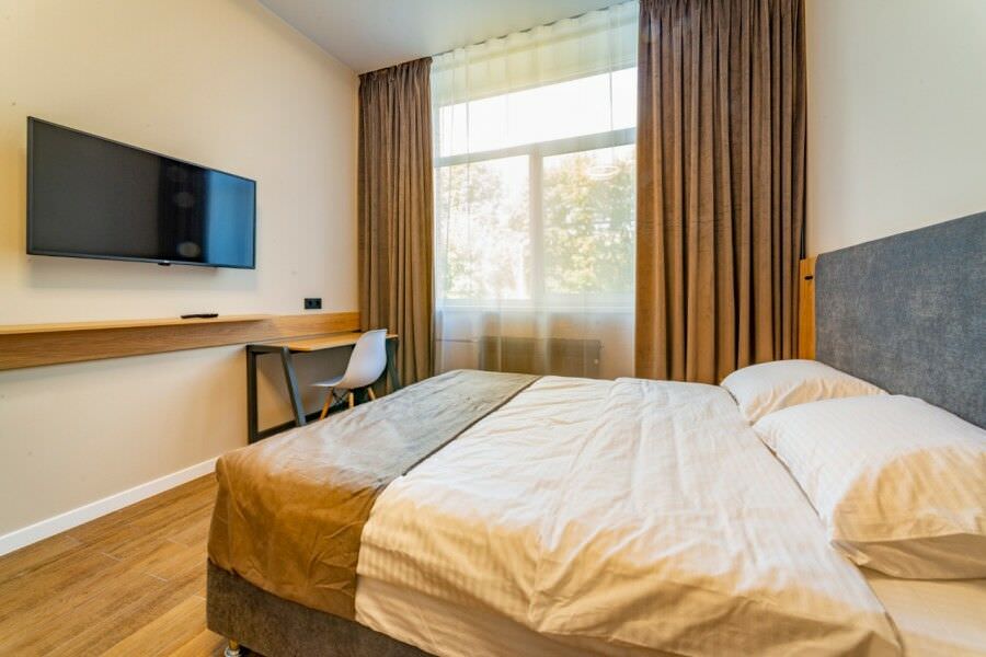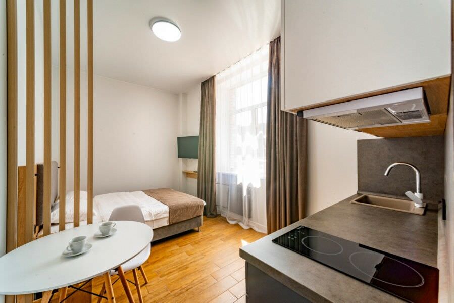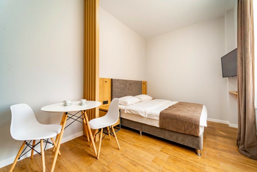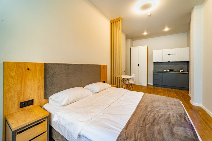 Площадь номера - 30 кв.м.; В номере: Кондиционер, Холодильник, Телевизор, Стиральная машина, Кабельное/спутниковое/цифровое телевидение, Тапочки, Кухня, Фен, Набор косметики (туалетные принадлежности), Набор для приготовления чая/кофе, Рабочая зона, Душ/душевая кабинка, Двуспальная кровать, Туалет в номере, Шкаф, Чайник, Утюг, Микроволновая печь; Макс. кол-во гостей - 2