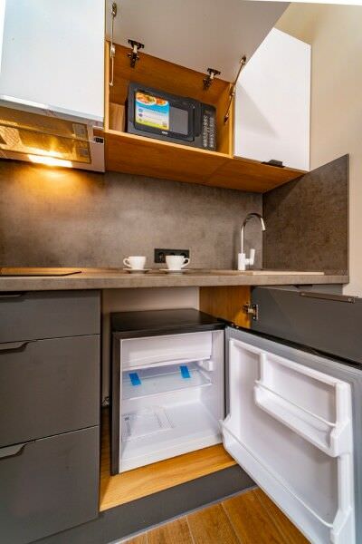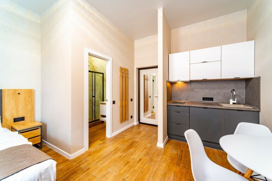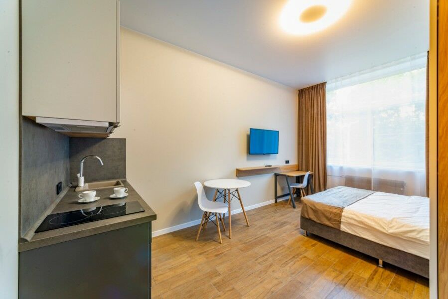 Площадь номера - 27 кв.м.; В номере: Кондиционер, Холодильник, Телевизор, Стиральная машина, Кабельное/спутниковое/цифровое телевидение, Тапочки, Кухня, Фен, Набор косметики (туалетные принадлежности), Набор для приготовления чая/кофе, Рабочая зона, Душ/душевая кабинка, Двуспальная кровать, Туалет в номере, Шкаф, Чайник, Утюг, Микроволновая печь; Макс. кол-во гостей - 2