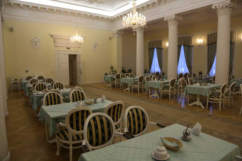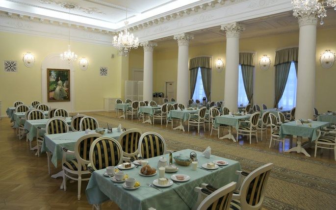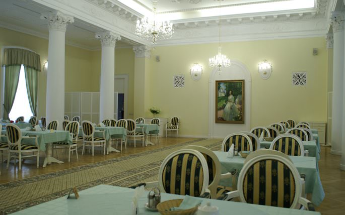 В санатории для его гостей предусмотрено пятиразовое питание, в которое входят диет-столы и заказное меню, а заведения для приема пищи расположены в корпусах №1 и №2. В 1 корпусе расположена замечательная столовая, оформленная в пастельных тонах и бар с интересным меню, где отдыхающие смогут побаловать себя вкусными коктейлями и легкими закусками. Во 2 корпусе расположена столовая с интерьером и оформлением в старинном стиле, а также отличный бар с роскошной атмосферой и замечательными напитками.