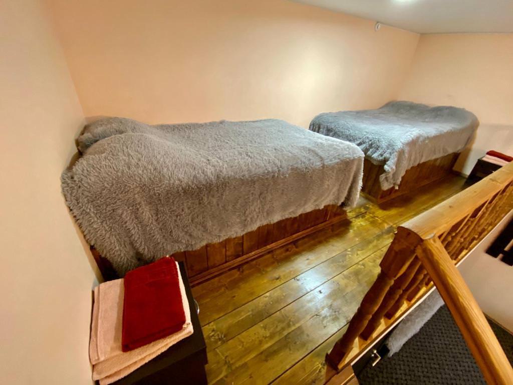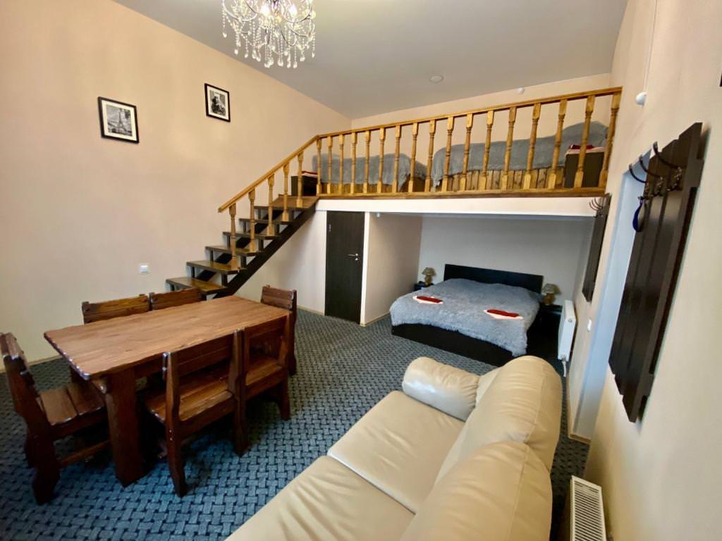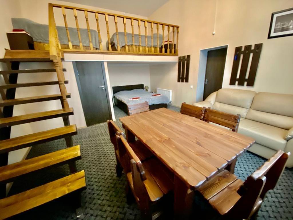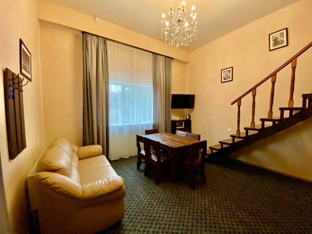 На первом уровне: просторная гостиная с диваном и с телевидением, санузел с душевой кабиной, двуспальная кровать. На втором уровне: две полуторные кровати. Дополнительным: СВЧ печь, электрический чайник, столовый набор на 6 персон, полотенце и вспомогательная посуда, стол, прикроватные тумбы.