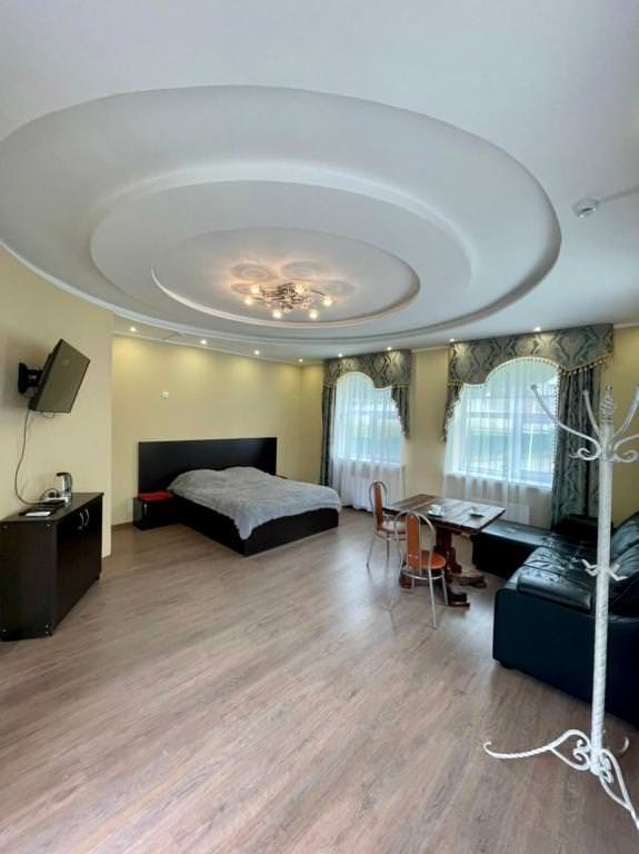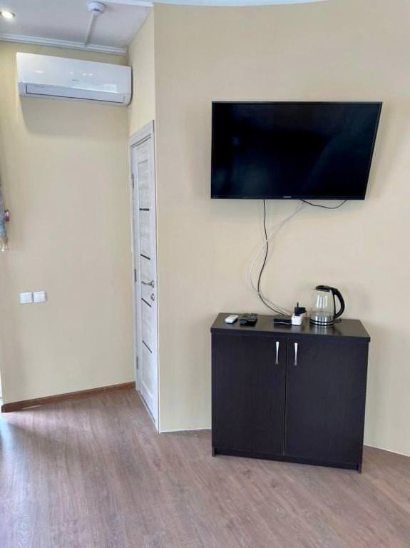 В комнате двуспальная кровать, диван, санузел с душевой кабиной. Дополнительно: Эл чайник, чайный набор, полотенце, стол, комод, прикроватные тумбы, телевизор, кондиционер.