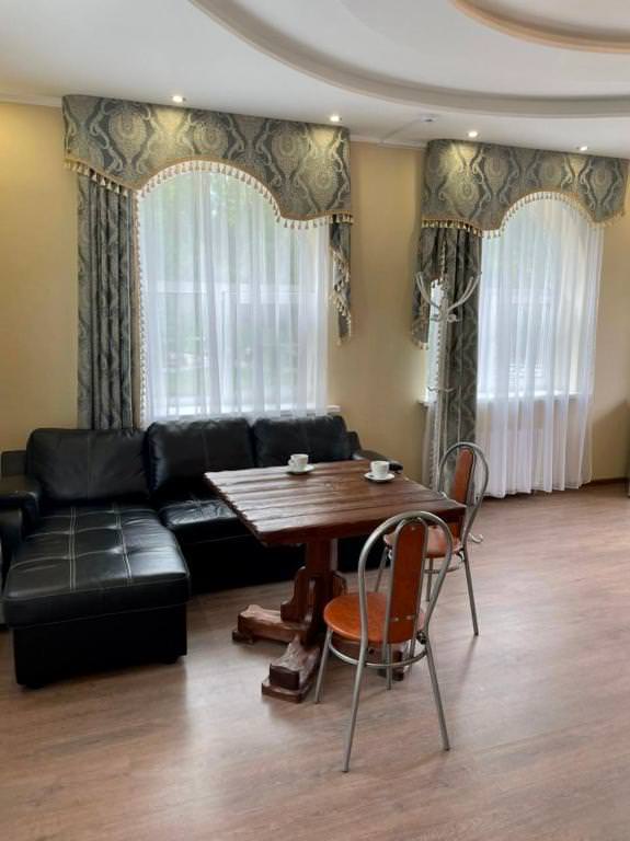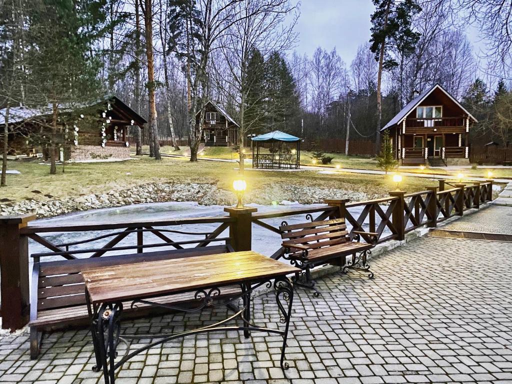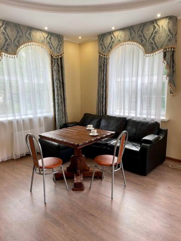 Просторная гостиная с диванами и со спутниковым телевидением, санузел, одна комната с двуспальной кроватью, парная, душевая комната с купелью. Дополнительным: холодильник, СВЧ печь, электрический чайник, столовый набор на 8 персон, полотенце и вспомогательная посуда, музыкальный центр.