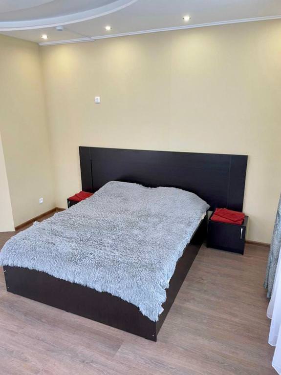 На первом этаже: просторная гостиная с диваном и со спутниковым телевидением, комната с двуспальной кроватью, санузел с душевой кабиной. На втором этаже: две просторные комнаты с двуспальными кроватями, диван, детская кровать, санузел. Дополнительным: холодильник, СВЧ печь, электрический чайник, столовый набор на 10 персон, полотенце и вспомогательная посуда, комод, прикроватные тумбы, балкон. В доме может проживать до 10 человек