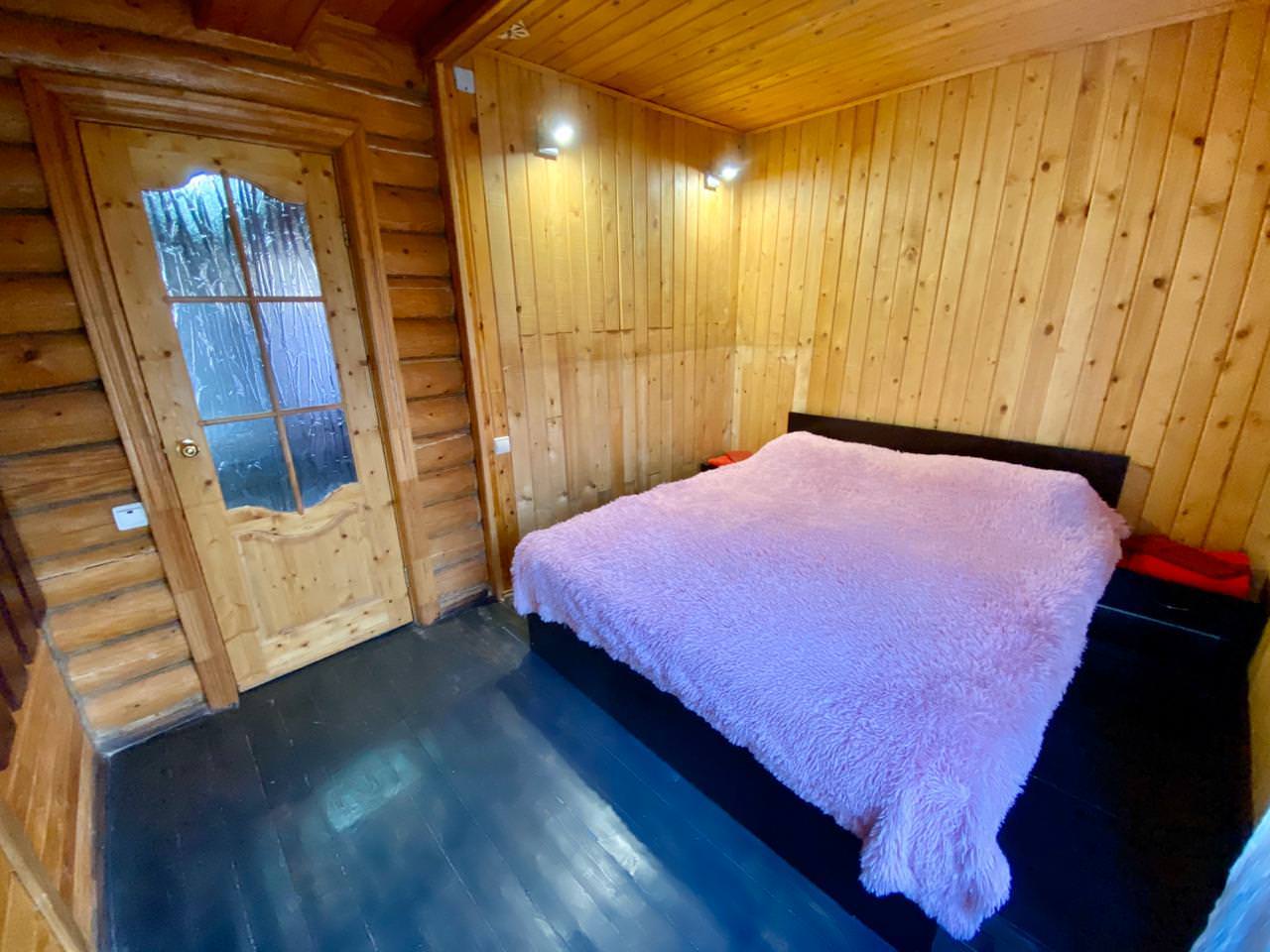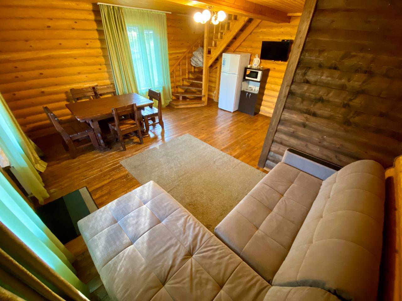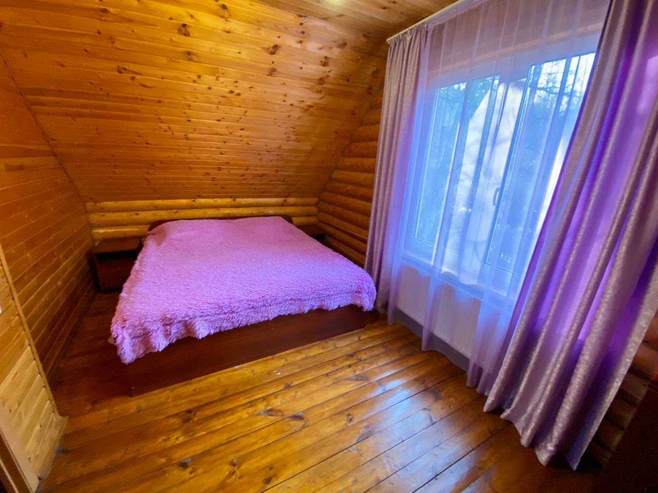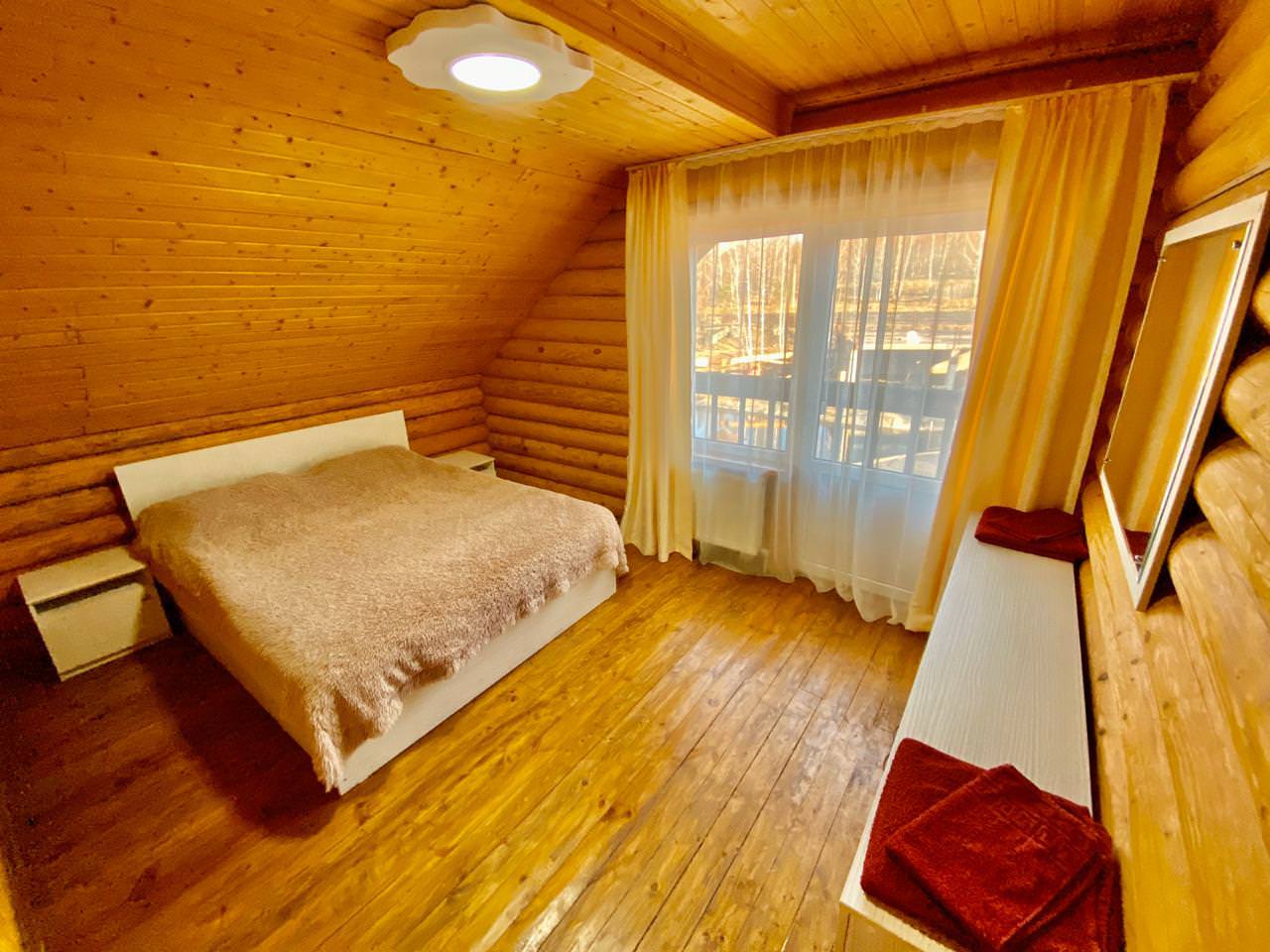 Отдельно стоящий сруб площадью 80 кв.м. На первом этаже: просторная гостиная с диваном и со спутниковым телевидением, санузел с душевой кабиной. На втором этаже: просторная комната с двуспальной кроватью, детская кровать, диван, санузел с душевой кабиной. Дополнительным: холодильник, СВЧ печь, электрический чайник, столовый набор на 6 персон, полотенце и вспомогательная посуда, комод, прикроватные тумбы, балкон. В доме может проживать 6 человек.