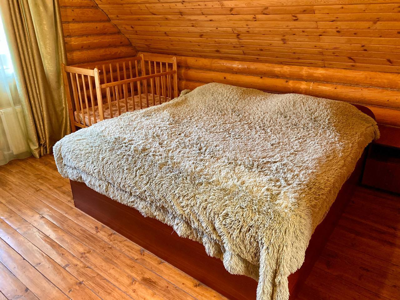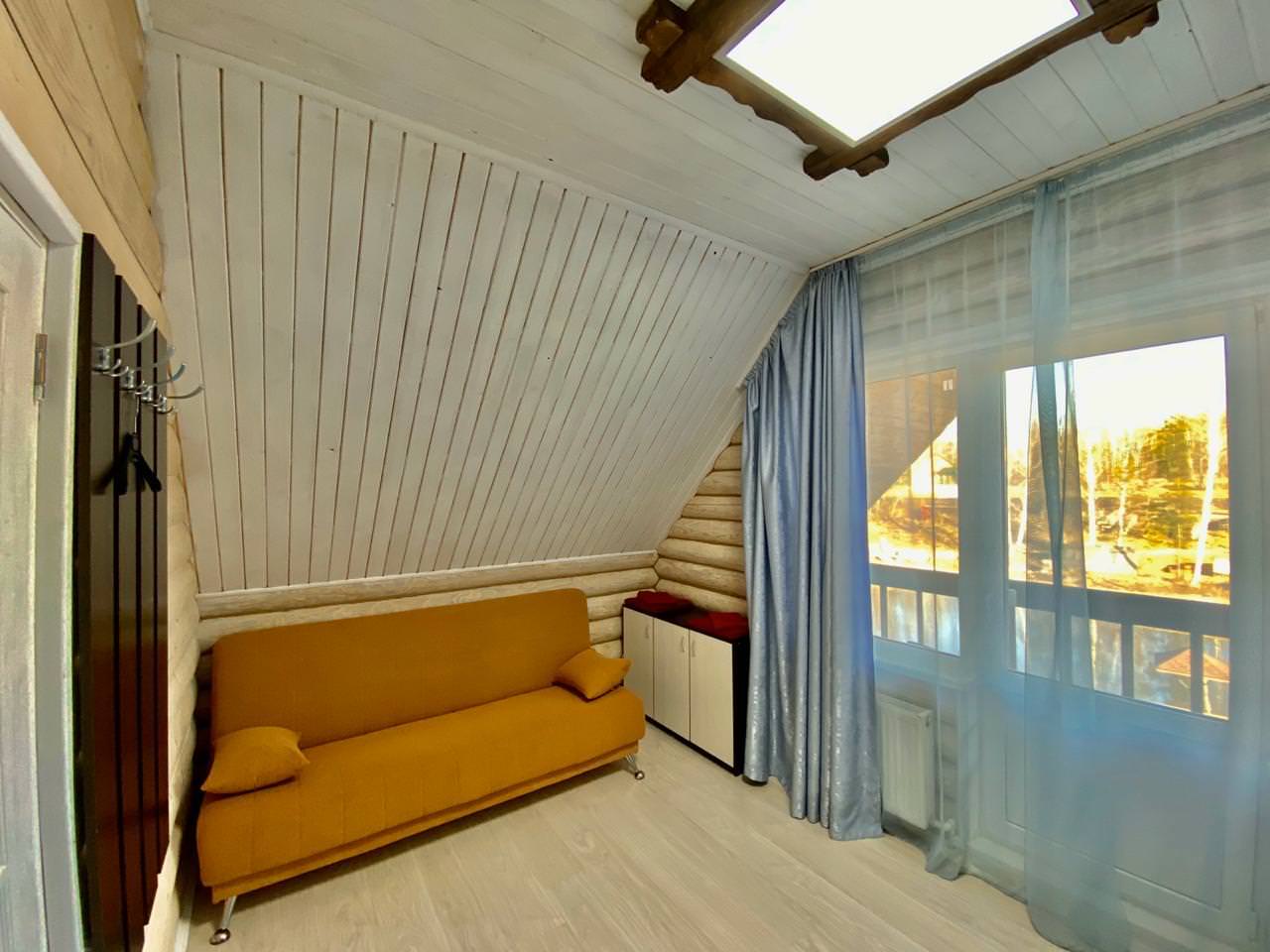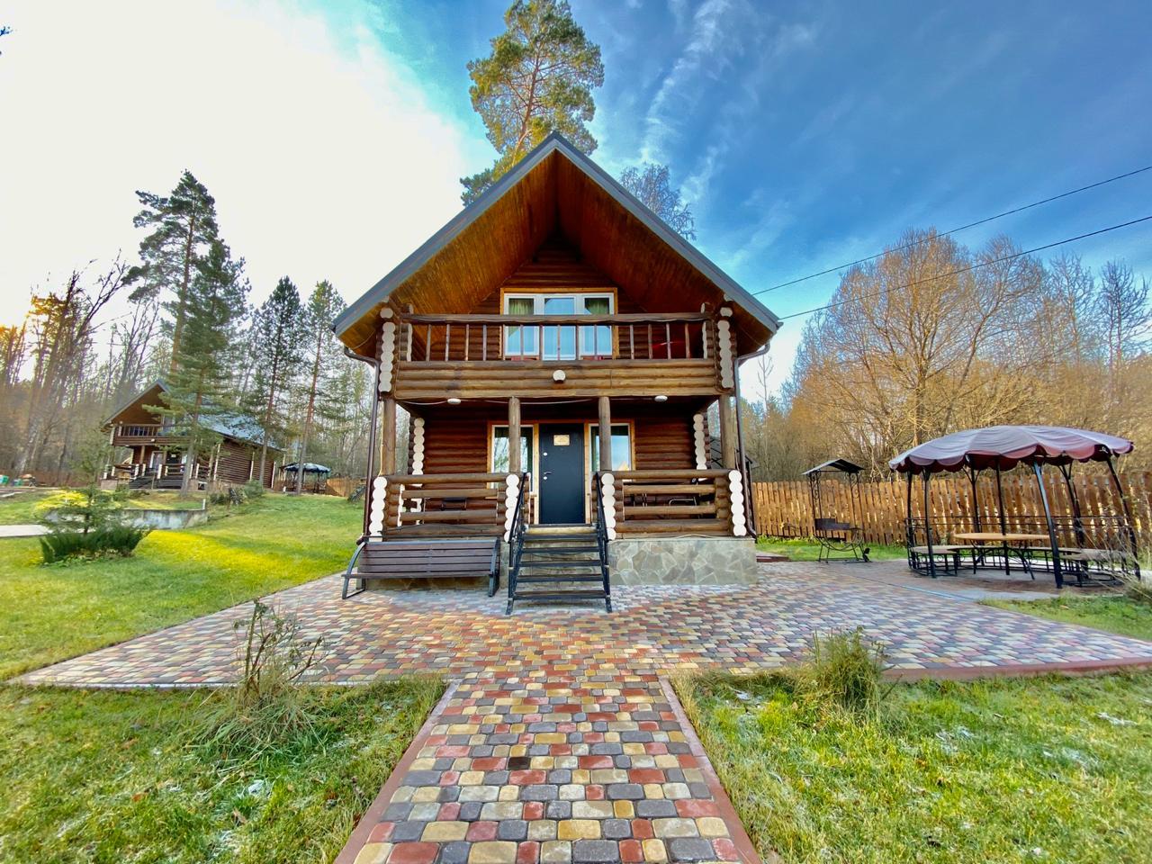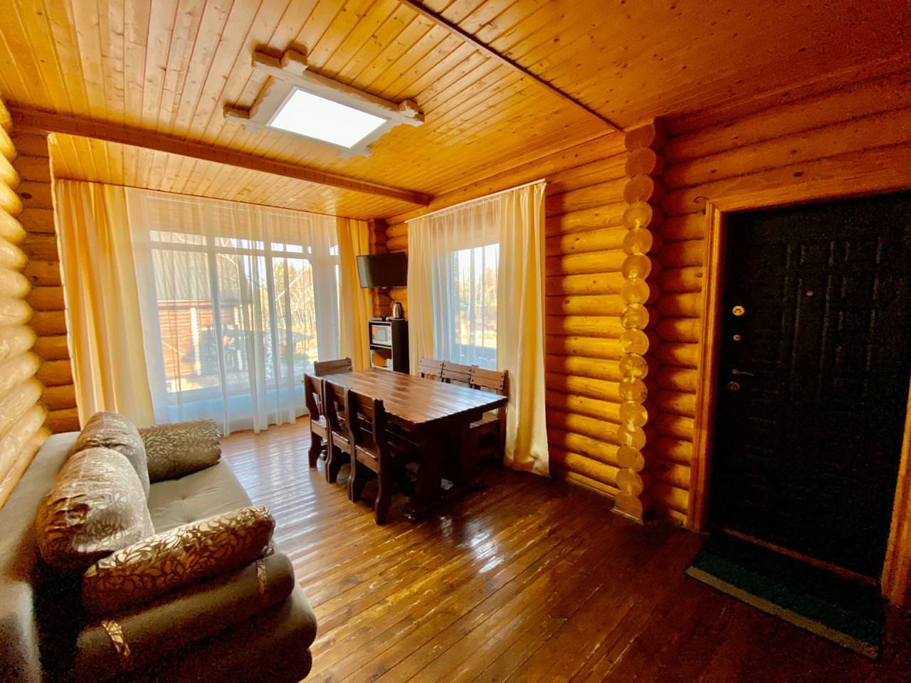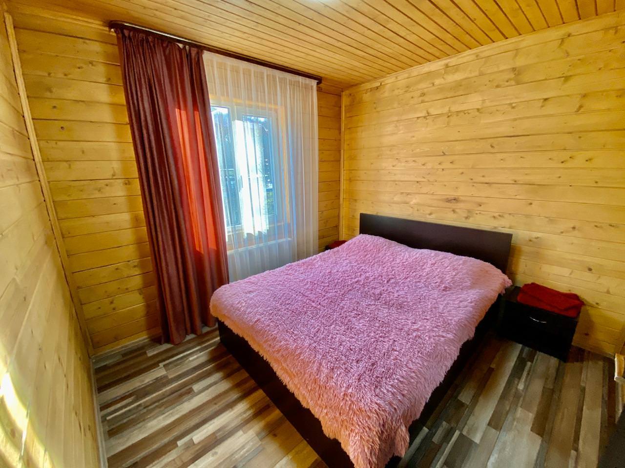 Отдельно стоящий сруб площадью 80 кв.м. На первом этаже: просторная гостиная с диваном и со спутниковым телевидением, санузел с душевой кабиной. На втором этаже: просторная комната с двуспальной кроватью, детская кровать, диван, санузел с душевой кабиной. Дополнительным: холодильник, СВЧ печь, электрический чайник, столовый набор на 6 персон, полотенце и вспомогательная посуда, комод, прикроватные тумбы, балкон. В доме может проживать 6 человек.