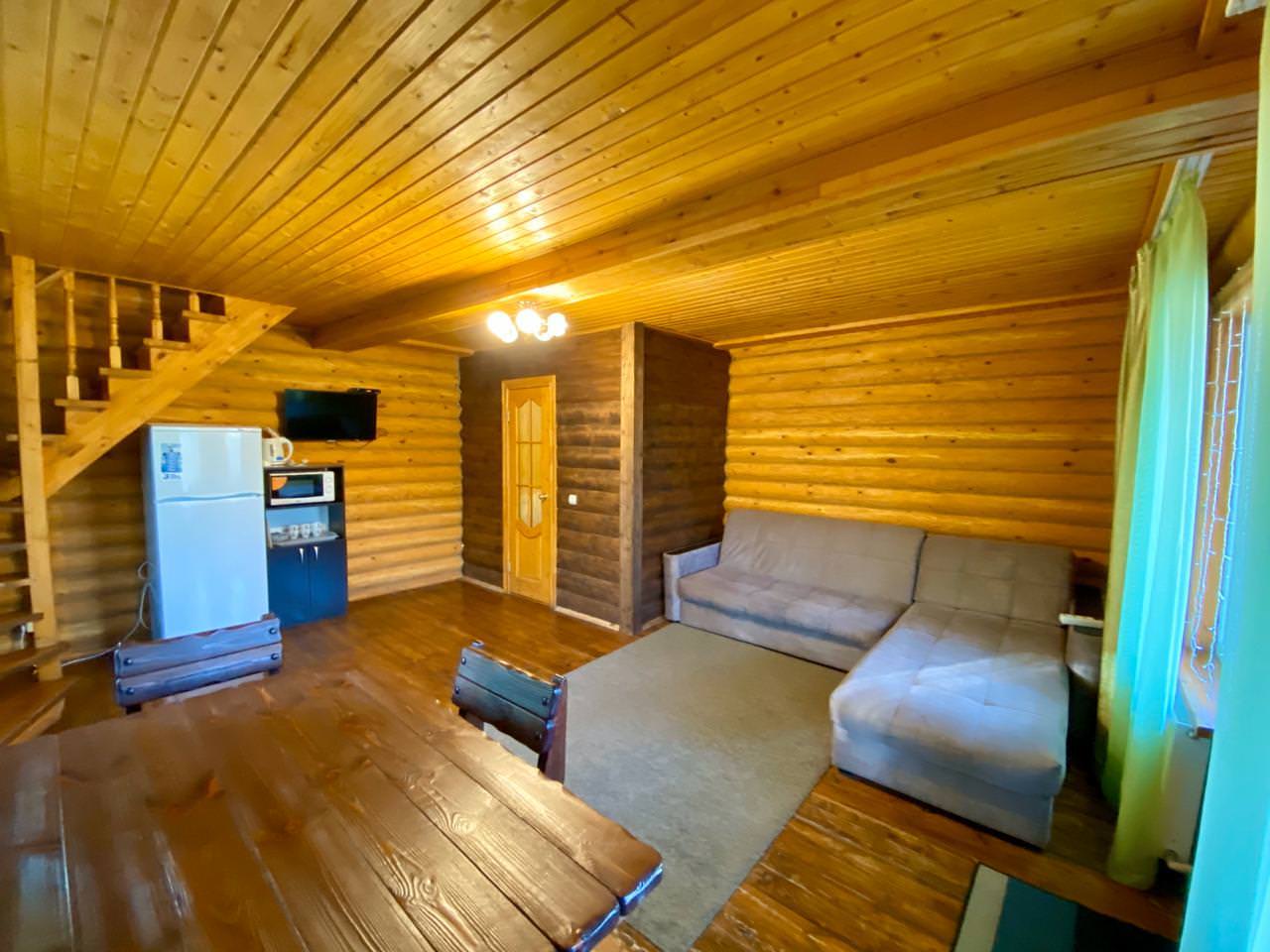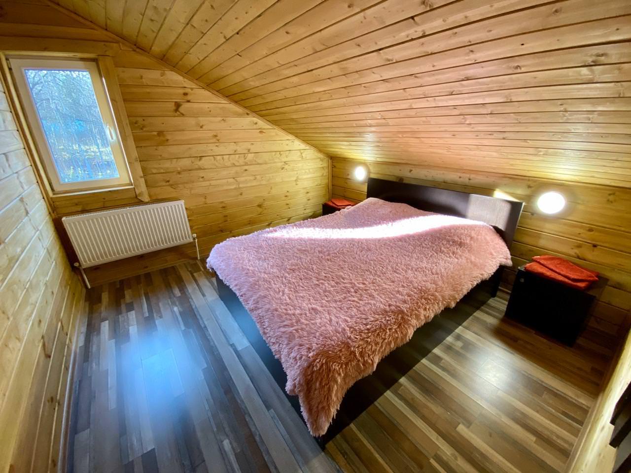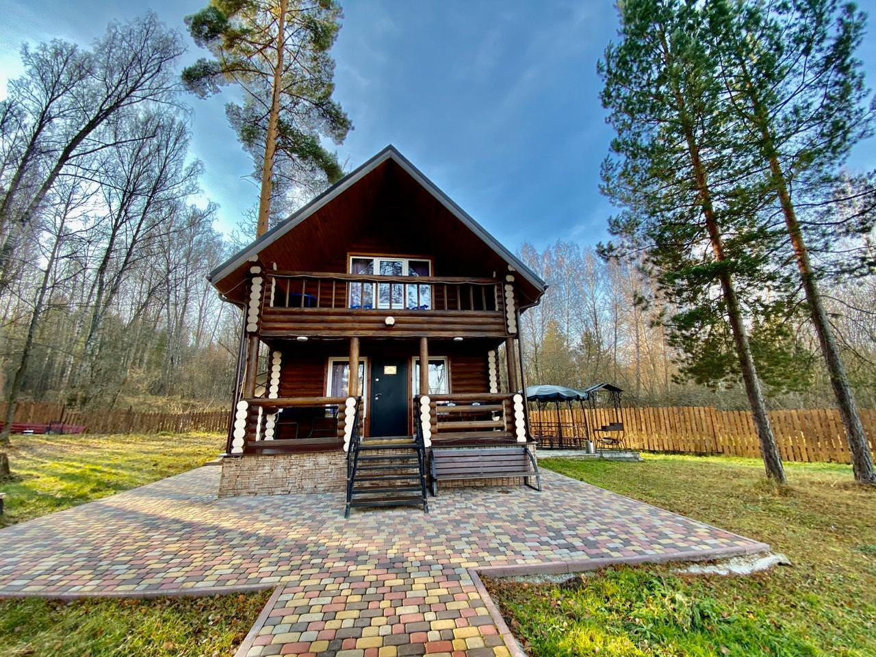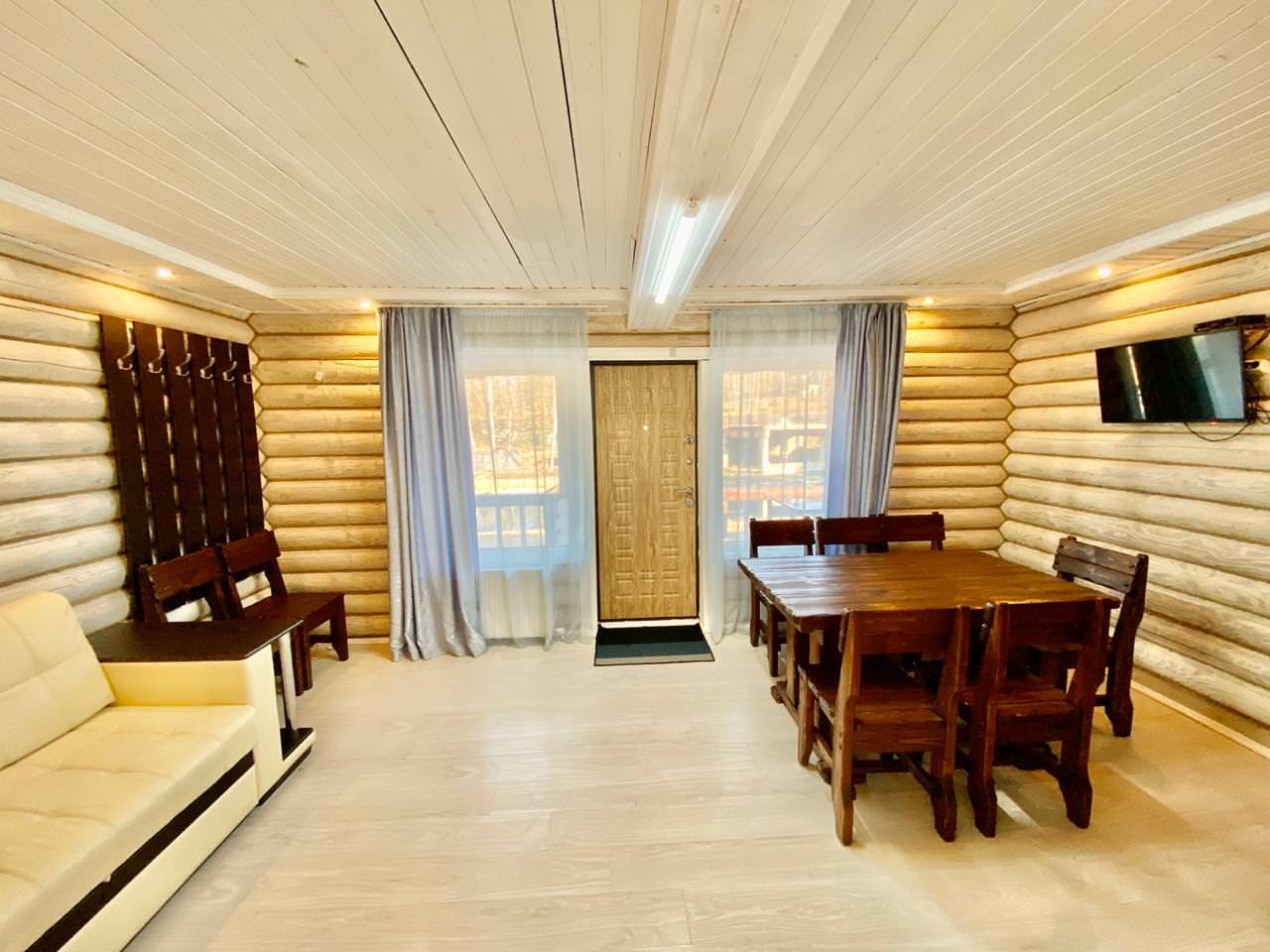 Отдельно стоящий сруб площадью 80 кв.м. На первом этаже: просторная гостиная с диваном и со спутниковым телевидением, санузел с душевой кабиной. На втором этаже: просторная комната с двуспальной кроватью, детская кровать, диван, санузел с душевой кабиной. Дополнительным: холодильник, СВЧ печь, электрический чайник, столовый набор на 6 персон, полотенце и вспомогательная посуда, комод, прикроватные тумбы, балкон. В доме может проживать 6 человек.