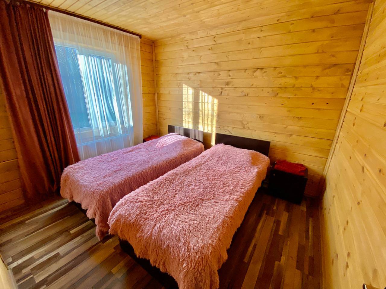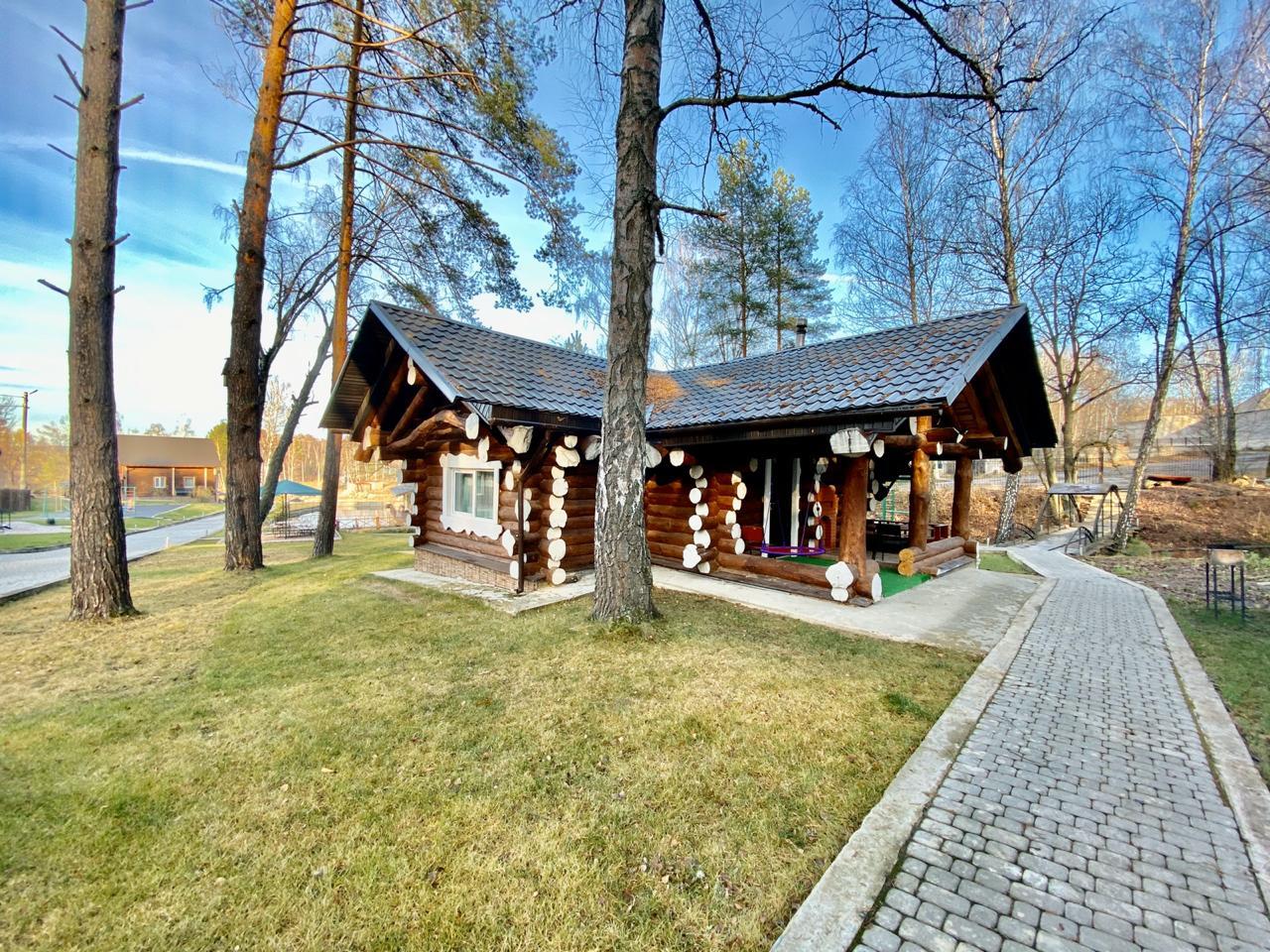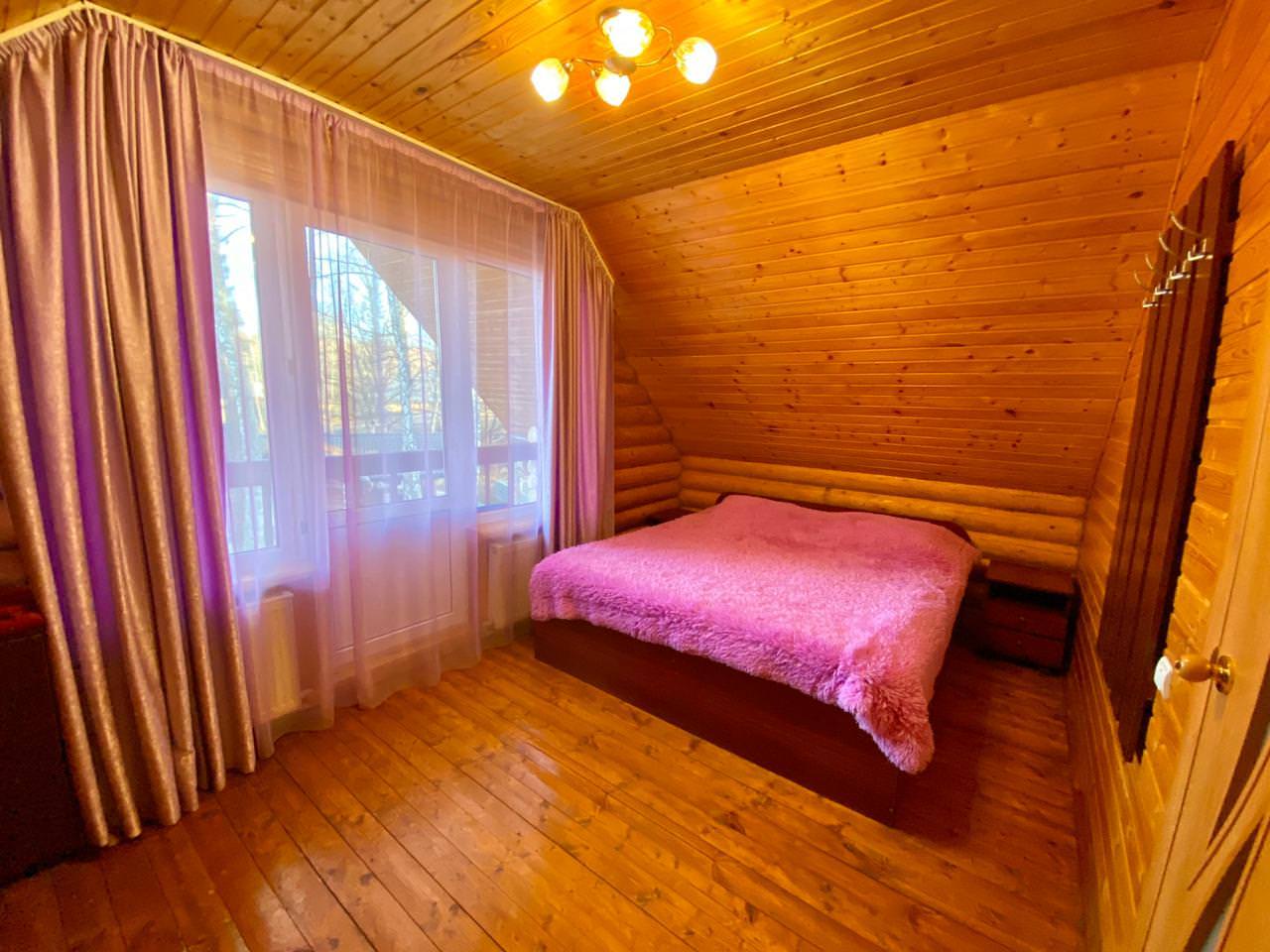 Отдельно стоящий сруб площадью 250 кв.м. На первом этаже: гостиная с диваном и со спутниковым телевидением, санузел с душевой кабиной, две комнаты, одна комната с двуспальной кроватью и детской кроватью, во второй комнате две односпальные кровати. На втором этаже: холл с диваном и со спутниковым телевидением, санузел с душевой кабиной, две комнаты с двуспальными кроватями, и одна комната с двумя односпальными кроватями. Дополнительным: холодильник, СВЧ печь, электрический чайник, столовый набор на 14 персон, полотенце и вспомогательная посуда, комод, прикроватные тумбы, балкон. В доме может проживать 14 человек.