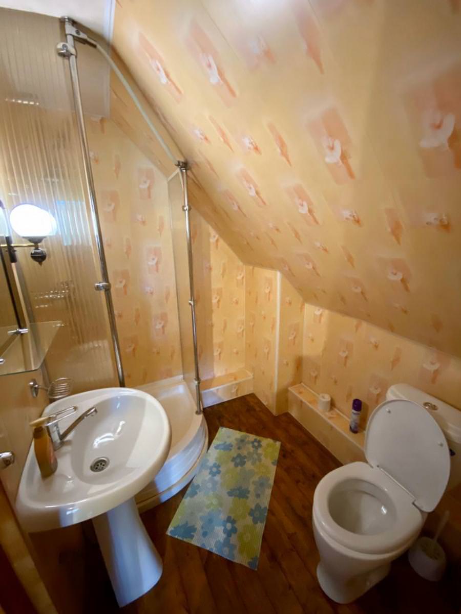 Отдельно стоящий сруб площадью 80 кв.м. На первом этаже: просторная гостиная с диваном и со спутниковым телевидением, санузел с душевой кабиной. На втором этаже: просторная комната с двуспальной кроватью, детская кровать, диван, санузел с душевой кабиной. Дополнительным: холодильник, СВЧ печь, электрический чайник, столовый набор на 6 персон, полотенце и вспомогательная посуда, комод, прикроватные тумбы, балкон. В доме может проживать 6 человек.