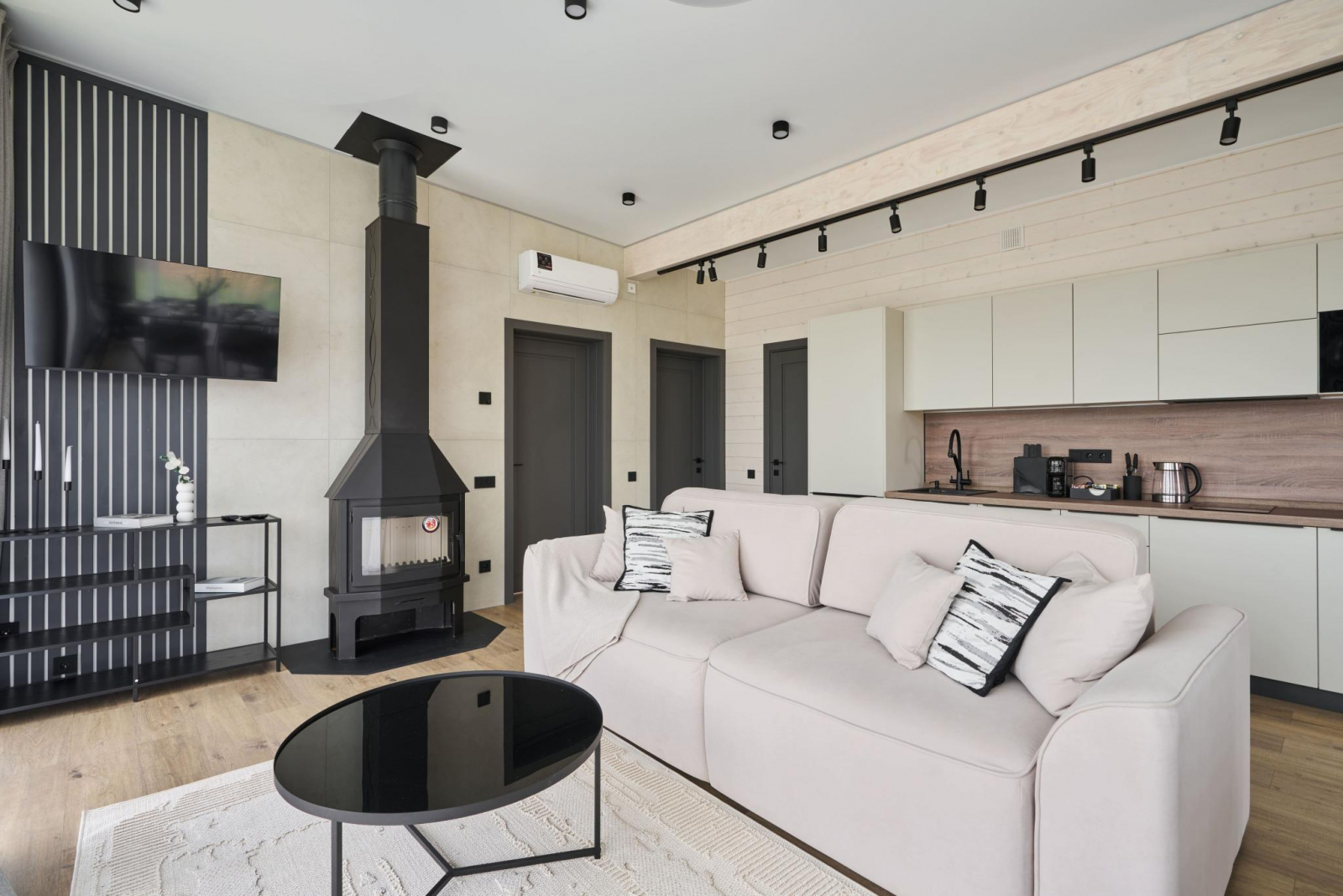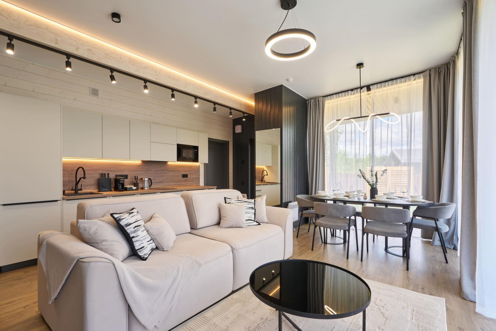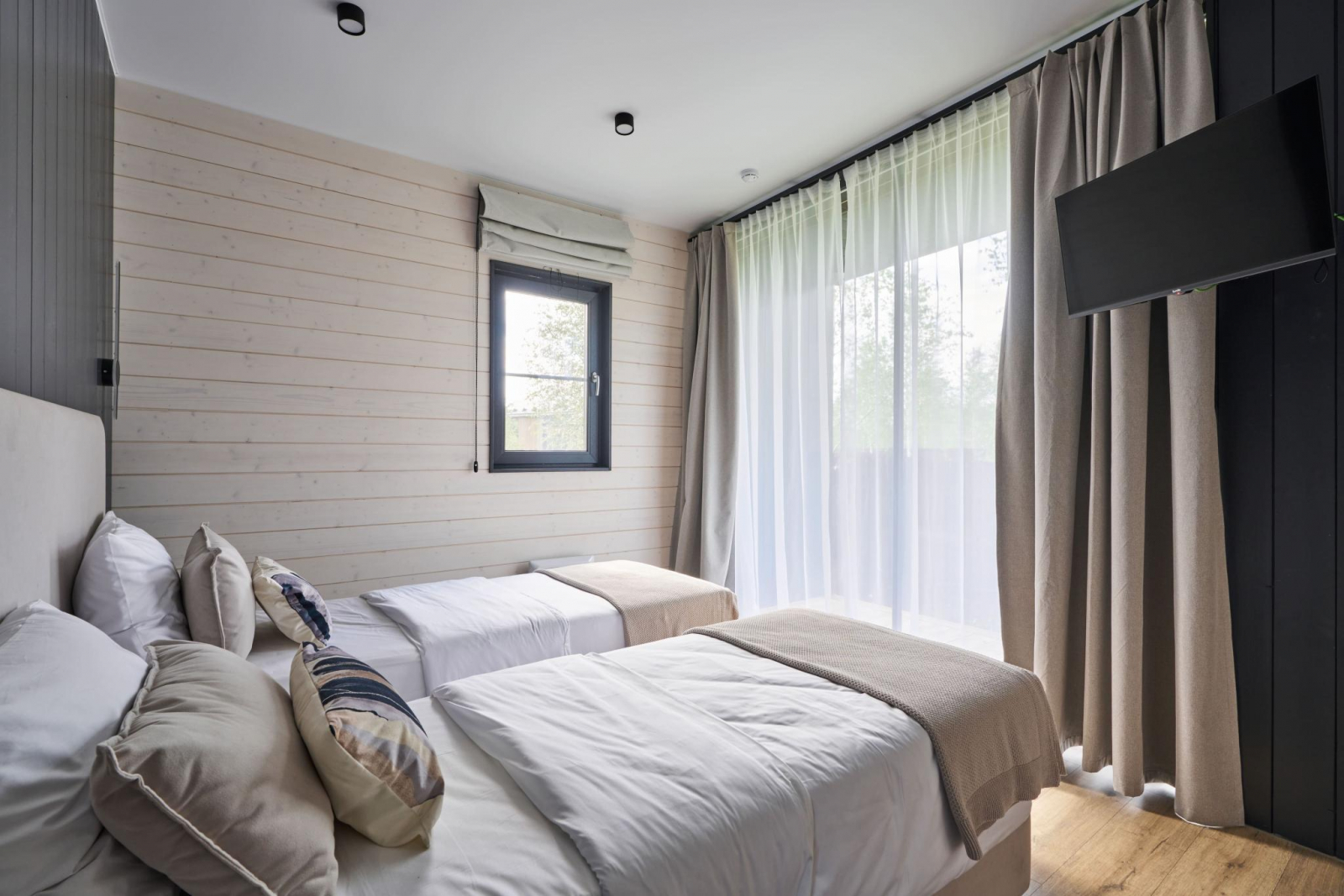 Внутри коттеджа: 3 отдельные спальни (односпальные кровати можно объединить). Просторная гостиная с мягкой мебелью. Камин, который создаёт особую атмосферу уюта. Полностью оборудованная кухня. Санузел с душем. Сауна в доме. Кондиционер. Вся необходимая техника, посуда, текстиль и мыльные принадлежности.