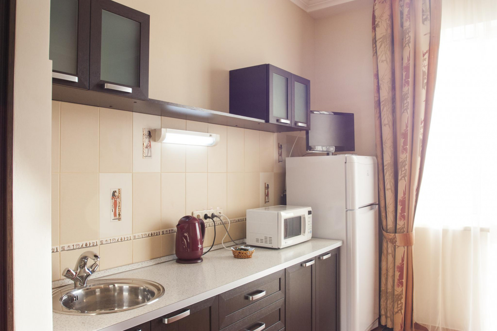 Комфортабельный номер с удобной прихожей, кухней-гостинной и уютной спальней. Номер оборудован электронной системой доступа, сейфом. В спальной комнате расположена одна большая или две раздельные кровати, есть телефон, платяной шкаф, рабочее место, телевизор, кабель доступа к интернету. Прихожая оборудована шкафом-купе для верхней одежды. В кухне-гостиной расположен удобный мягкий диван, обеденный стол, холодильник, СВЧ, электрический чайник, набор необходимой посуды. Санузел: ванна или душевая кабина, фен, индивидуальный набор туалетных принадлежностей. Также в наличии махровый халат, тапочки.