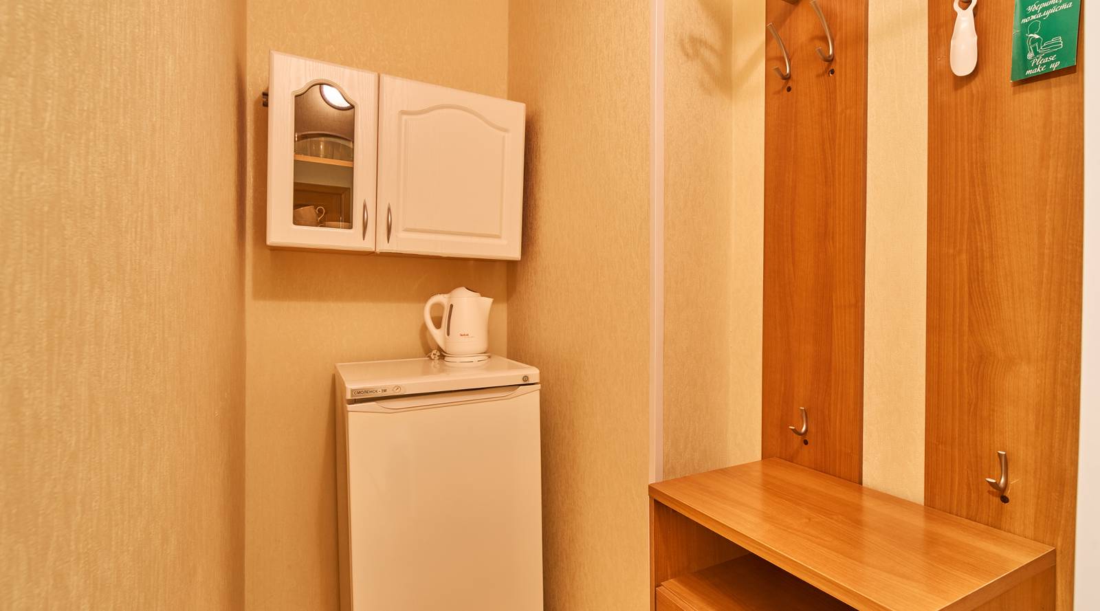 Номер повышенной комфортности. Кровать с ортопедическим матрасом. К услугам гостей халаты, тапочки, пользование микроволновой печью. Чай, кофе, бутилированная вода в номере. Комплимент от отеля гостю при заселении.