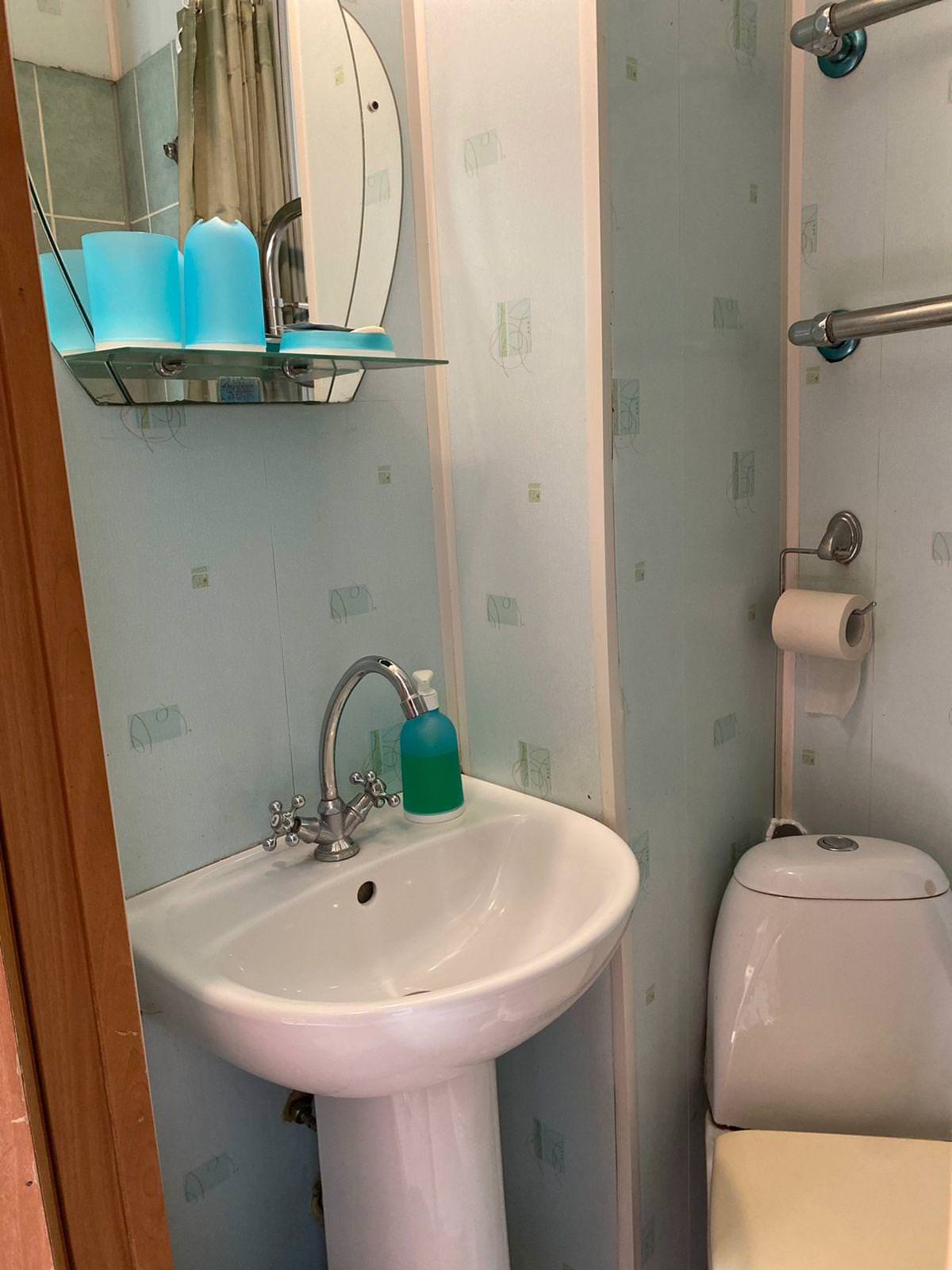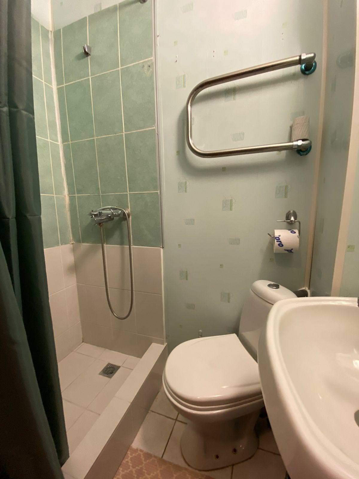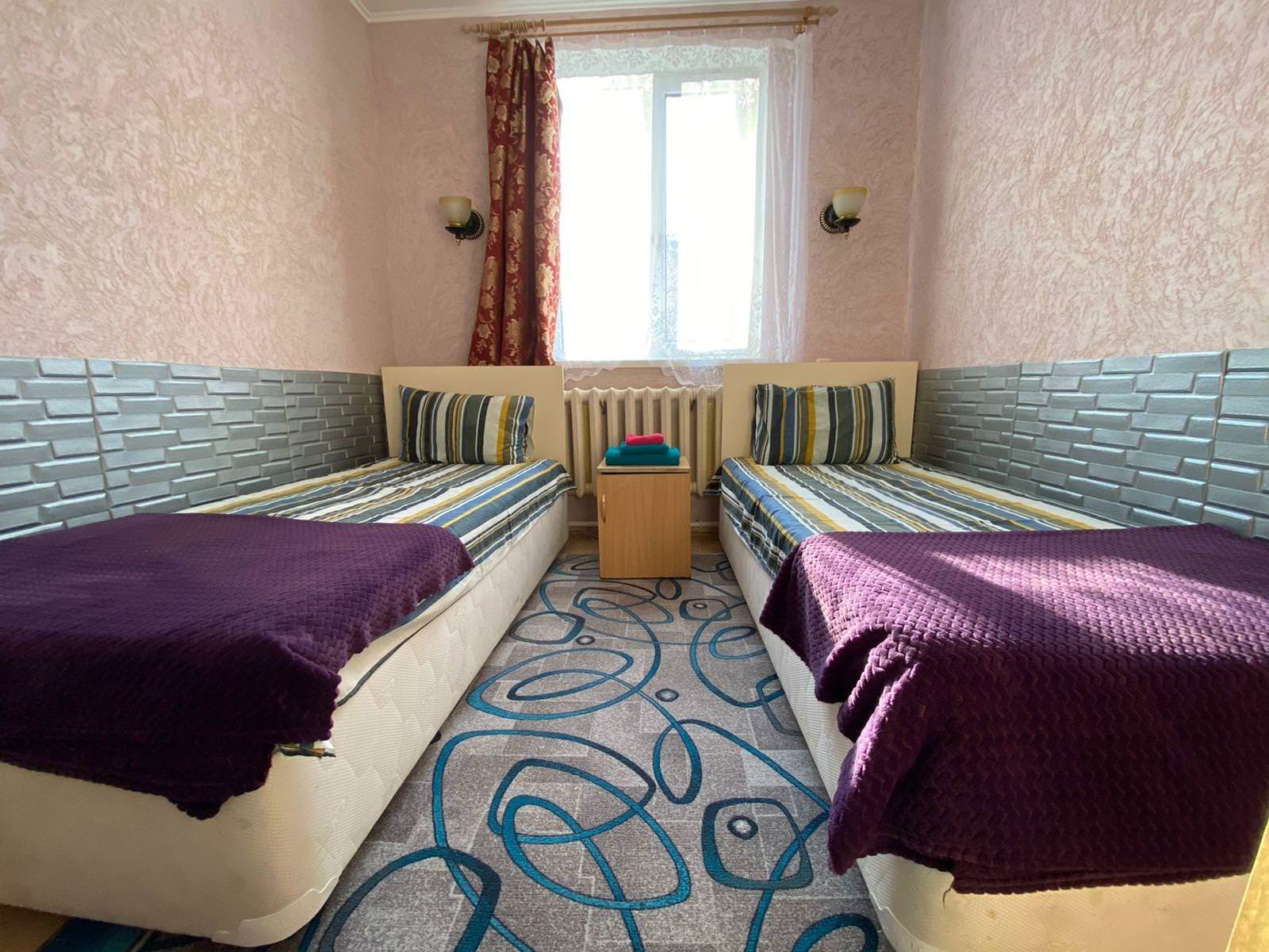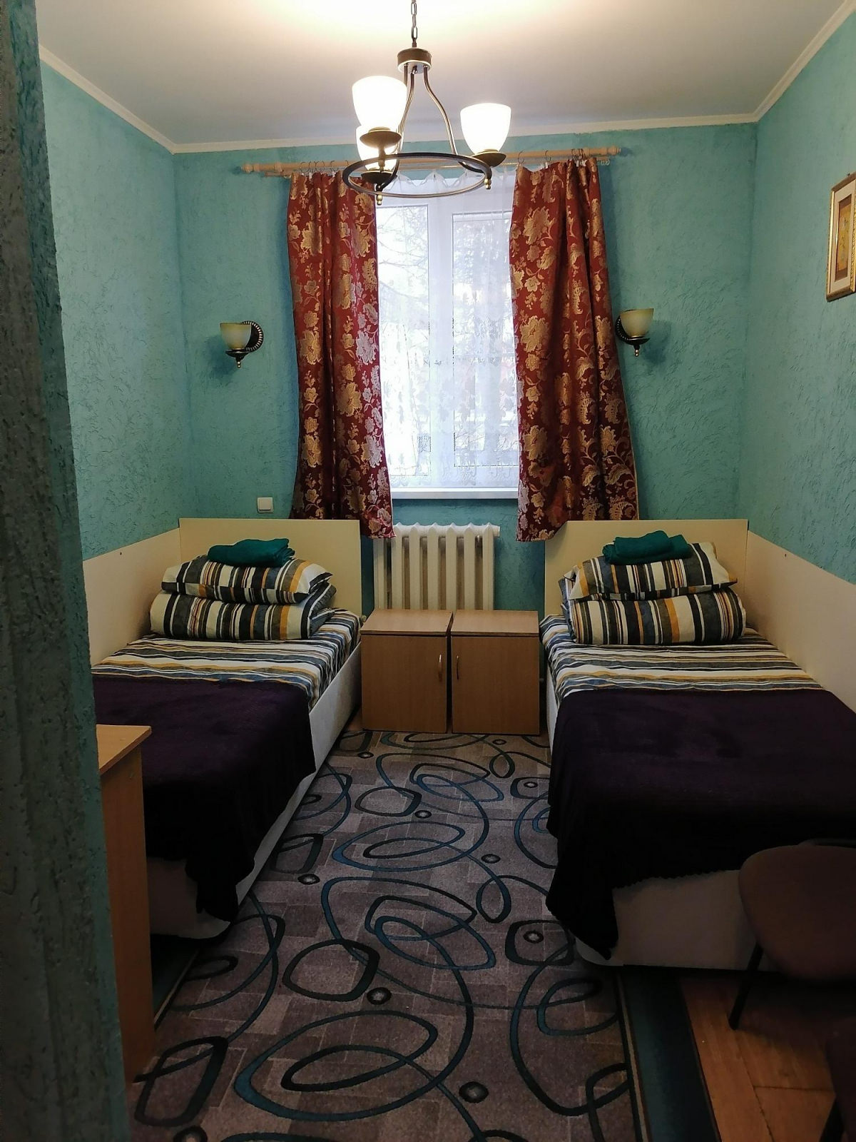 Уютный и теплый номер с двумя односпальными кроватями, телевизором, столом, стулом, шкафом, душем, туалетом, раковиной.