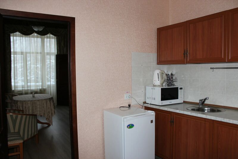 Площадь номера - 45 кв.м.; В номере: Холодильник, Телевизор, Кухня, Балкон, Набор косметики (туалетные принадлежности), Набор для приготовления чая/кофе, Мягкая мебель, Ванна, Двуспальная кровать, Туалет в номере, Тумбочка, Чайник, Набор посуды, Микроволновая печь, Кресло; Макс. кол-во гостей - 2