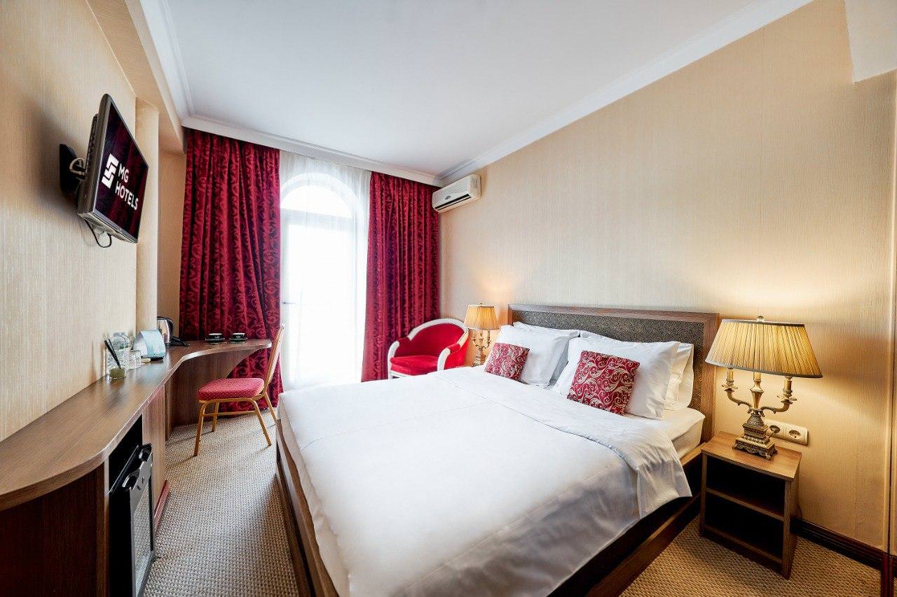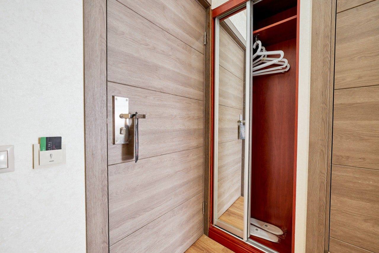 Путешествуете вдвоем? Один из лучших вариантов размещения — комфортный двухместный номер категории «улучшенный». В компактном номере нашлось место не только для комфортной двуспальной кровати с ортопедическим матрасом, но и для полноценной рабочей зоны с удобным столом и высокоскоростным беспроводным интернетом. Дизайн прост и лаконичен, но благодаря ему небольшое по площади помещение выглядит просторным и светлым. Ценные вещи и документы можно оставить в сейфе. Номера укомплектованы мини-баром, чайной станцией, телефоном, феном, гладильными принадлежностями и халатами. Ежедневно при жилой уборке происходит пополнение гигиенических принадлежностей, питьевой воды, чая и сахара. Мини-бар не входит в стоимость номера и оплачивается отдельно. Под запрос предоставляются косметический и бритвенный наборы. Окна номера выходят на тихую улицу, внутренний двор и на город, так что можете быть уверены: вашему отдыху не помешает шум.