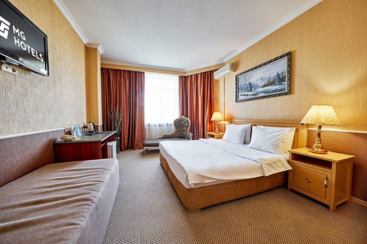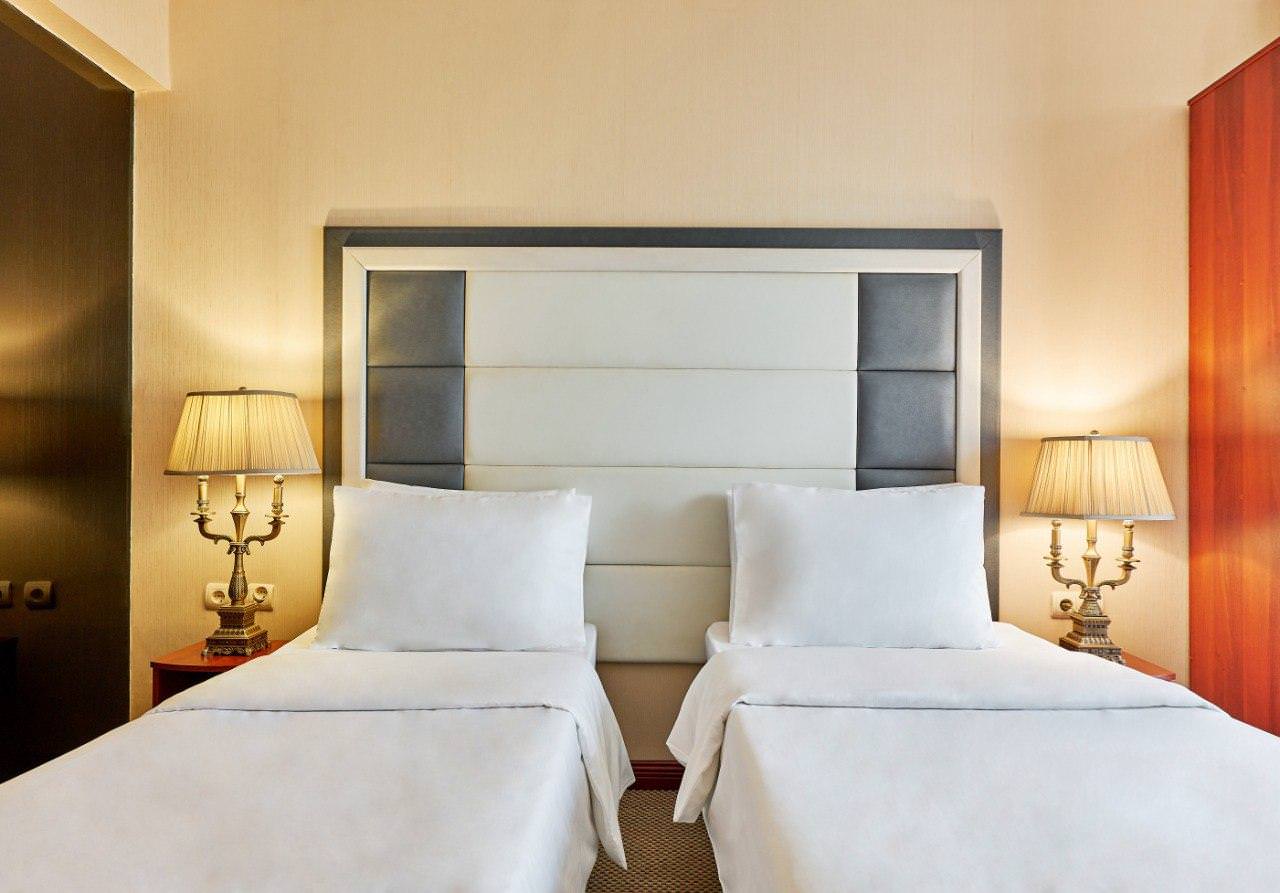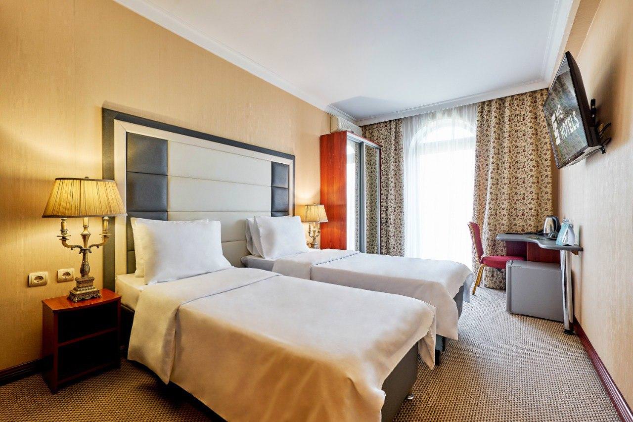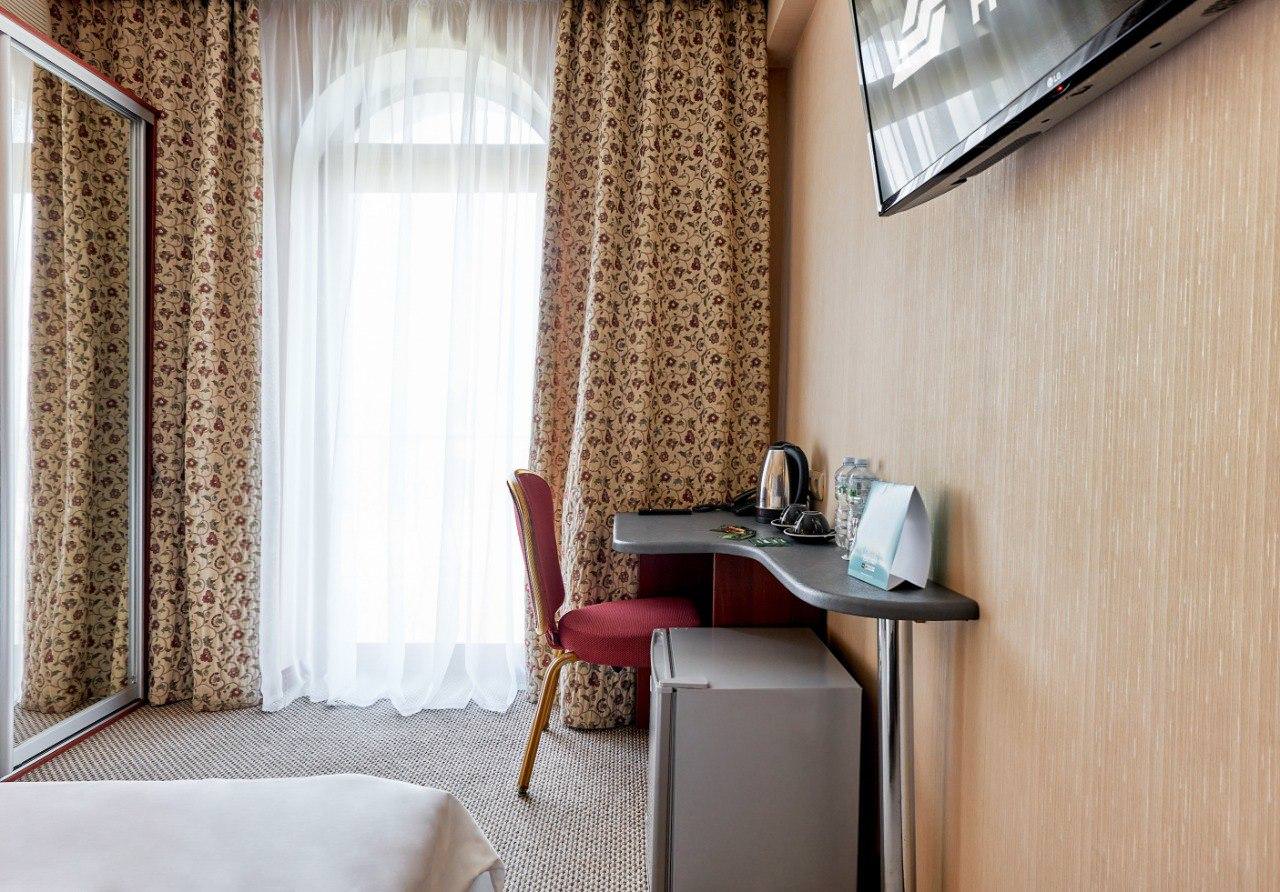 Двухместный номер категории «Стандарт» с одной двуспальной (160см*200см либо 180см*200см) или двумя раздельными кроватями (90см*200см либо 120см*200см) – прекрасный вариант для деловой поездки или отдыха пары. Небольшой, но очень комфортный номер отличается стильным интерьером в теплых тонах, которые лишь добавляют уюта, расслабляют и настраивают на отдых. Плазменная панель и доступ к интерактивному спутниковому телевидению разнообразят досуг. Если в поездке вам нужно поработать — в вашем распоряжении удобный рабочий стол и высокоскоростной беспроводной интернет. Ценные вещи и документы можно оставить в сейфе. Также номера укомплектованы мини-баром, чайной станцией, телефоном, феном, гладильными принадлежностями. Ежедневно при жилой уборке происходит пополнение гигиенических принадлежностей, питьевой воды, чая и сахара. Мини-бар не входит в стоимость номера и оплачивается отдельно. Под запрос предоставляются халаты, косметический и бритвенный наборы. Окна номера выходят на тихую улицу, внутренний двор и на город, так что можете быть уверены: вашему отдыху не помешает шум.