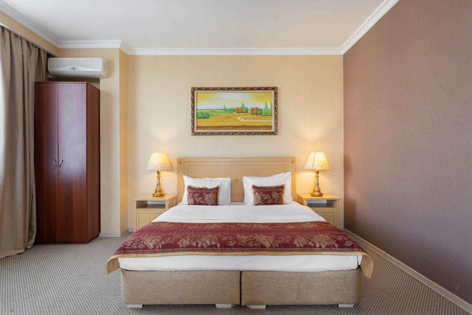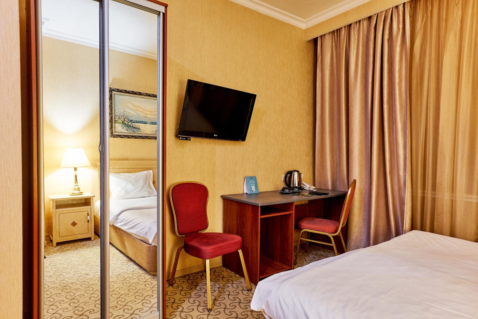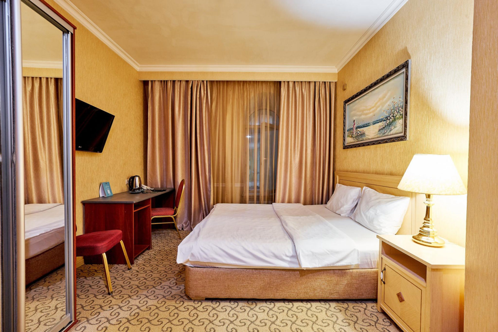 Двухместный номер категории «Стандарт» с одной двуспальной (160см*200см либо 180см*200см) или двумя раздельными кроватями (90см*200см либо 120см*200см) – прекрасный вариант для деловой поездки или отдыха пары. Небольшой, но очень комфортный номер отличается стильным интерьером в теплых тонах, которые лишь добавляют уюта, расслабляют и настраивают на отдых. Плазменная панель и доступ к интерактивному спутниковому телевидению разнообразят досуг. Если в поездке вам нужно поработать — в вашем распоряжении удобный рабочий стол и высокоскоростной беспроводной интернет. Ценные вещи и документы можно оставить в сейфе. Также номера укомплектованы мини-баром, чайной станцией, телефоном, феном, гладильными принадлежностями. Ежедневно при жилой уборке происходит пополнение гигиенических принадлежностей, питьевой воды, чая и сахара. Мини-бар не входит в стоимость номера и оплачивается отдельно. Под запрос предоставляются халаты, косметический и бритвенный наборы. Окна номера выходят на тихую улицу, внутренний двор и на город, так что можете быть уверены: вашему отдыху не помешает шум.