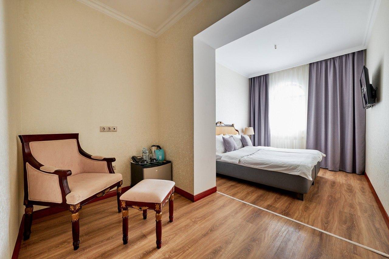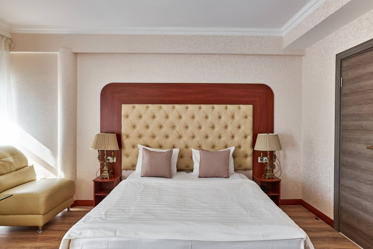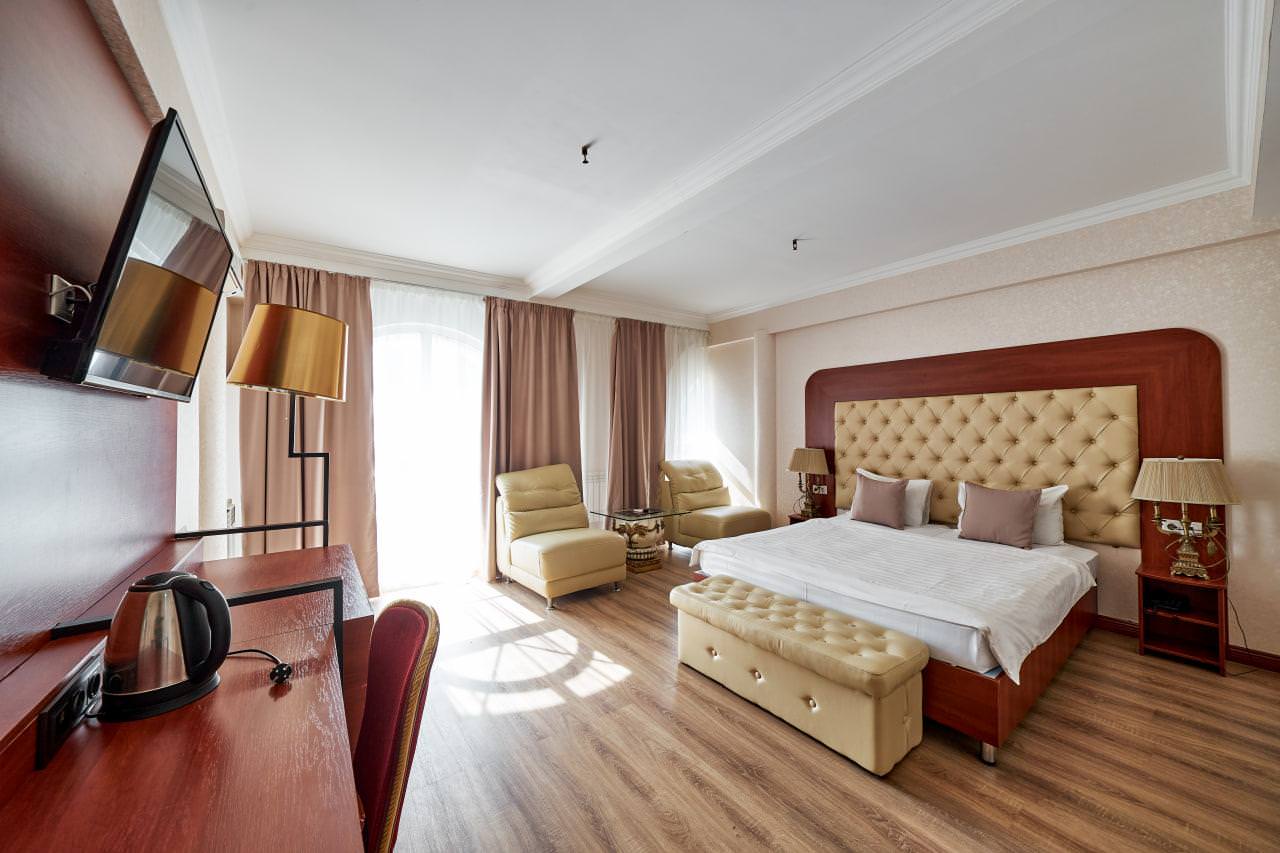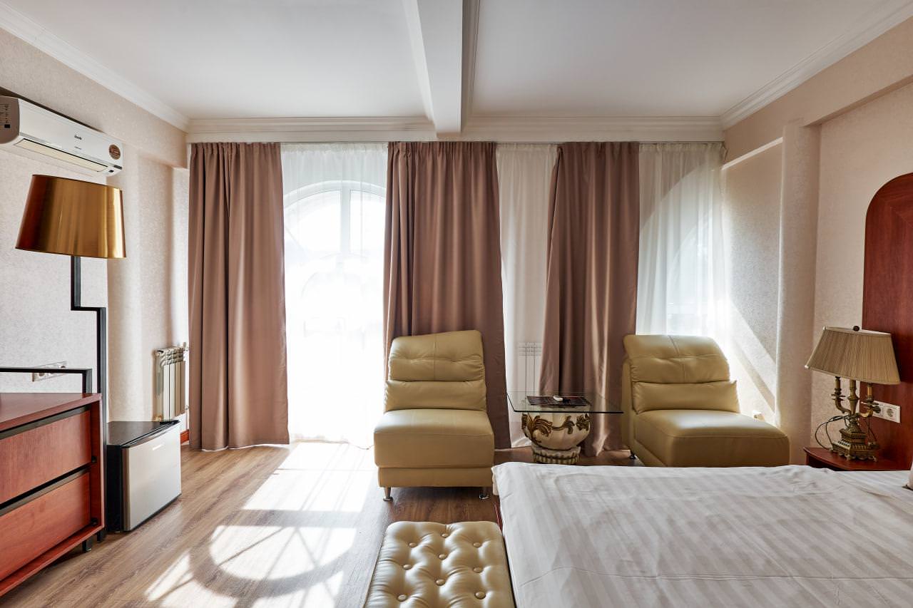 Шикарный номер категории «Люкс» – оптимальный выбор для солидного человека, влюбленной пары, молодоженов. Просторный и комфортный, с тщательно продуманным интерьером — здесь есть все, что может понадобиться вам во время отдыха. Интерьер выдержан в приятной теплой гамме, которая располагает к спокойному отдыху после насыщенного дня. Широкая двухместная кровать размера «King Size» снабжена ортопедическим матрасом, который гарантирует великолепный сон, а современная система климат-контроля обеспечит оптимальную температуру и максимальный уют в номере. В номере есть удобный письменный стол и высокоскоростной Wi-Fi, а также индивидуальный сейф для ценных вещей и документов. Номера укомплектованы мини-баром, чайной станцией, телефоном, феном, гладильными принадлежностями и халатами. Ежедневно при жилой уборке происходит пополнение гигиенических принадлежностей, питьевой воды, чая и сахара. Мини-бар не входит в стоимость номера и оплачивается отдельно. Под запрос предоставляются косметический и бритвенный наборы. Окна номера выходят на тихую улицу, внутренний двор и на город, так что можете быть уверены: вашему отдыху не помешает шум.