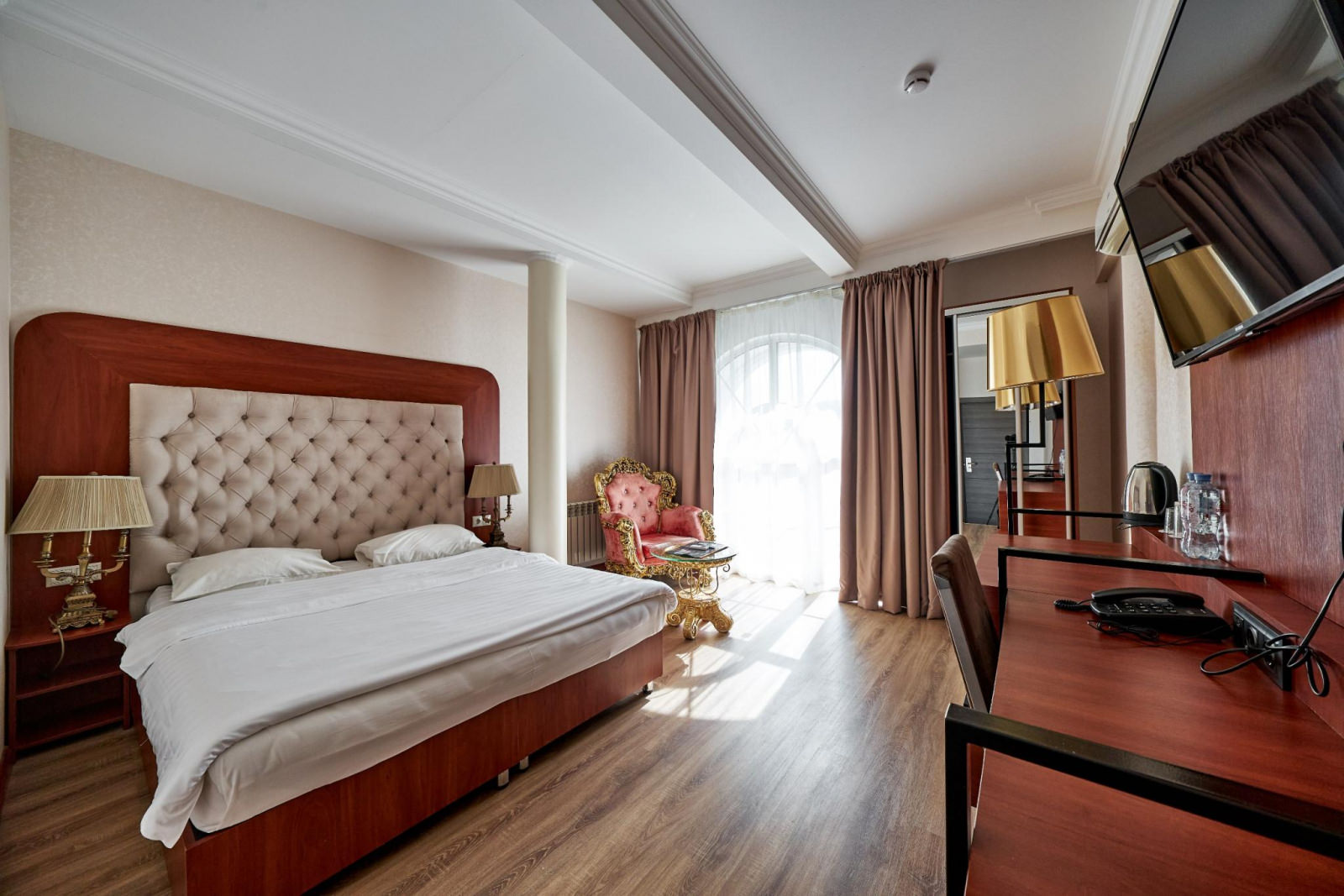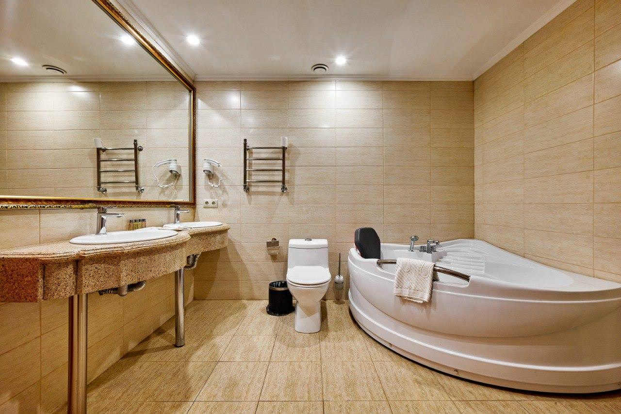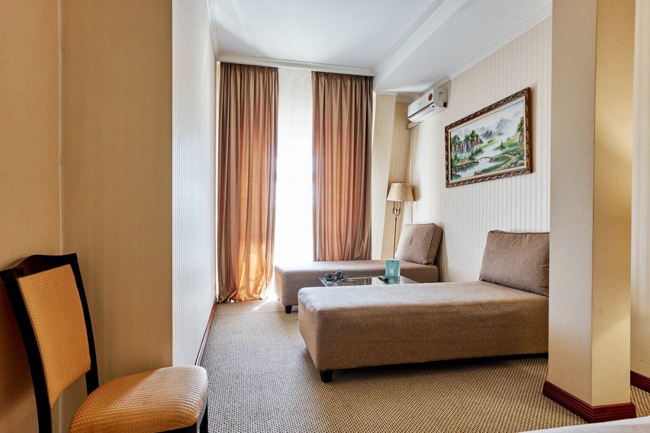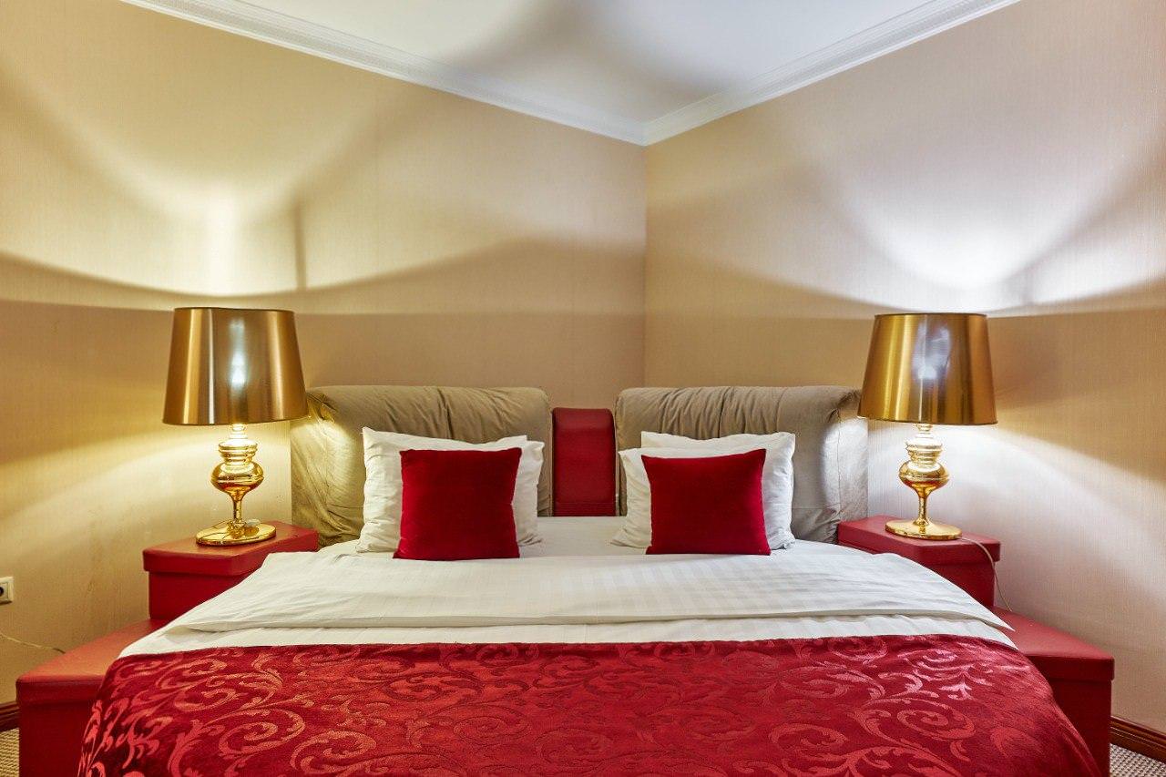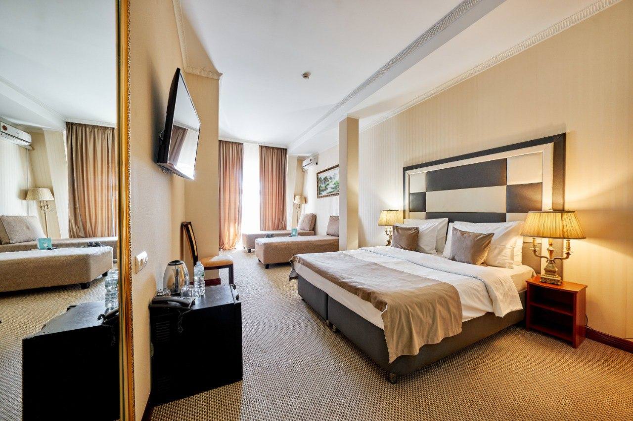 Шикарный номер категории «Люкс» – оптимальный выбор для солидного человека, влюбленной пары, молодоженов. Просторный и комфортный, с тщательно продуманным интерьером — здесь есть все, что может понадобиться вам во время отдыха. Интерьер выдержан в приятной теплой гамме, которая располагает к спокойному отдыху после насыщенного дня. Широкая двухместная кровать размера «King Size» снабжена ортопедическим матрасом, который гарантирует великолепный сон, а современная система климат-контроля обеспечит оптимальную температуру и максимальный уют в номере. В номере есть удобный письменный стол и высокоскоростной Wi-Fi, а также индивидуальный сейф для ценных вещей и документов. Номера укомплектованы мини-баром, чайной станцией, телефоном, феном, гладильными принадлежностями и халатами. Ежедневно при жилой уборке происходит пополнение гигиенических принадлежностей, питьевой воды, чая и сахара. Мини-бар не входит в стоимость номера и оплачивается отдельно. Под запрос предоставляются косметический и бритвенный наборы. Окна номера выходят на тихую улицу, внутренний двор и на город, так что можете быть уверены: вашему отдыху не помешает шум.