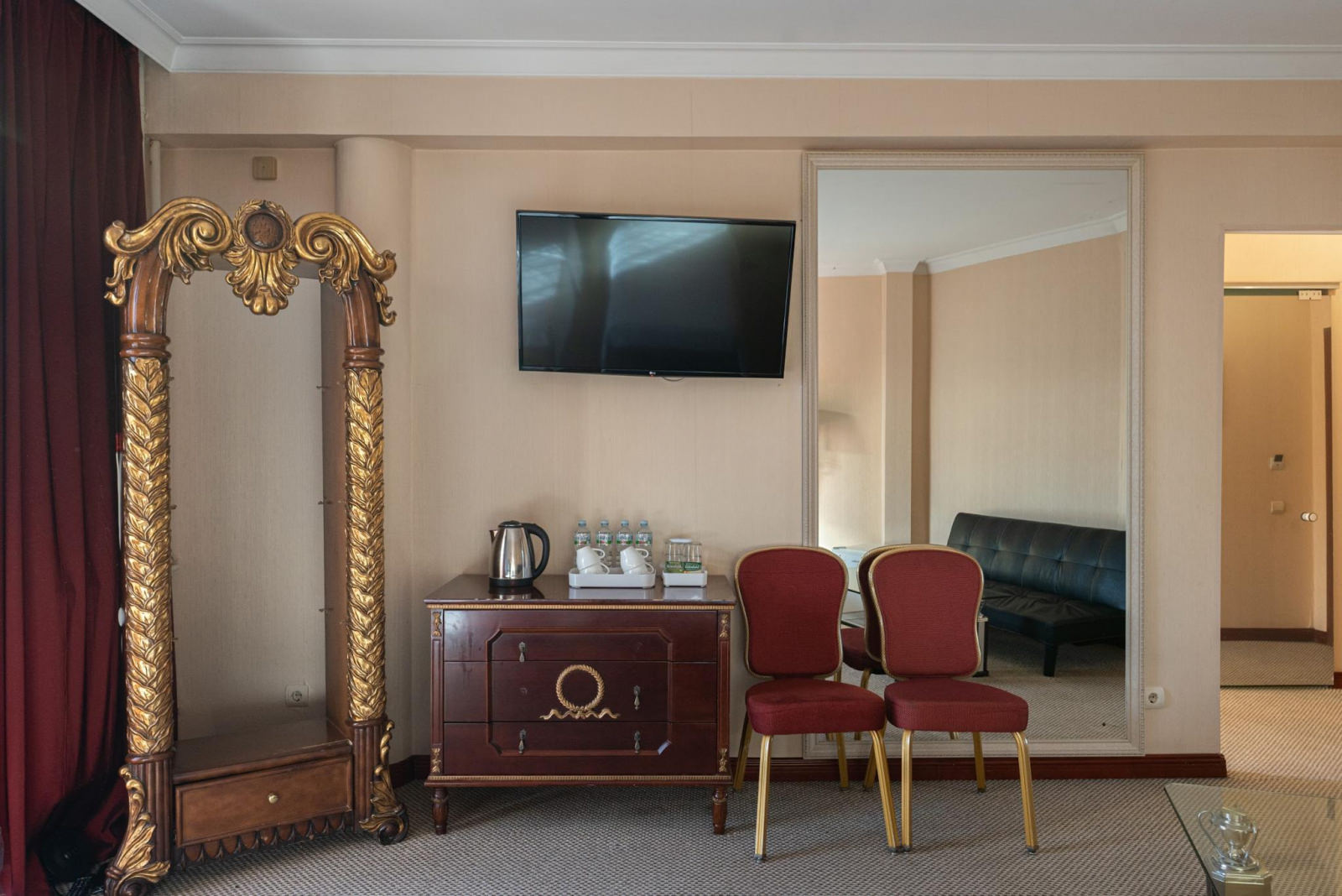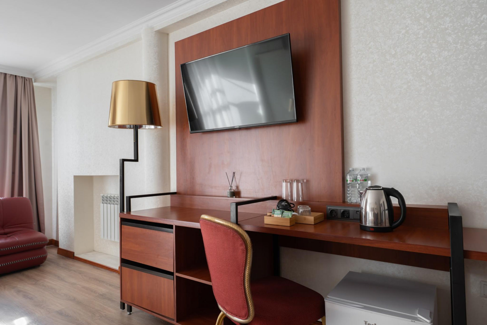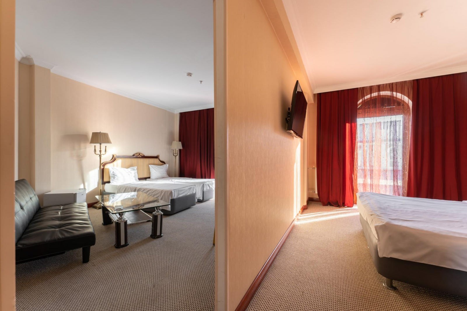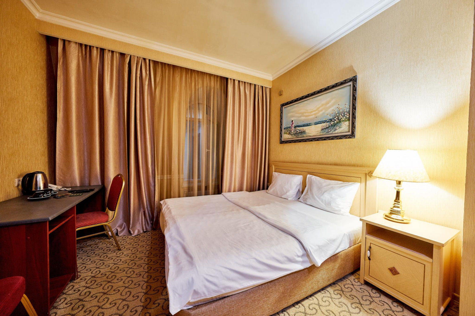 Шикарный номер категории «Люкс» – оптимальный выбор для солидного человека, влюбленной пары, молодоженов. Просторный и комфортный, с тщательно продуманным интерьером — здесь есть все, что может понадобиться вам во время отдыха. Интерьер выдержан в приятной теплой гамме, которая располагает к спокойному отдыху после насыщенного дня. Широкая двухместная кровать размера «King Size» снабжена ортопедическим матрасом, который гарантирует великолепный сон, а современная система климат-контроля обеспечит оптимальную температуру и максимальный уют в номере. В номере есть удобный письменный стол и высокоскоростной Wi-Fi, а также индивидуальный сейф для ценных вещей и документов. Номера укомплектованы мини-баром, чайной станцией, телефоном, феном, гладильными принадлежностями и халатами. Ежедневно при жилой уборке происходит пополнение гигиенических принадлежностей, питьевой воды, чая и сахара. Мини-бар не входит в стоимость номера и оплачивается отдельно. Под запрос предоставляются косметический и бритвенный наборы. Окна номера выходят на тихую улицу, внутренний двор и на город, так что можете быть уверены: вашему отдыху не помешает шум.